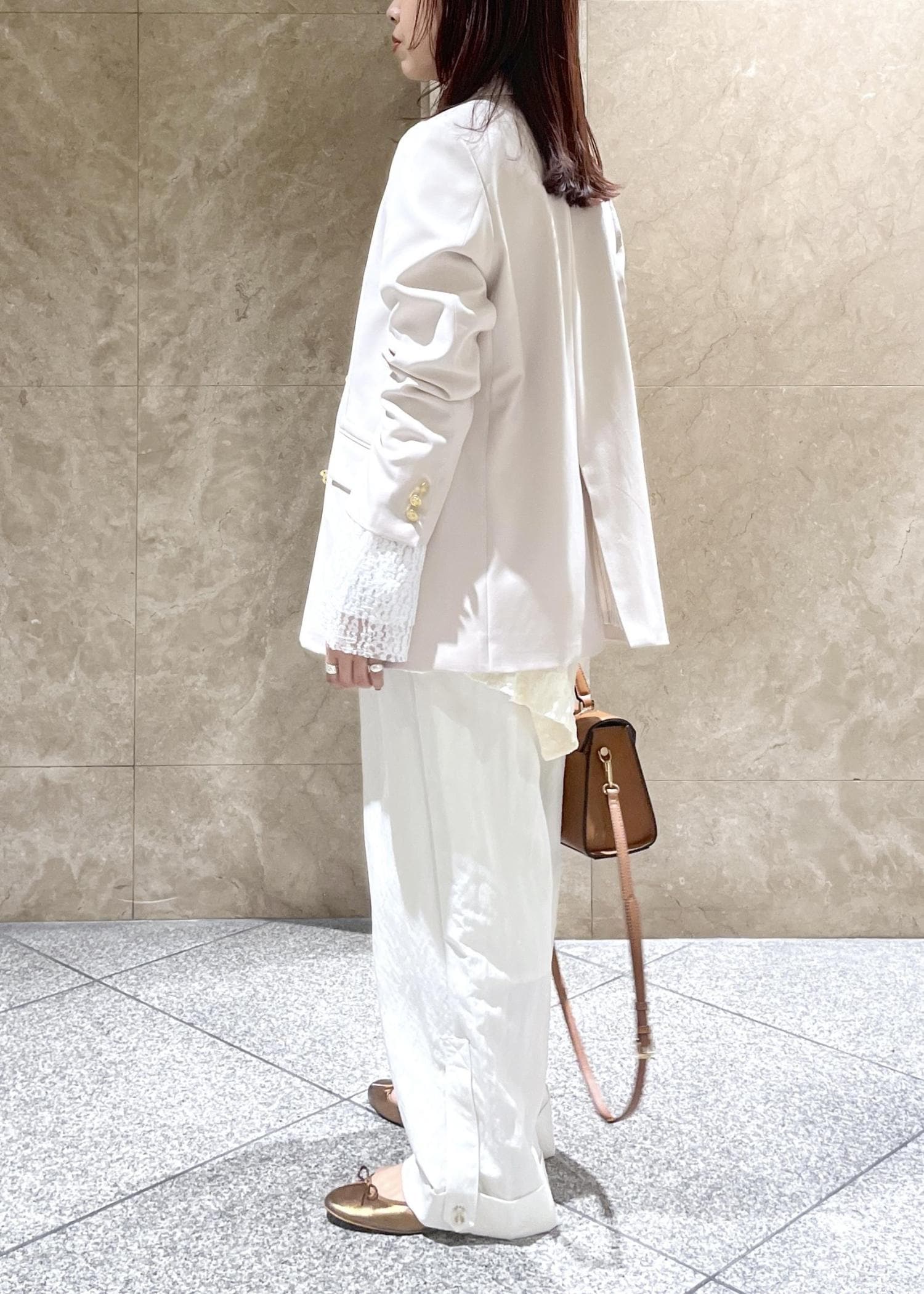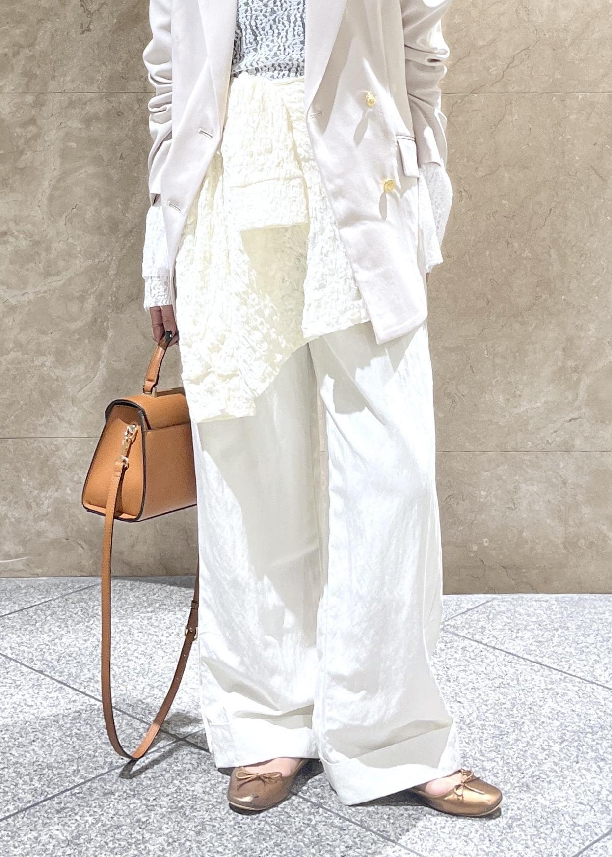 サラッと軽やかな素材感で、長いシーズン着用いただけそう!ツルンとほどよくツヤもあり綺麗見え。