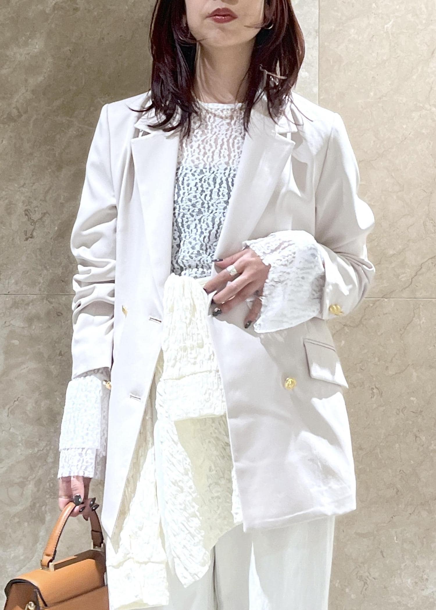 柔らかく繊細なレースがとっても女性らしい印象で、写真のコーディネートでは黒のインナーを着用しているため柄も分かりやすいかと思いますが、総柄で透け感もほどよく、レース、フリルといっても意外に甘すぎる感じもなく◎