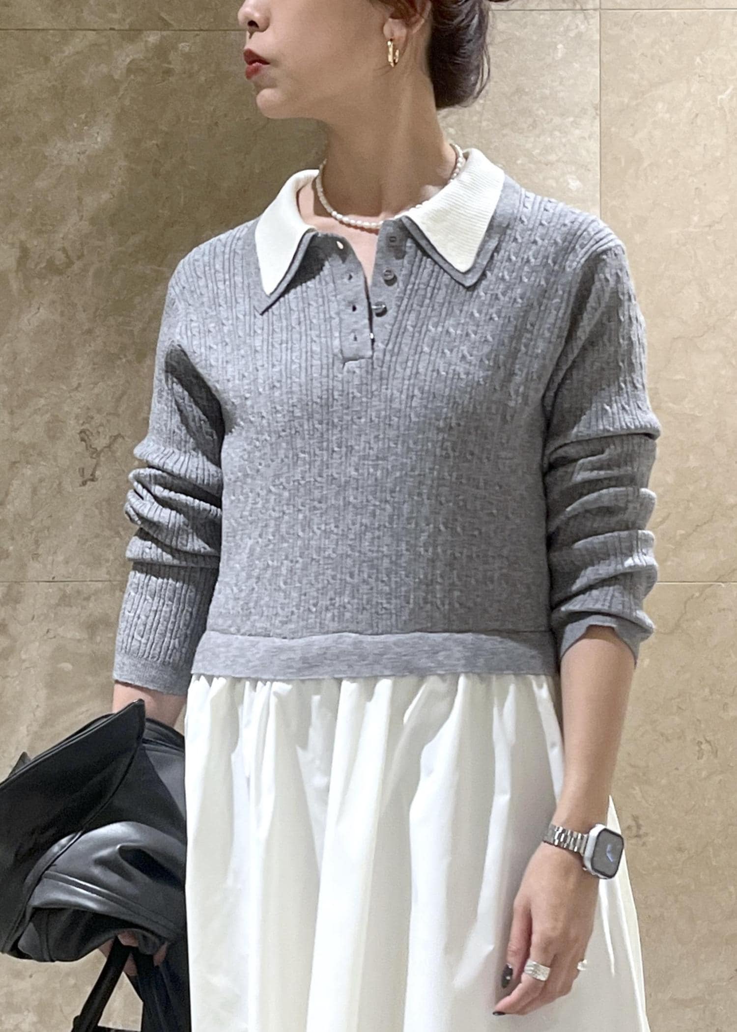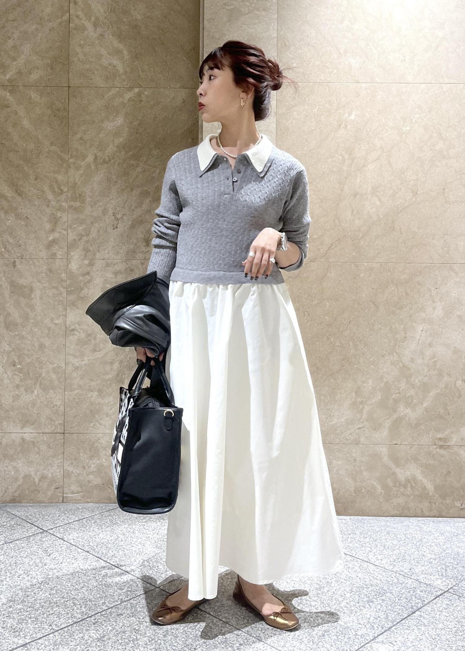 2BUY10%OFFVISダブルカラーポロニットドッキングワンピースライトグレー / F¥8,899レビュー身長158cm、着丈はくるぶしがすっきりと見えるほど。