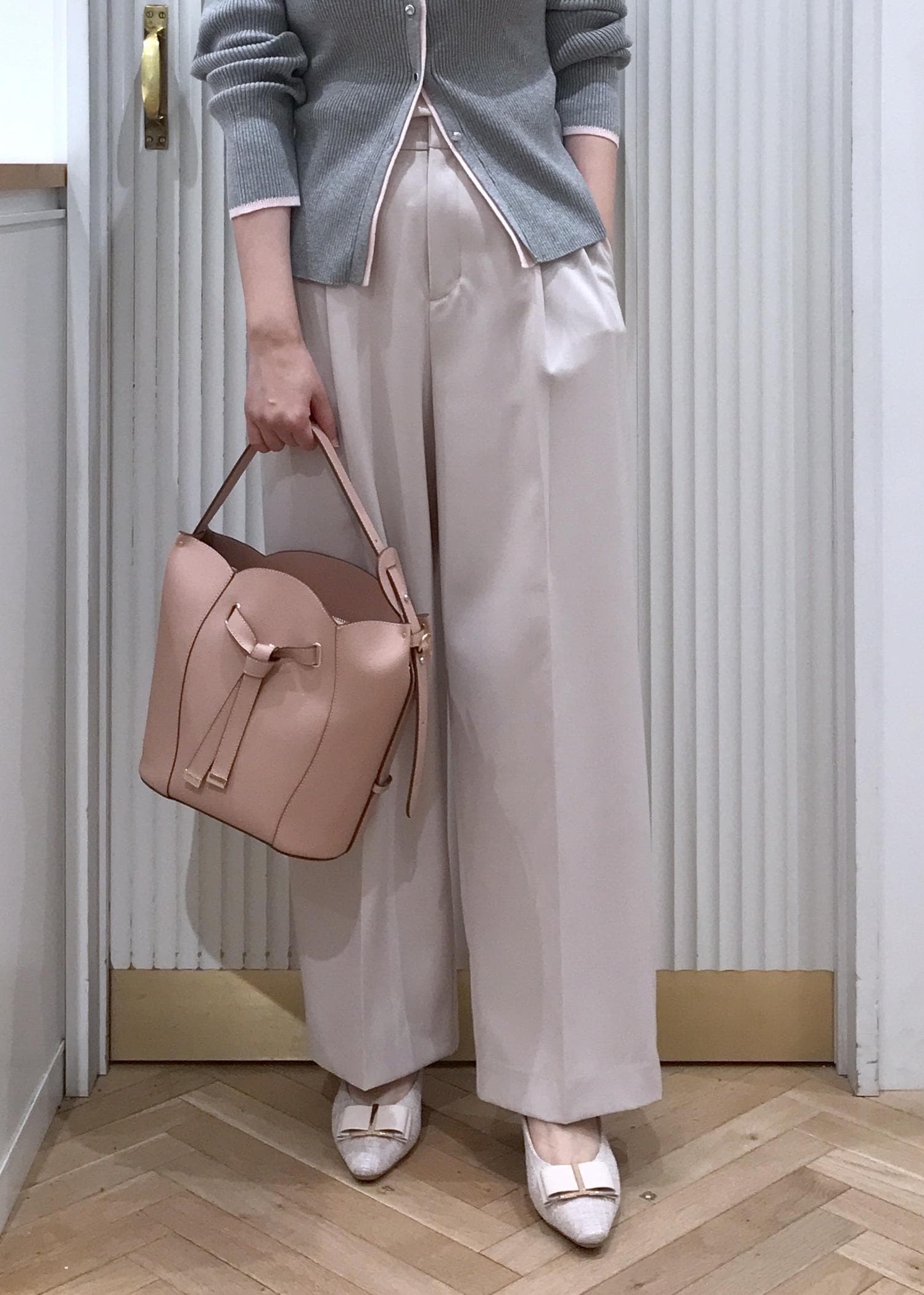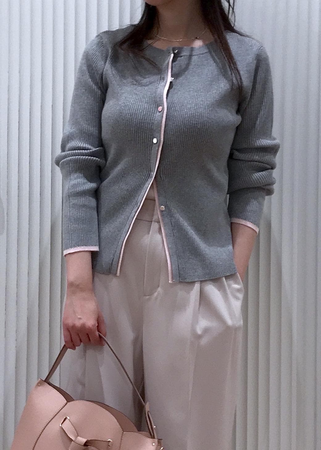 バイカラーが可愛いカーディガンとキレイ目パンツを合わせたお仕事コーデです!
