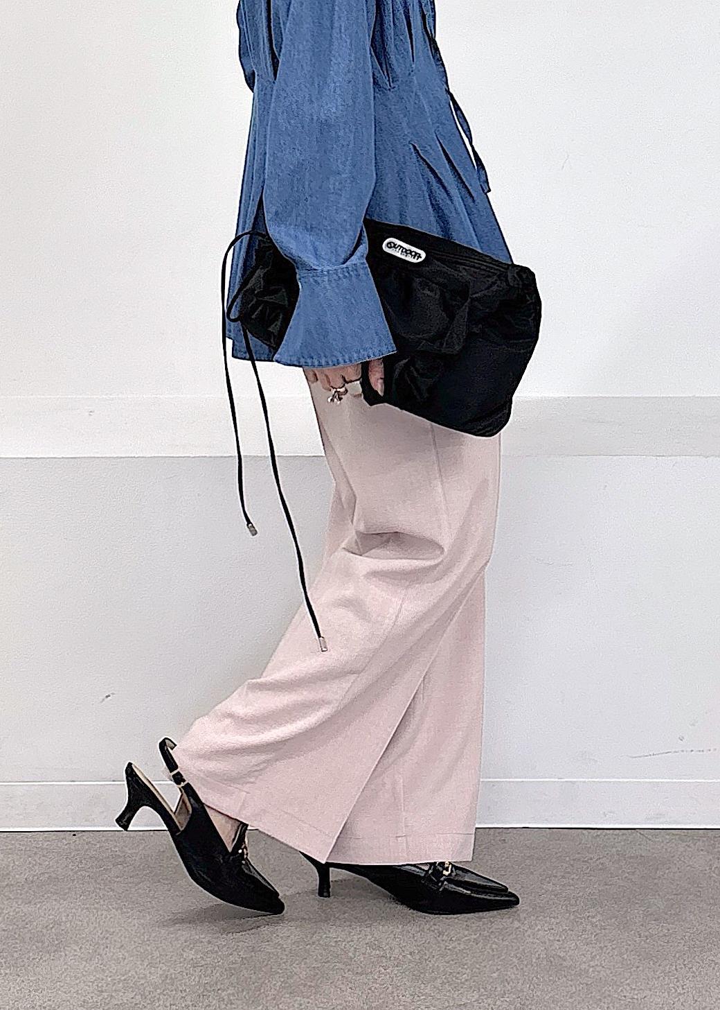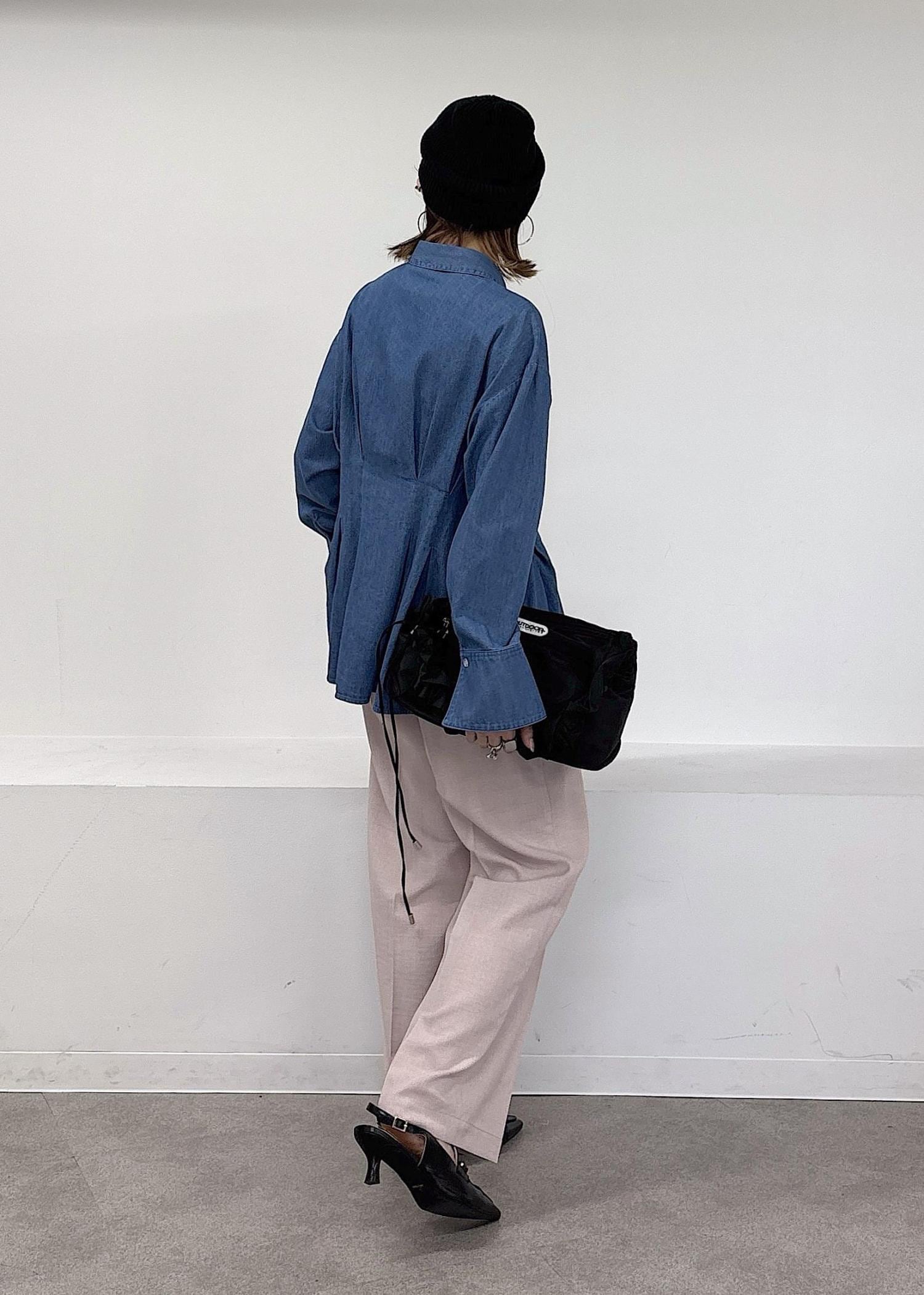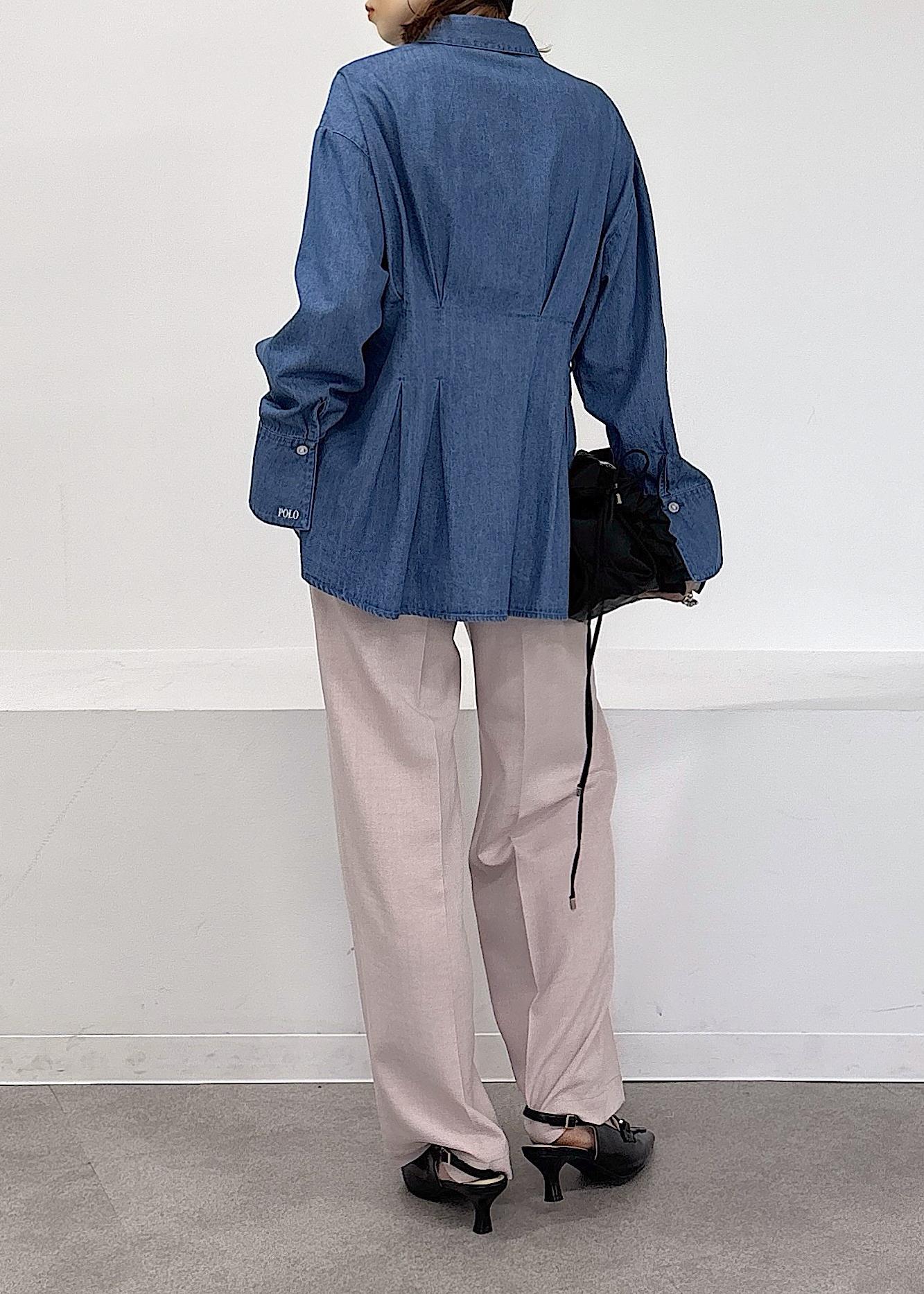 毎シーズン好評のPOLO | VIS別注アイテムが新作で登場です♪春着たいデニムシャツ、胸下にタックが施されていて一枚でスタイルupが叶います◎あえてベルトは首元で結びアレンジ、春らしくピンクのカラーパンツと合わせました。小物はブラックでスッキリまとめた春のお出かけコーデ。