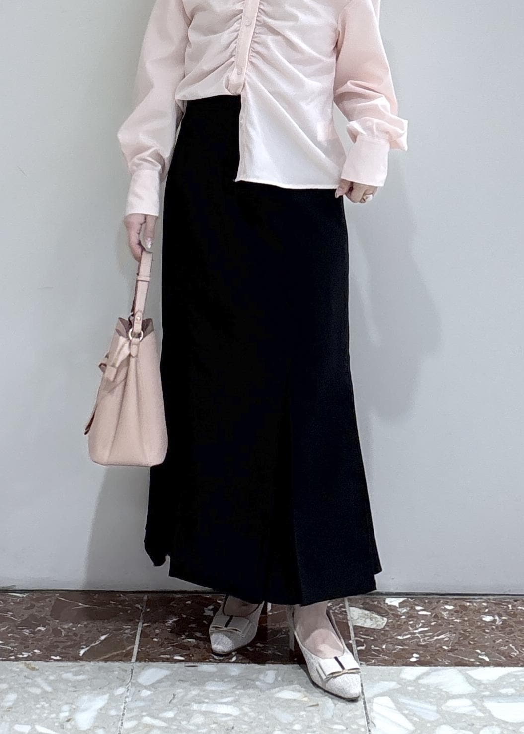 158cmでMサイズ着用。着丈はくるぶしにかかるくらいで、ヒップを拾わないマーメイドラインが嬉しいポイントです◎