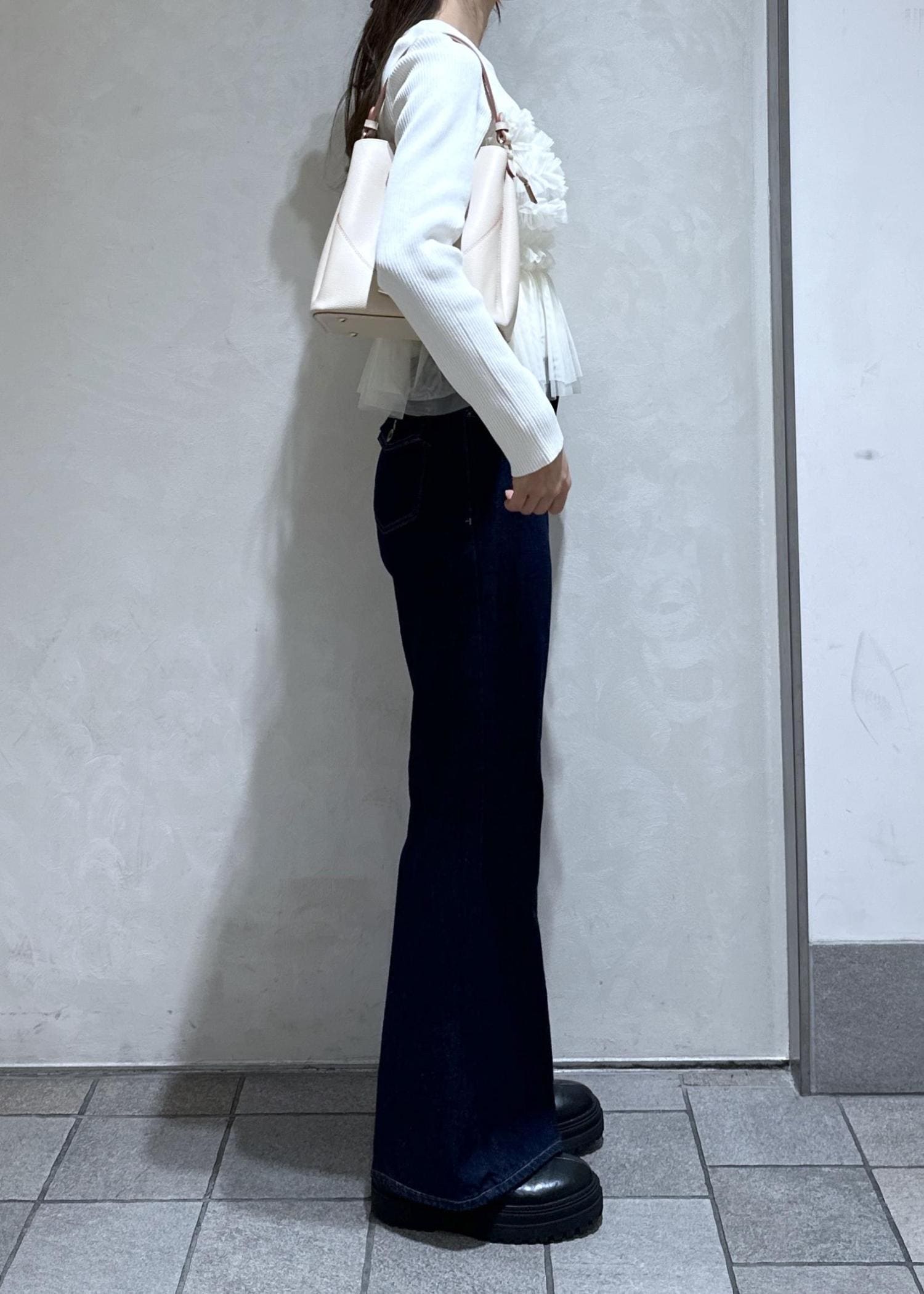 濃いめデニムと黒のブーツでで甘さを抑えて、