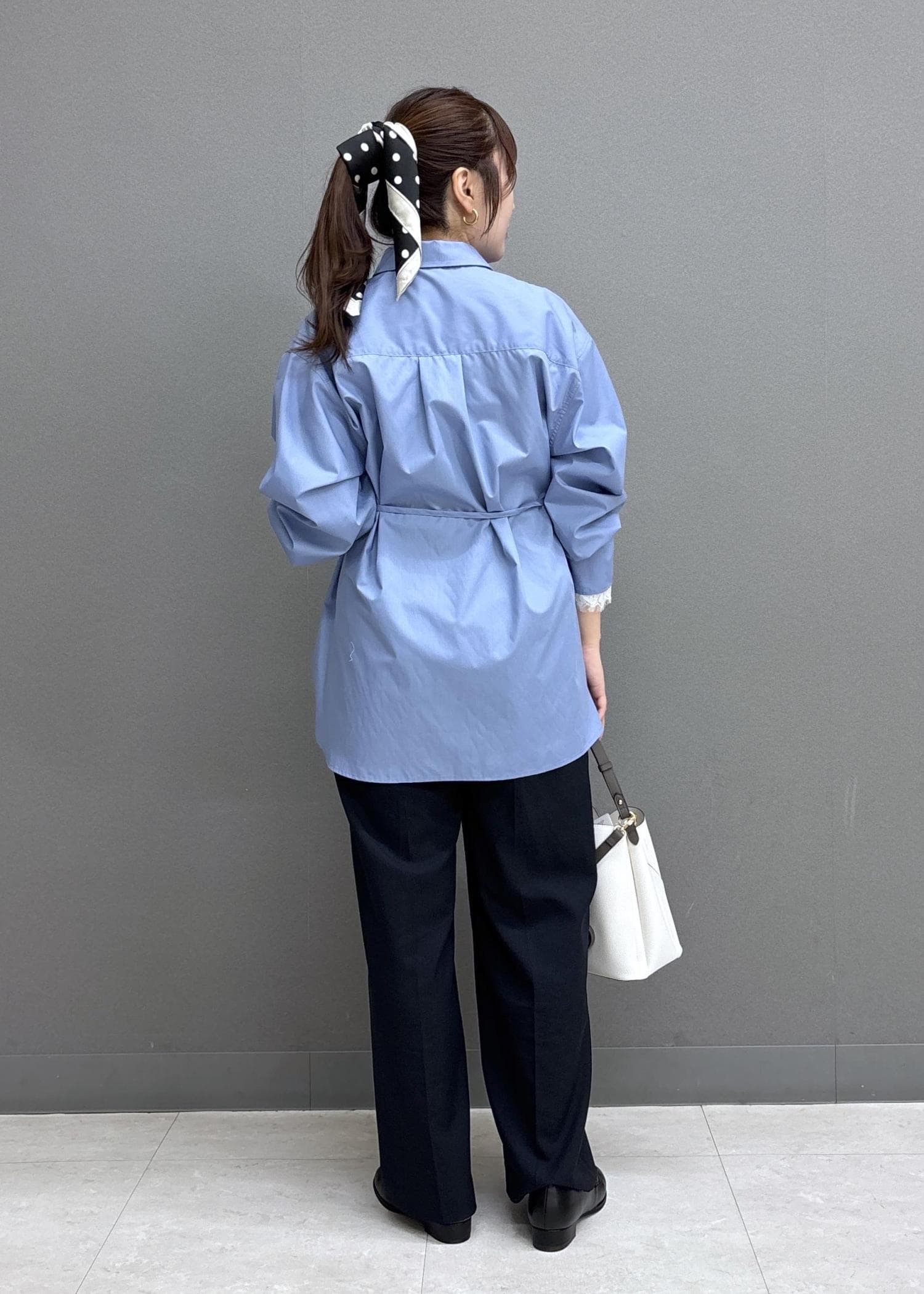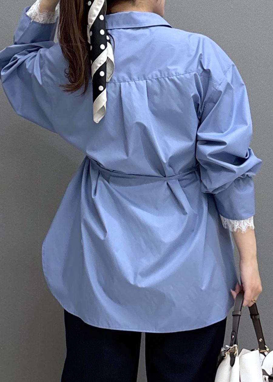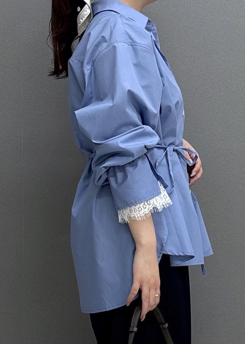 VISレーススリーブAラインシャツサックス / F¥5,929レビュー160㎝だとヒップまでしっかり隠れる長さで、ゆったりとしたシルエット◎さらっとした軽めの素材で、着心地が良いです!袖口のレースが華やかな印象にしてくれます!ウエストリボンを結ぶとメリハリが出るのでおすすめ♩