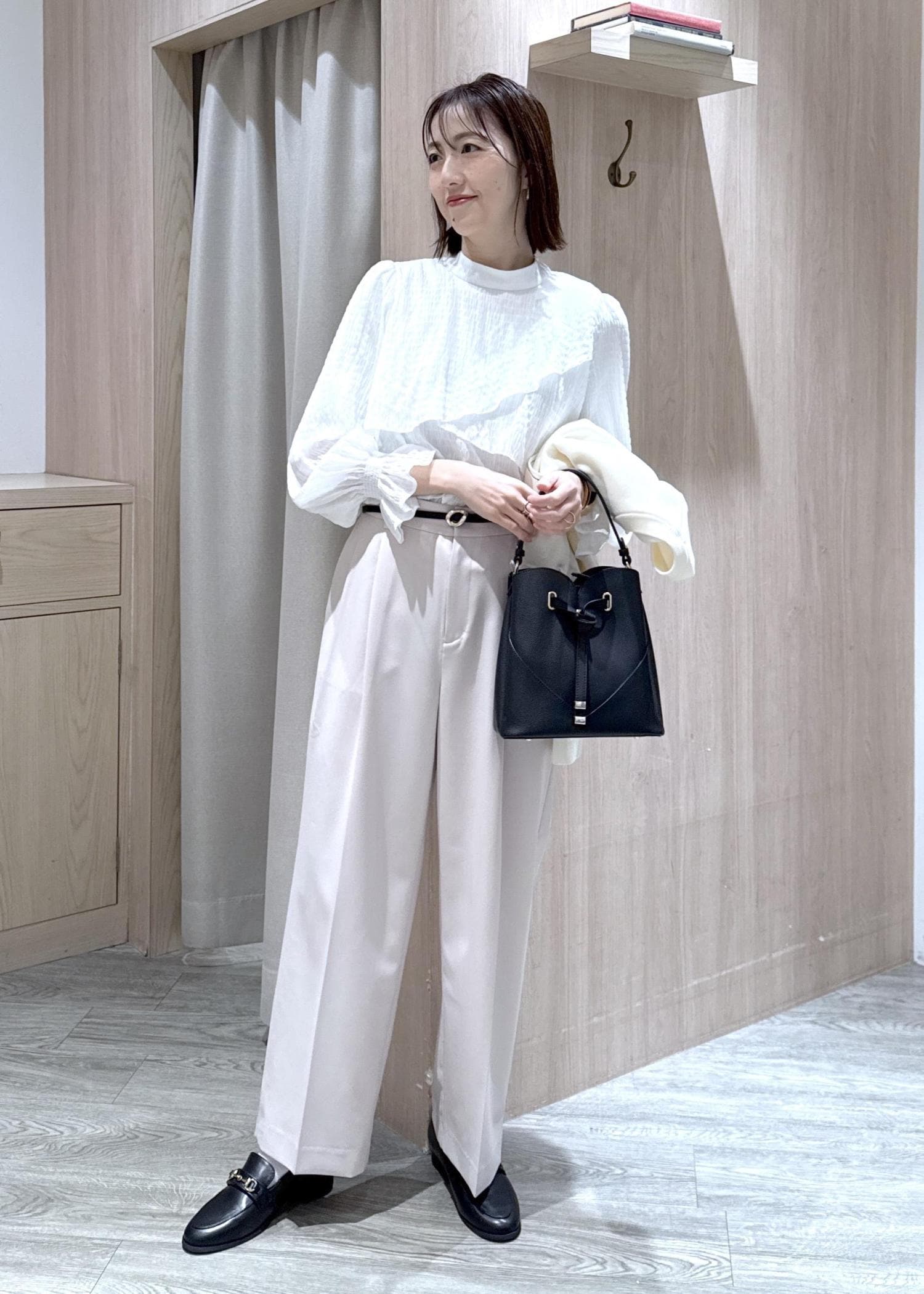 小物をブラックで統一して、オフィスカジュアルなスタイリングにしました♪