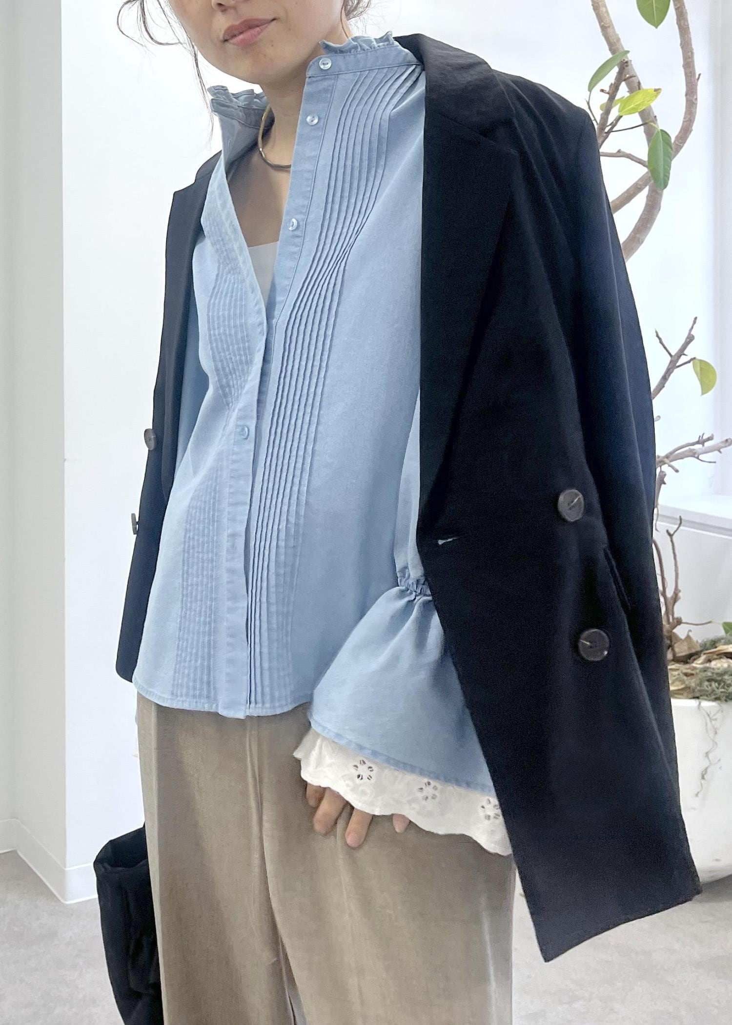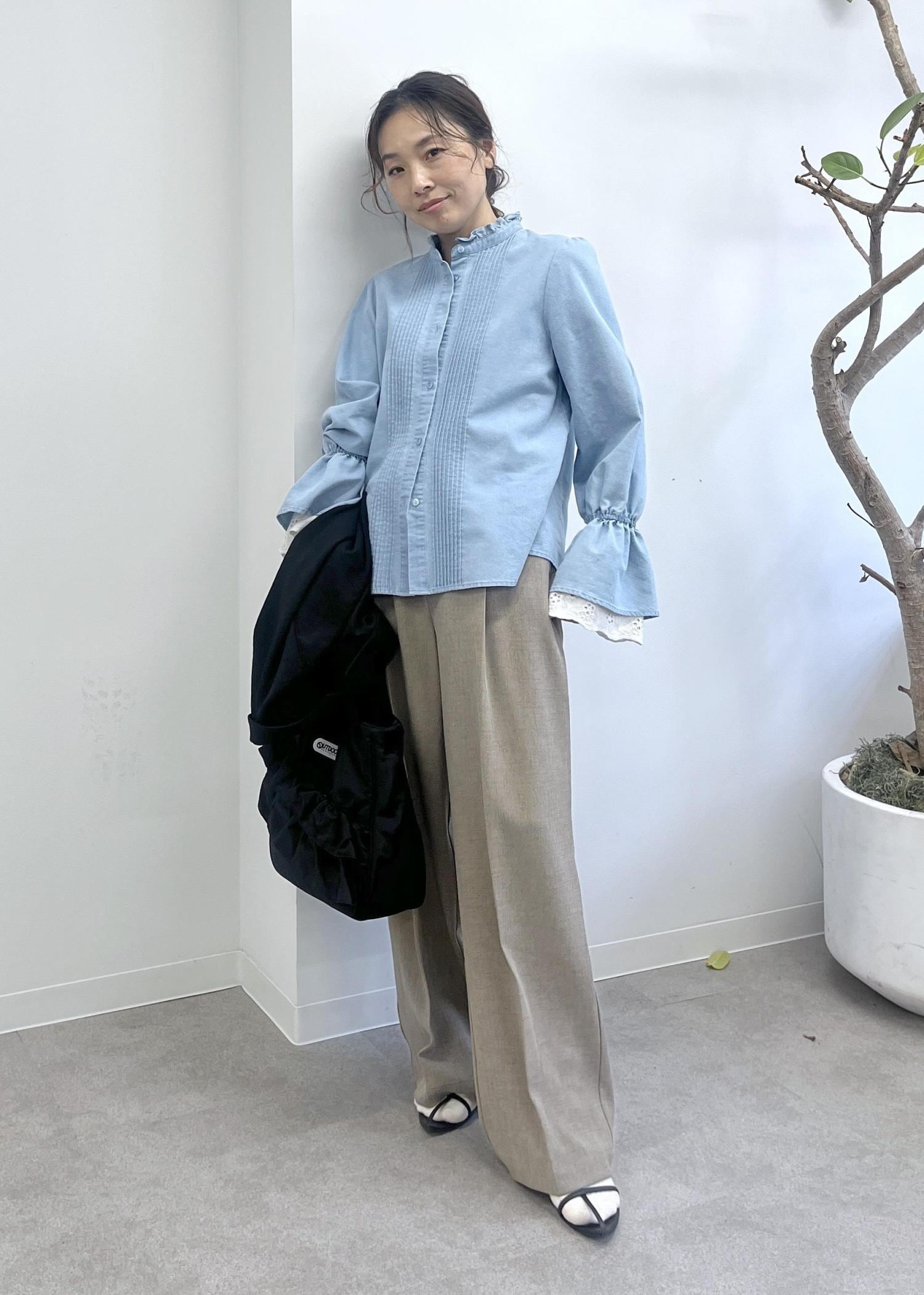 予約VISレイヤードレーススリーブブラウスサックス / F¥6,589レビュー152cmでFサイズ着用し、着丈はお尻にかかるくらいの丈。すっきりシルエットのコンパクトなサイズ感。ボタンの開け具合で印象を変えてお召しいただけます。袖がレースとレイヤードされているので、着るだけで今年らしく!カラーによって素材感が違いますが、デニム素材はシワになりにくく、とても柔らかいので着心地◎キレイめにもカジュアルスタイルにも使えそうです。