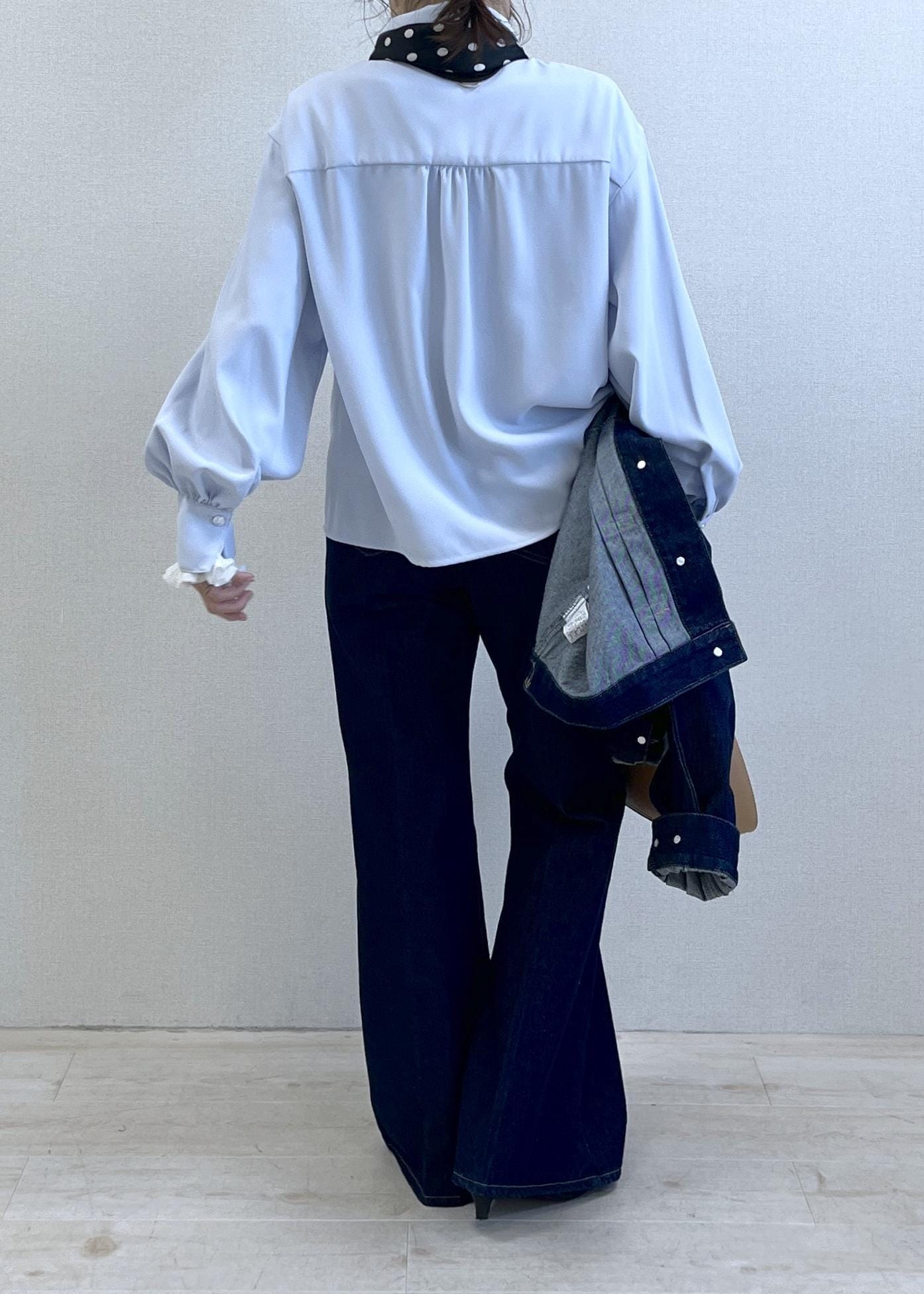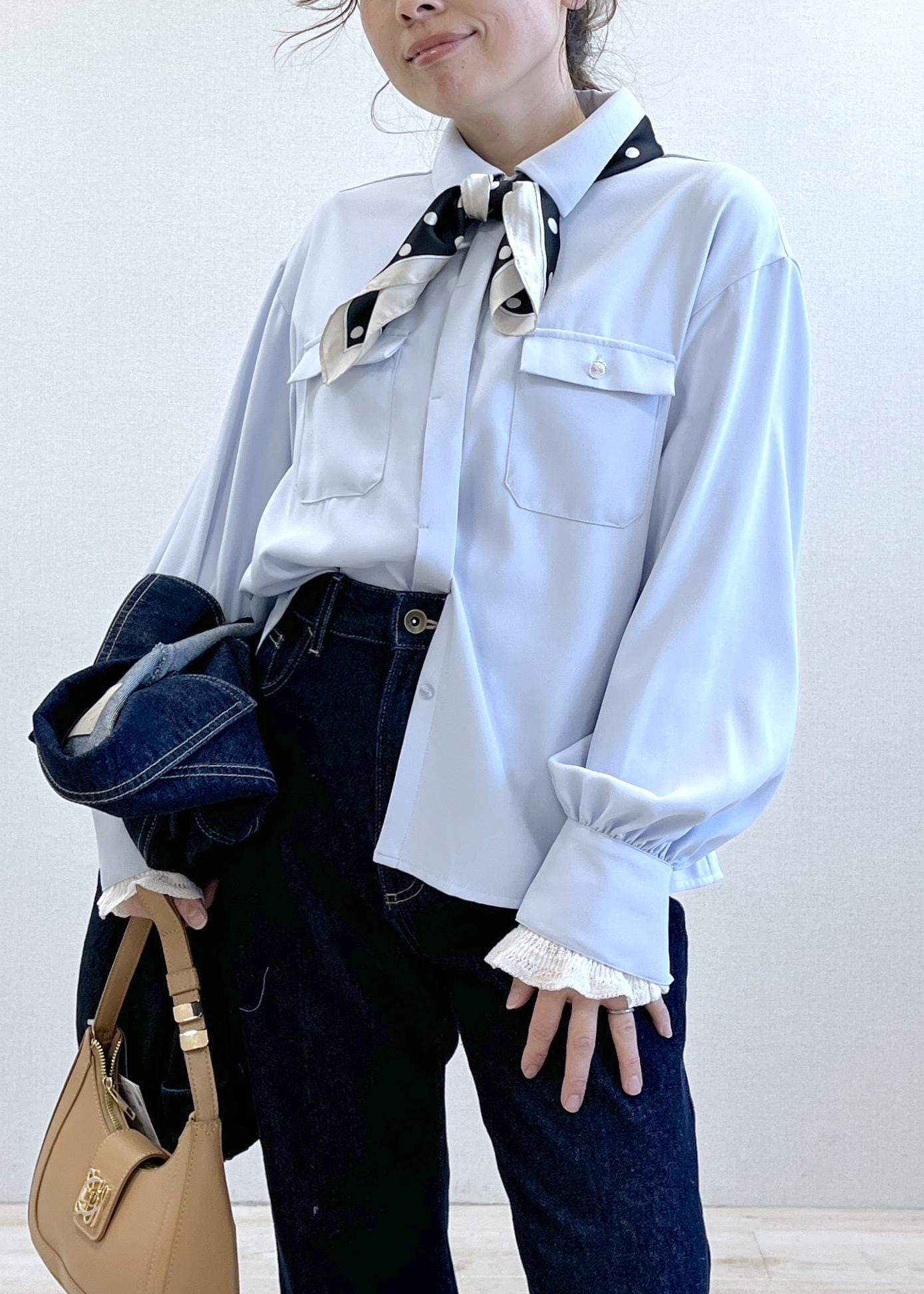 2BUY10%OFFVISメタル釦シャツブラウス/イージーケアサックス / F¥5,489レビュー152cmでFサイズ着用し、着丈は腰にかかるくらいのコンパクト丈。トロミのある素材感で大人っぽい。オーバーサイズですが、横に広がりすぎずストンっと落ちるシルエット。サラッとした素材感で涼しげにお召しいただけます。しわになりにくいのでお手入れも楽ちんです。