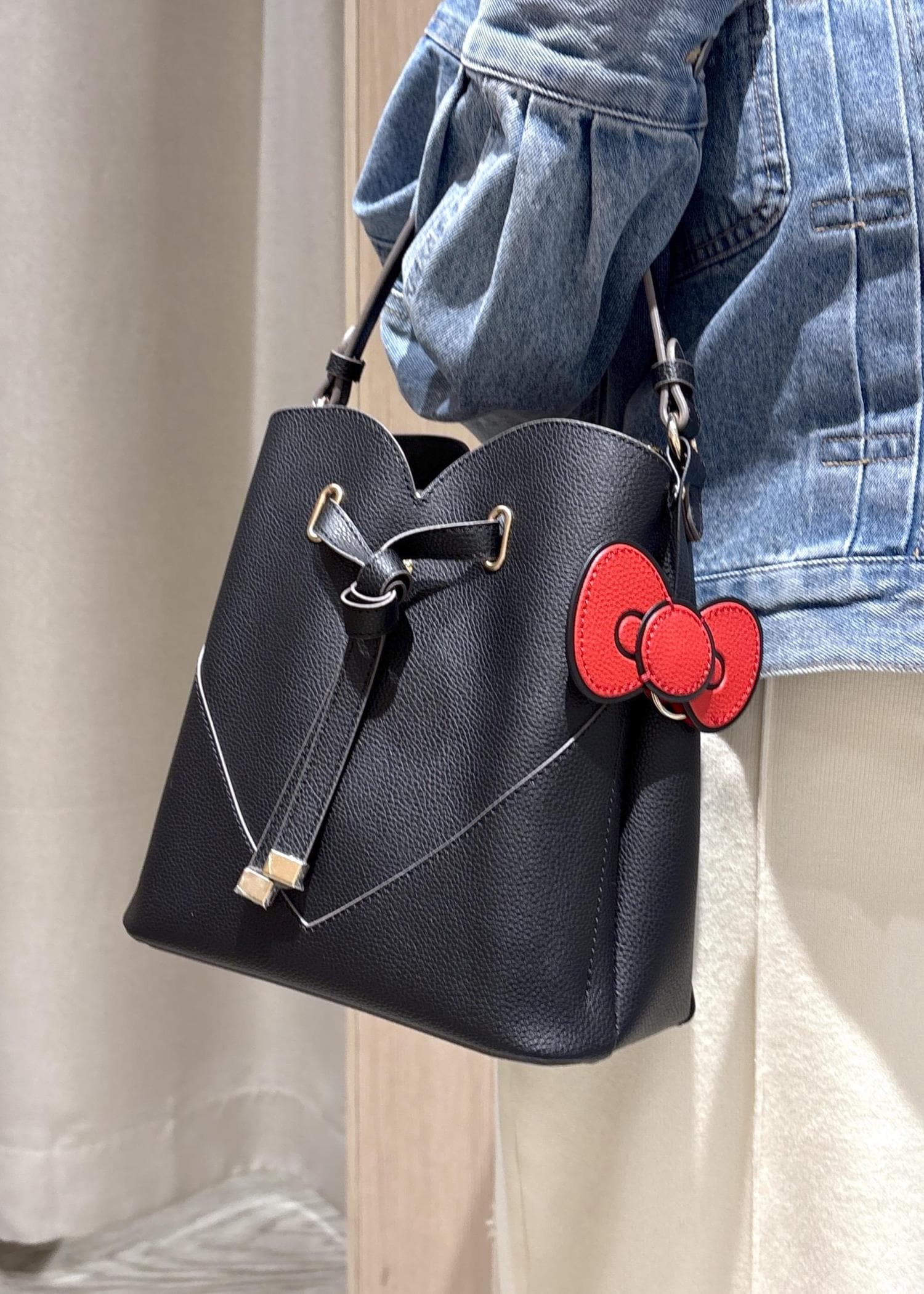 ハローキティとのコラボアイテムでさり気ないチャームが付いています。ブラックのバッグにキティちゃんの赤のリボンが目を惹く一点です!チャームがさり気ないので大人女子も使いやすいですよ!