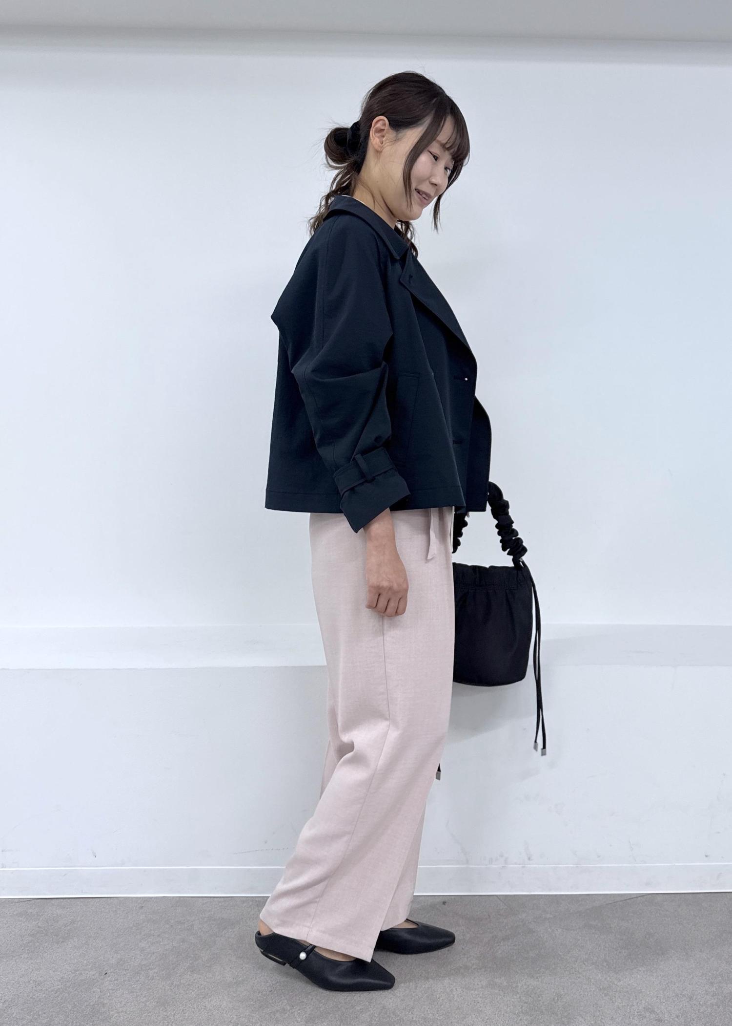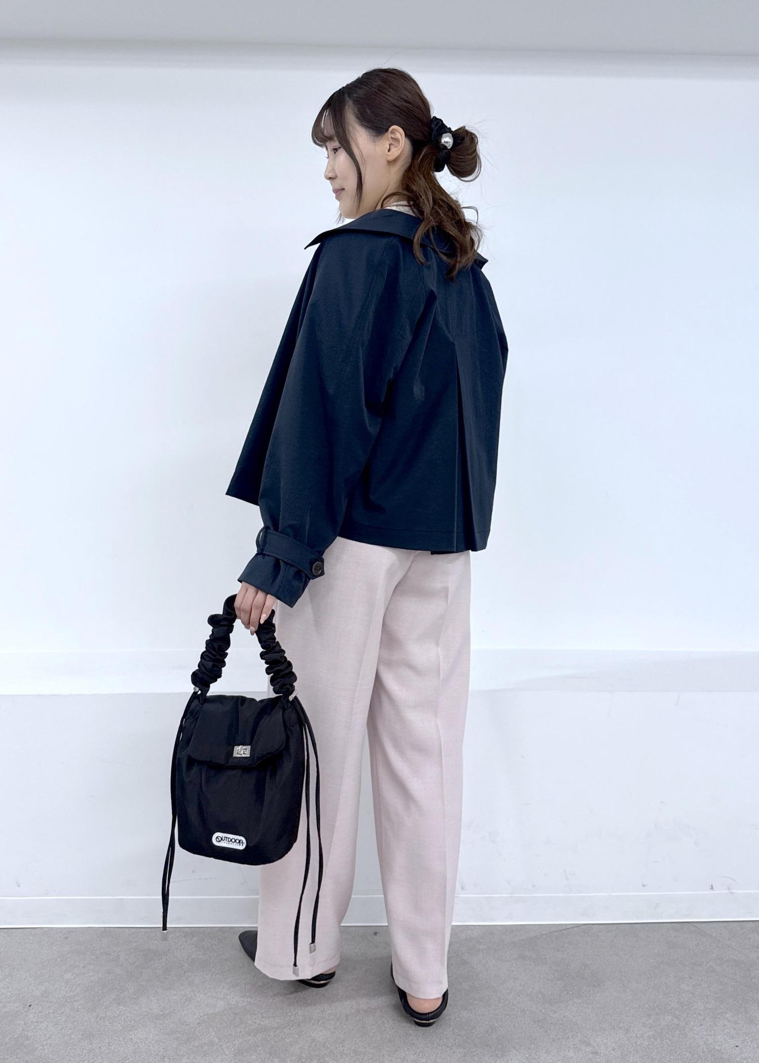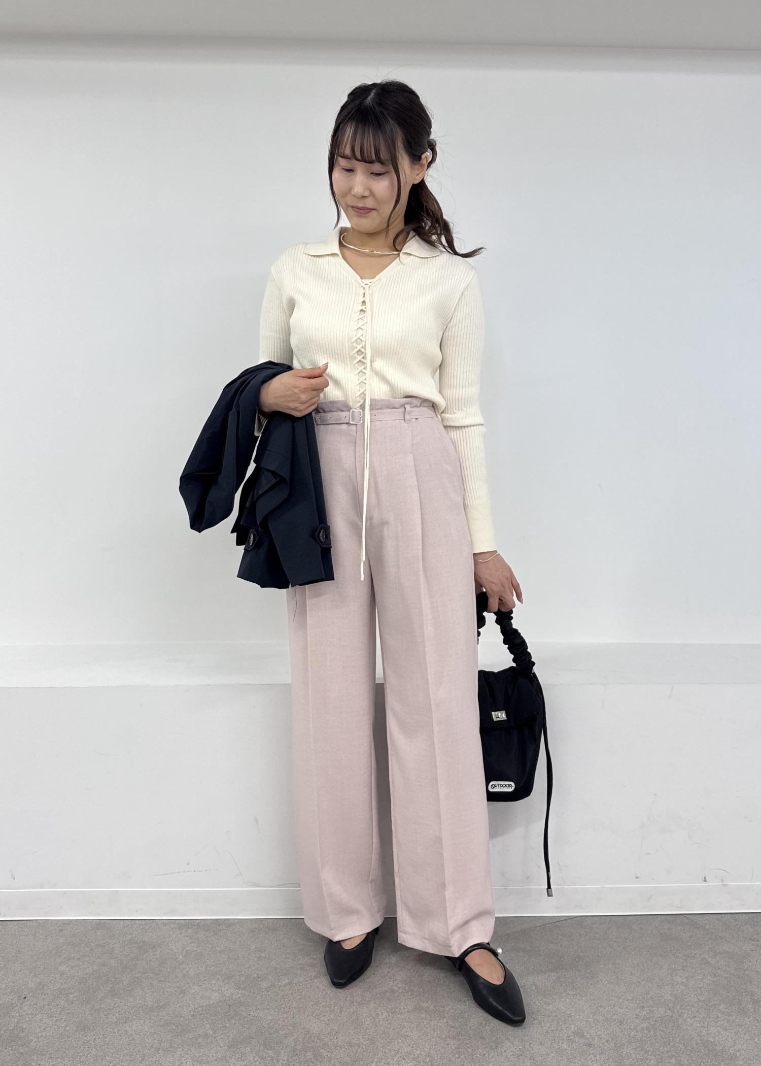 レース編を結ばず垂らすことで大人っぽい印象にしました。ピンクカラーの淡いパンツを合わせて春らしいコーデに仕上げました。ショートトレンチコートはUVや撥水加工付きなのでおすすめです。