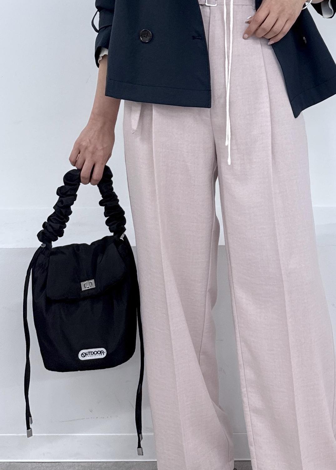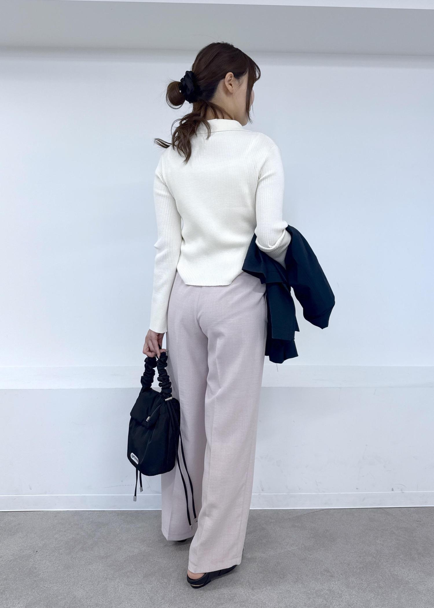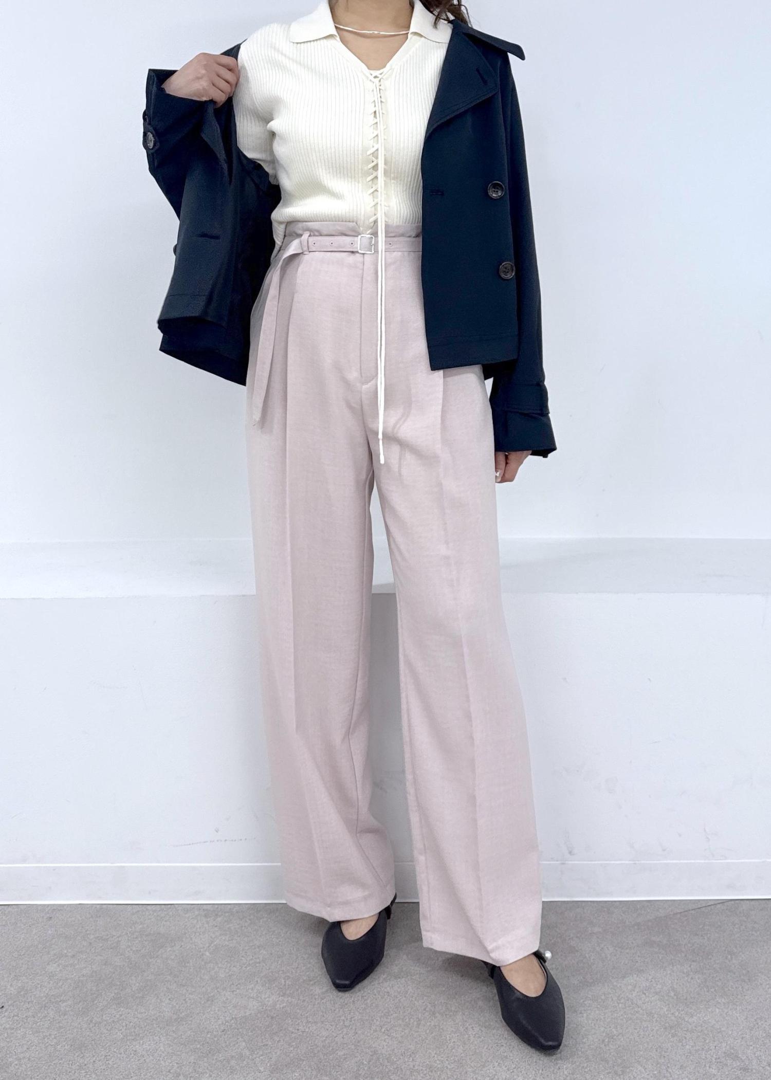 レース編を結ばず垂らすことで大人っぽい印象にしました。ピンクカラーの淡いパンツを合わせて春らしいコーデに仕上げました。ショートトレンチコートはUVや撥水加工付きなのでおすすめです。