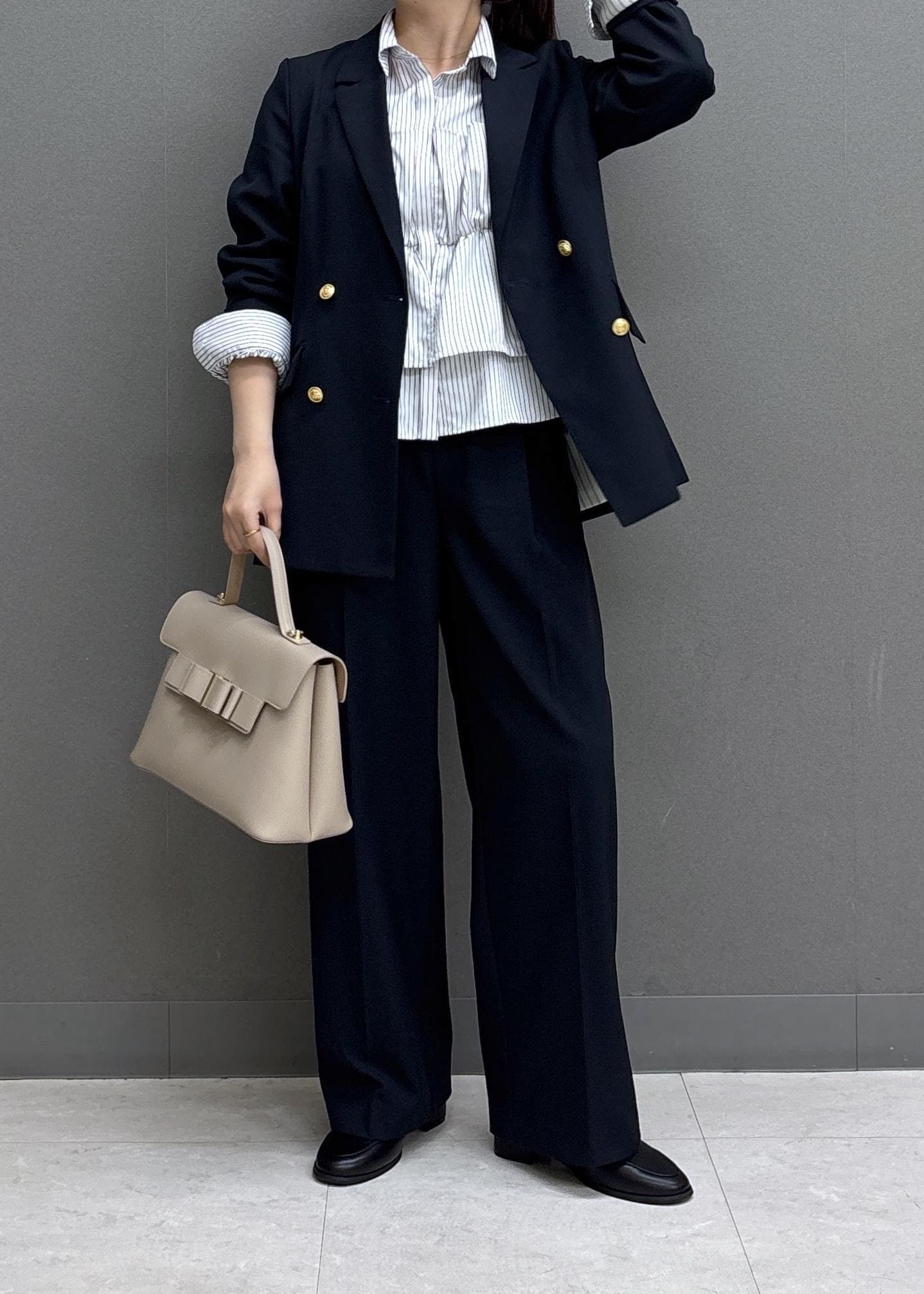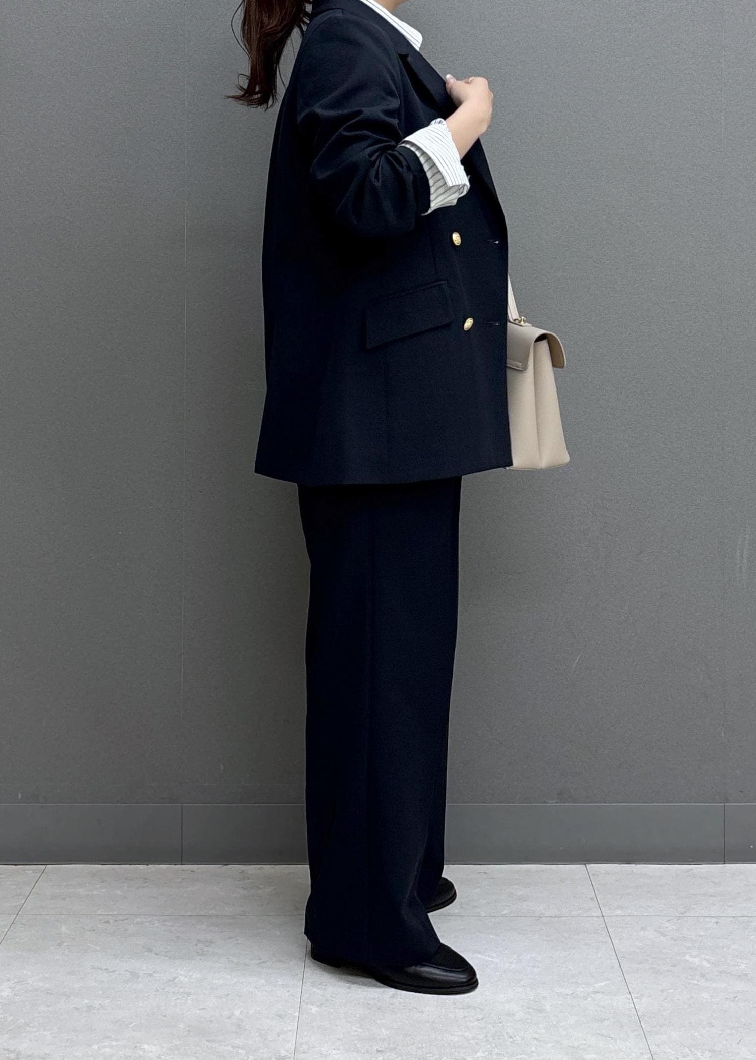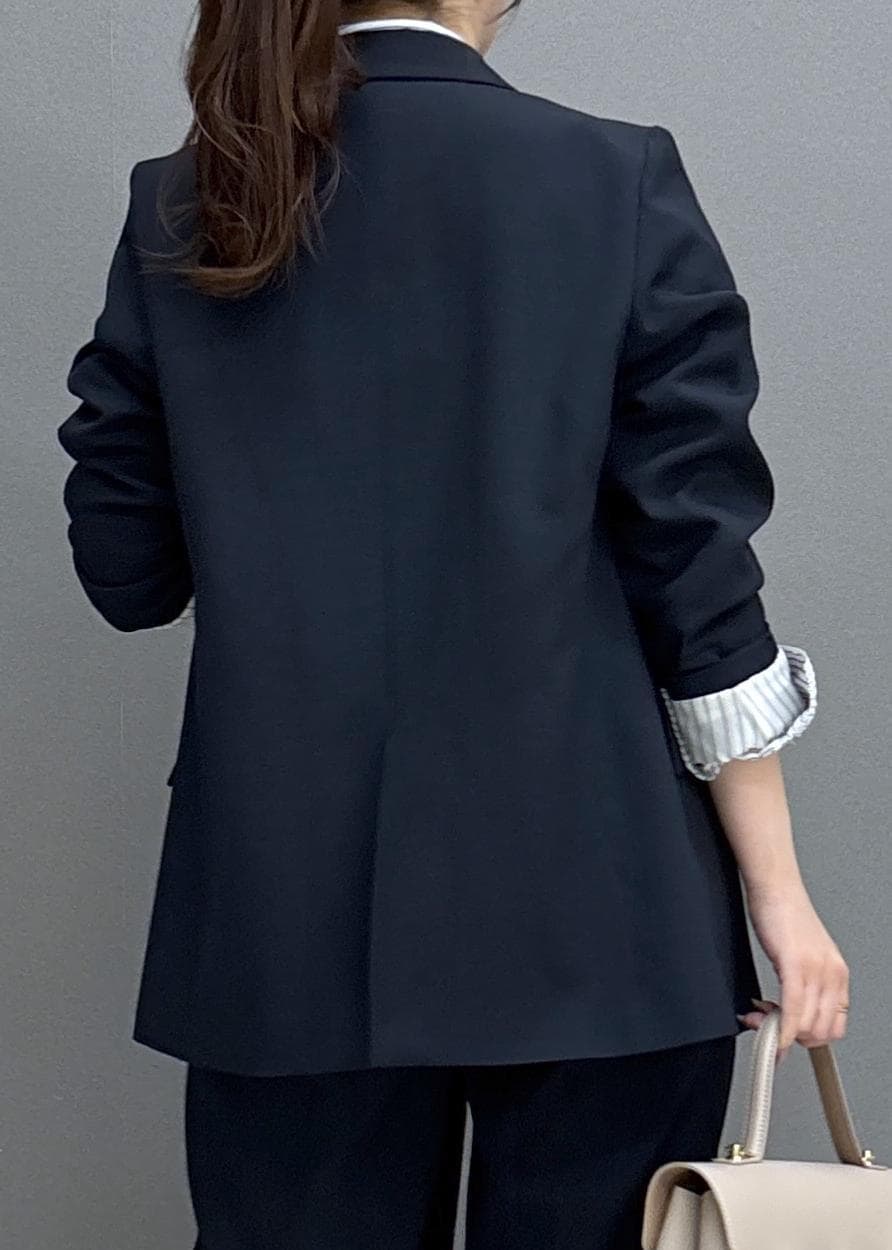 2BUY10%OFFVIS【美easy】コンフォート金ボタンジャケット/イージーケア・UVケア・セットアップ対応ネイビー / M¥8,899レビュー160㎝ / Mサイズ着用。ヒップまで隠れる着丈で安心感があります!袖は手の甲にかかる長さだったので、折り返して着ても◎腕まわりがゆったりしているのでシャツはもちろん、薄手のニットも重ね着できました!さらっとした素材で軽い着心地です♩