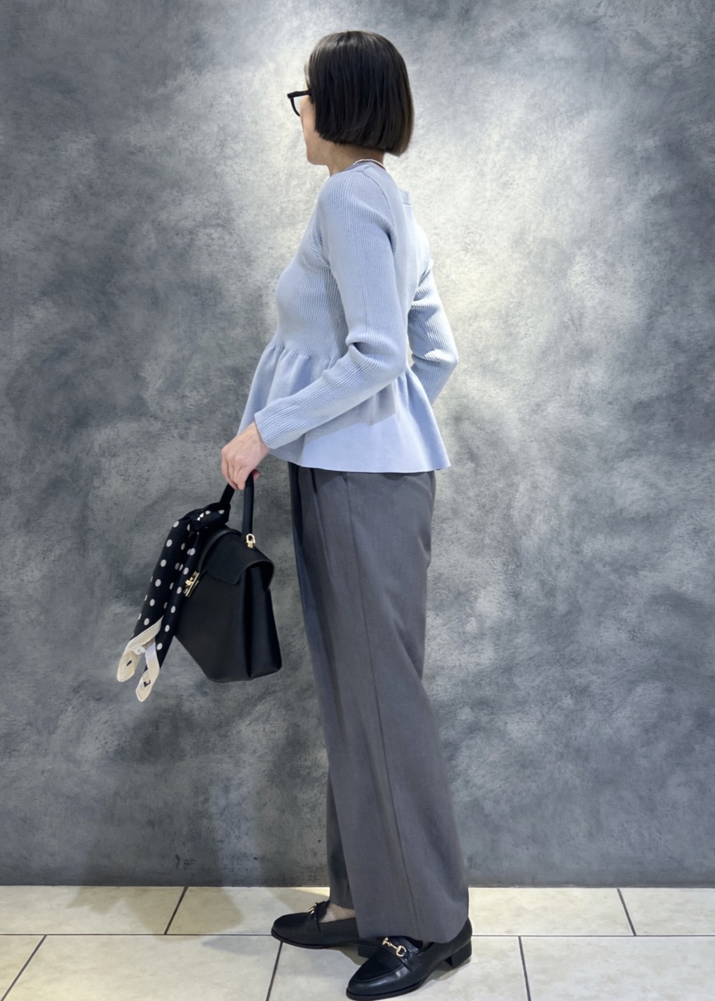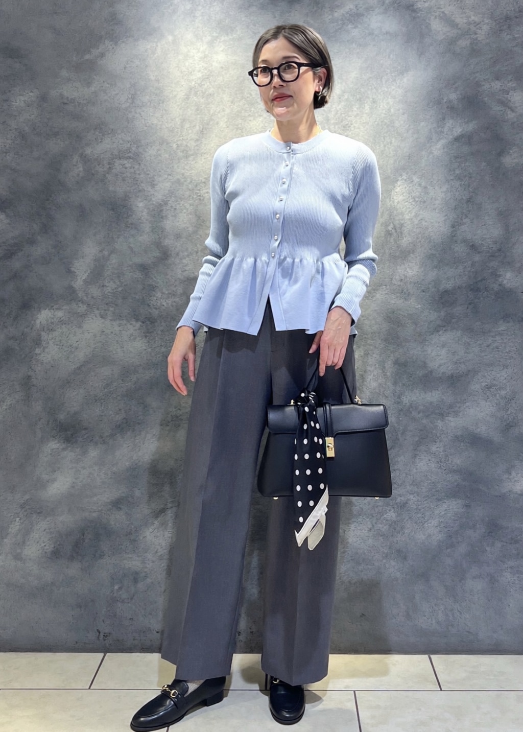 寒色系ですが柔らかなワントーン風コーデは仕事はスッキリこなしつつしなやかさのあるクールな先輩。