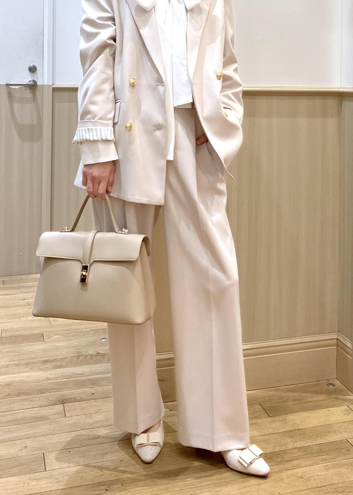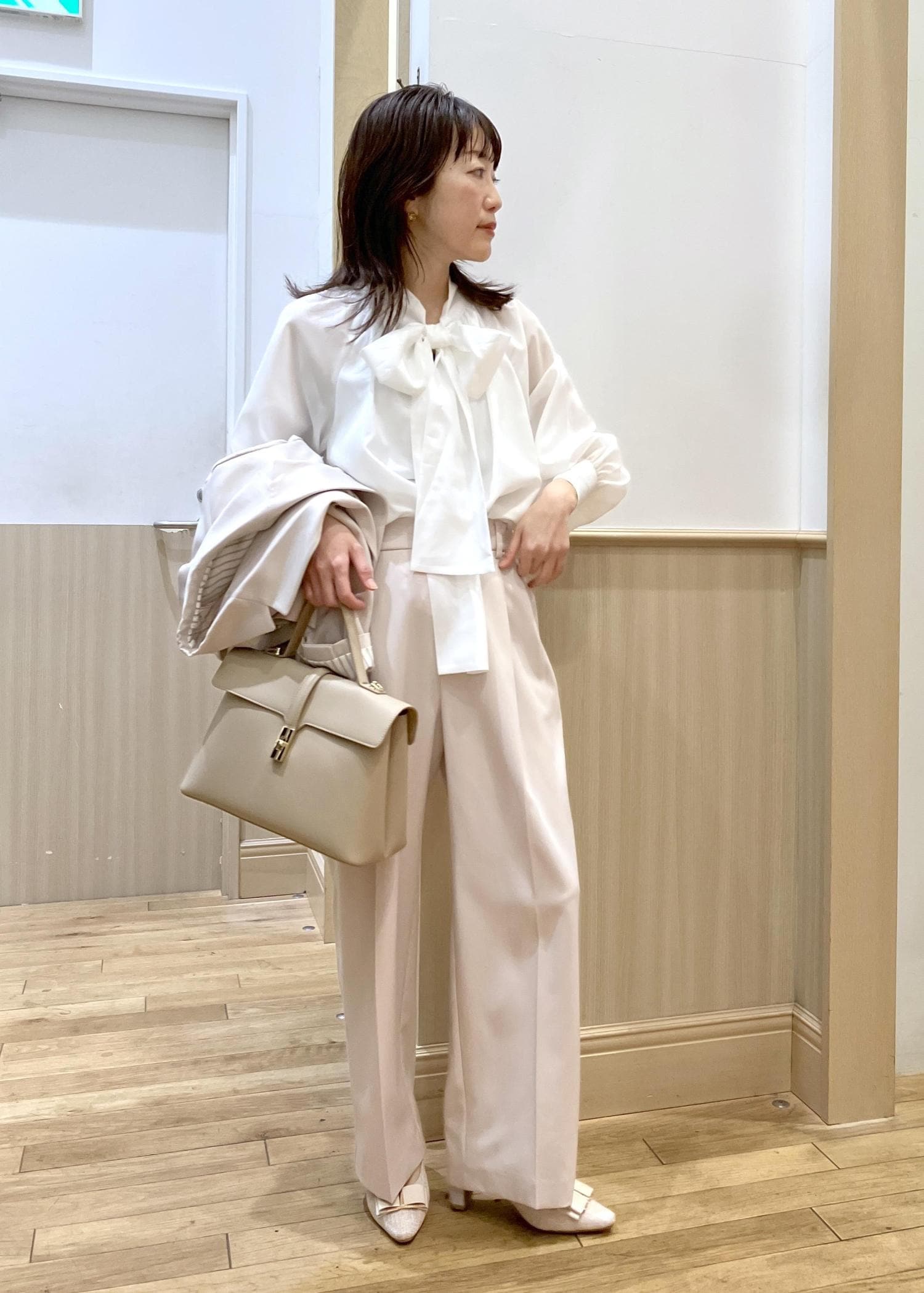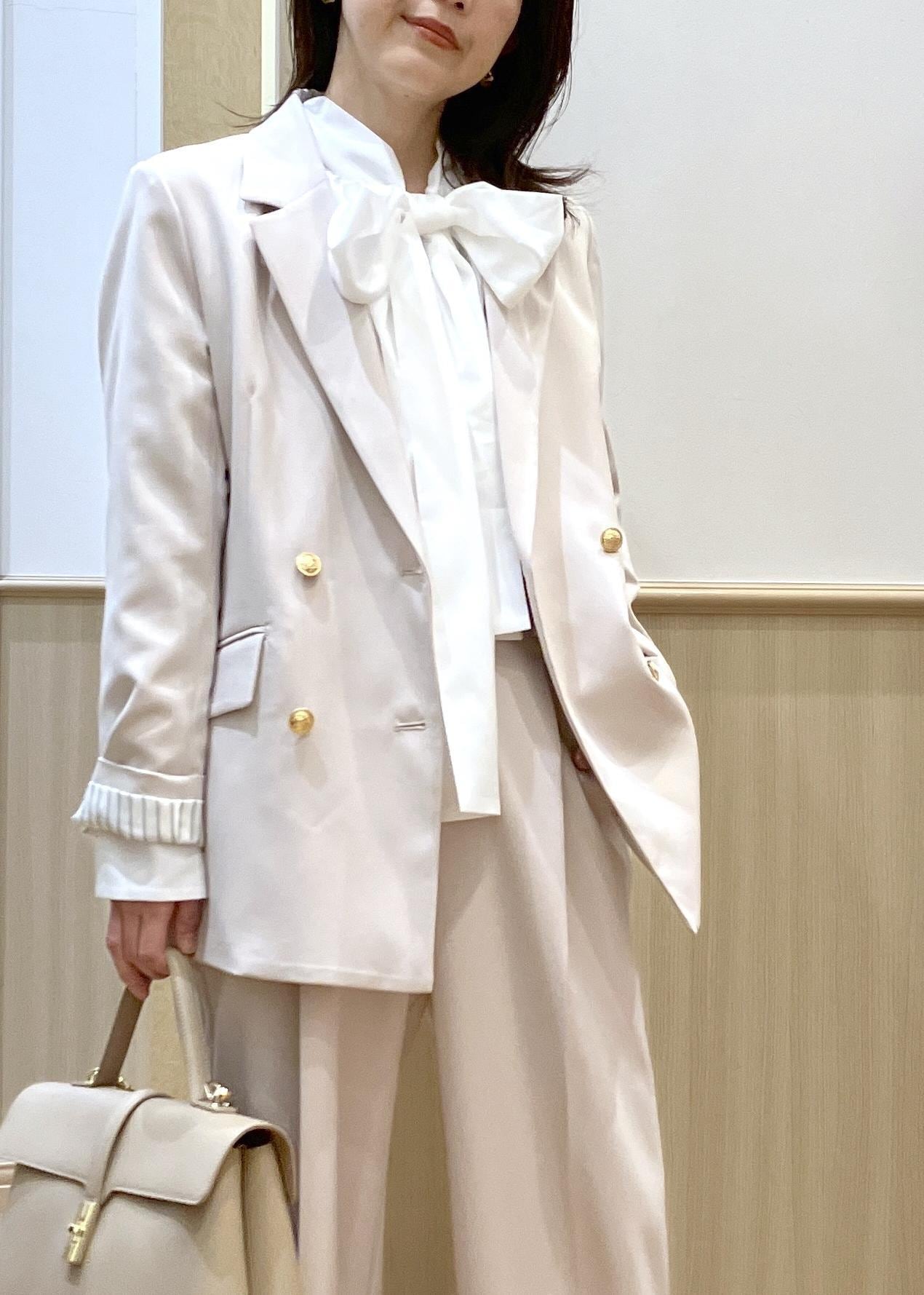 春の入学式や入園式などのセレモニーシーンをイメージしたstylingです。晴れやかなお祝いの式なので明るいライトベージュのセットアップに白のブラウスを合わせたセレモニー王道のstylingです。インに合わせたふんわりとしたボリューム感のあるリボンブラウスが華やかさもあってオススメです。