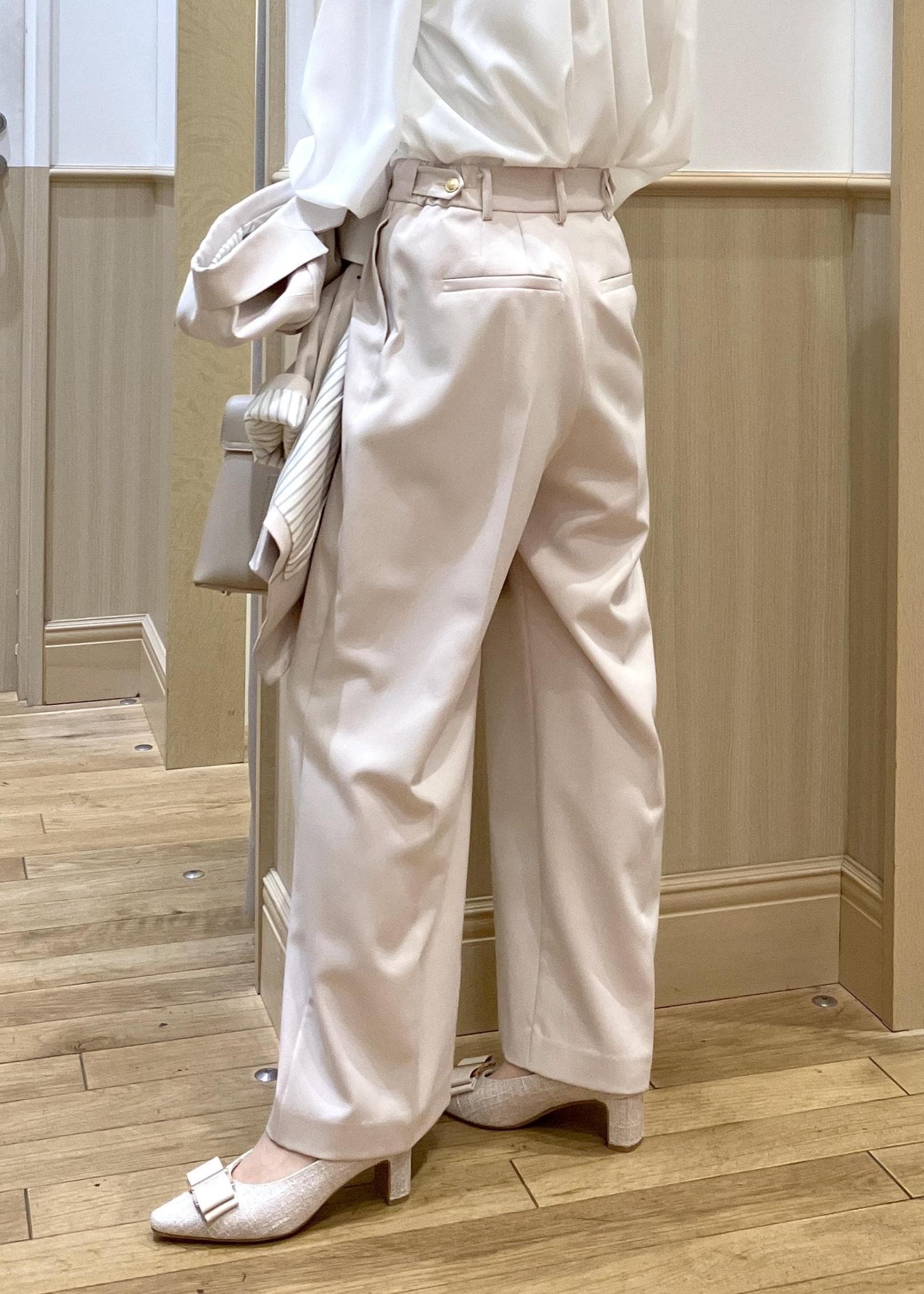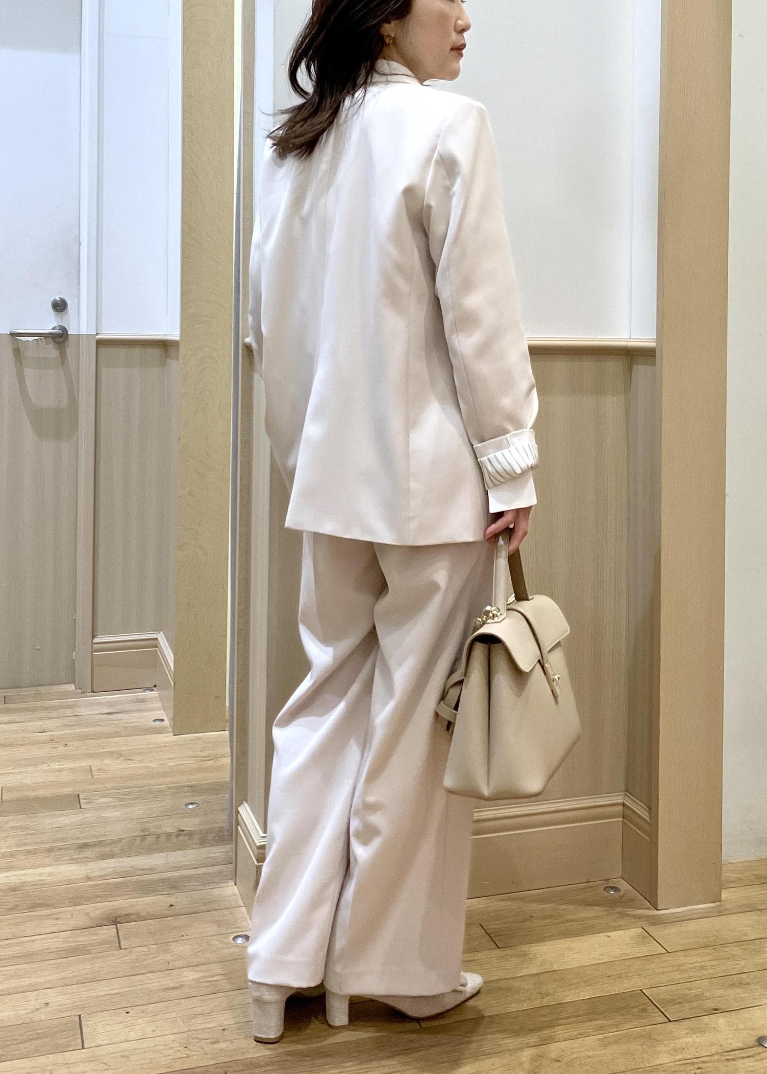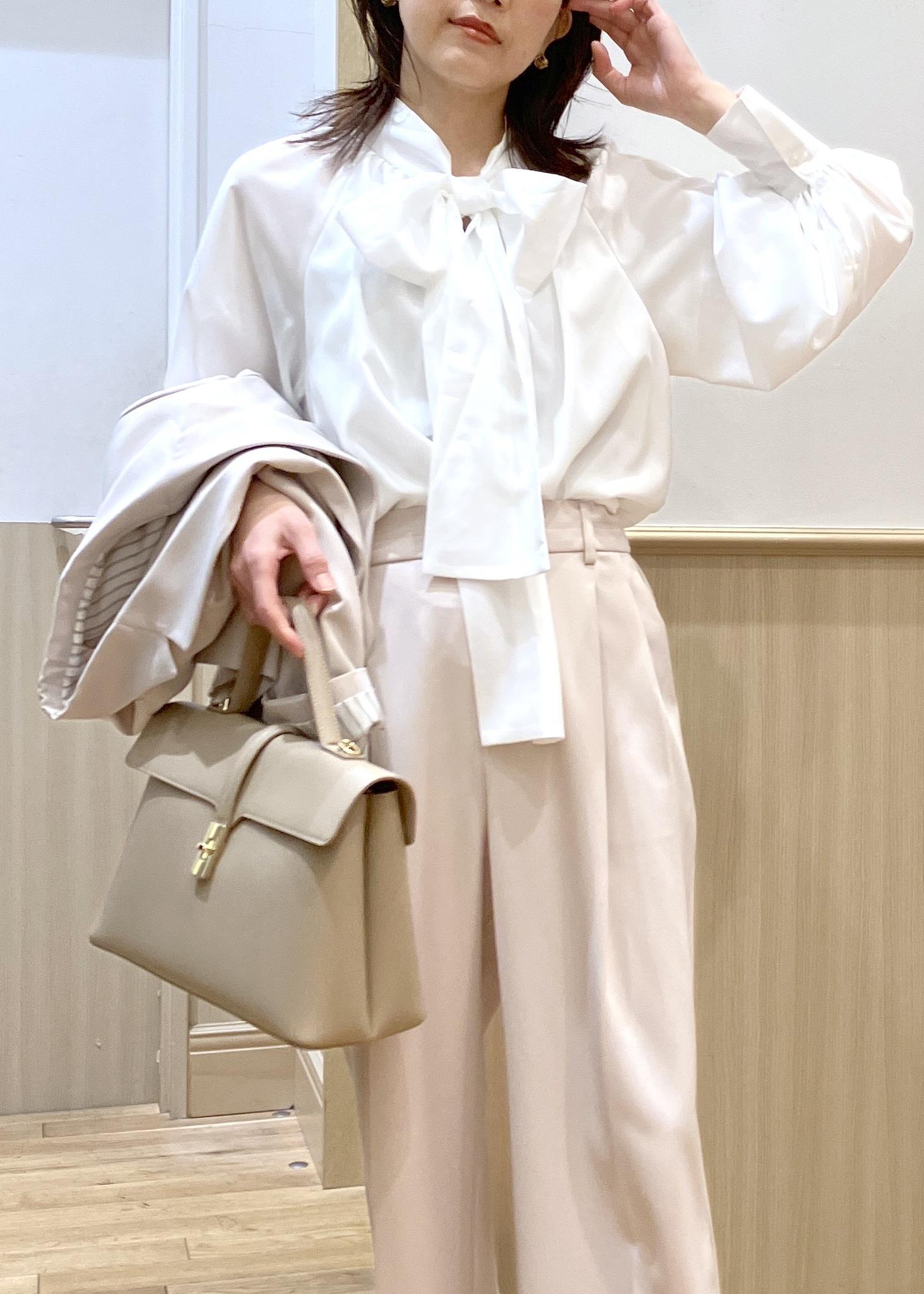 春の入学式や入園式などのセレモニーシーンをイメージしたstylingです。晴れやかなお祝いの式なので明るいライトベージュのセットアップに白のブラウスを合わせたセレモニー王道のstylingです。インに合わせたふんわりとしたボリューム感のあるリボンブラウスが華やかさもあってオススメです。