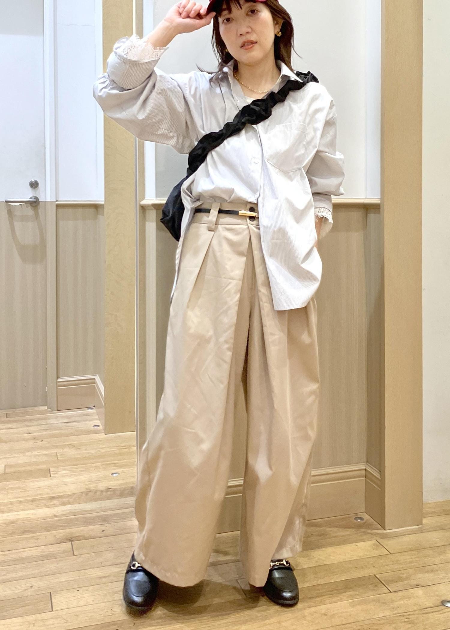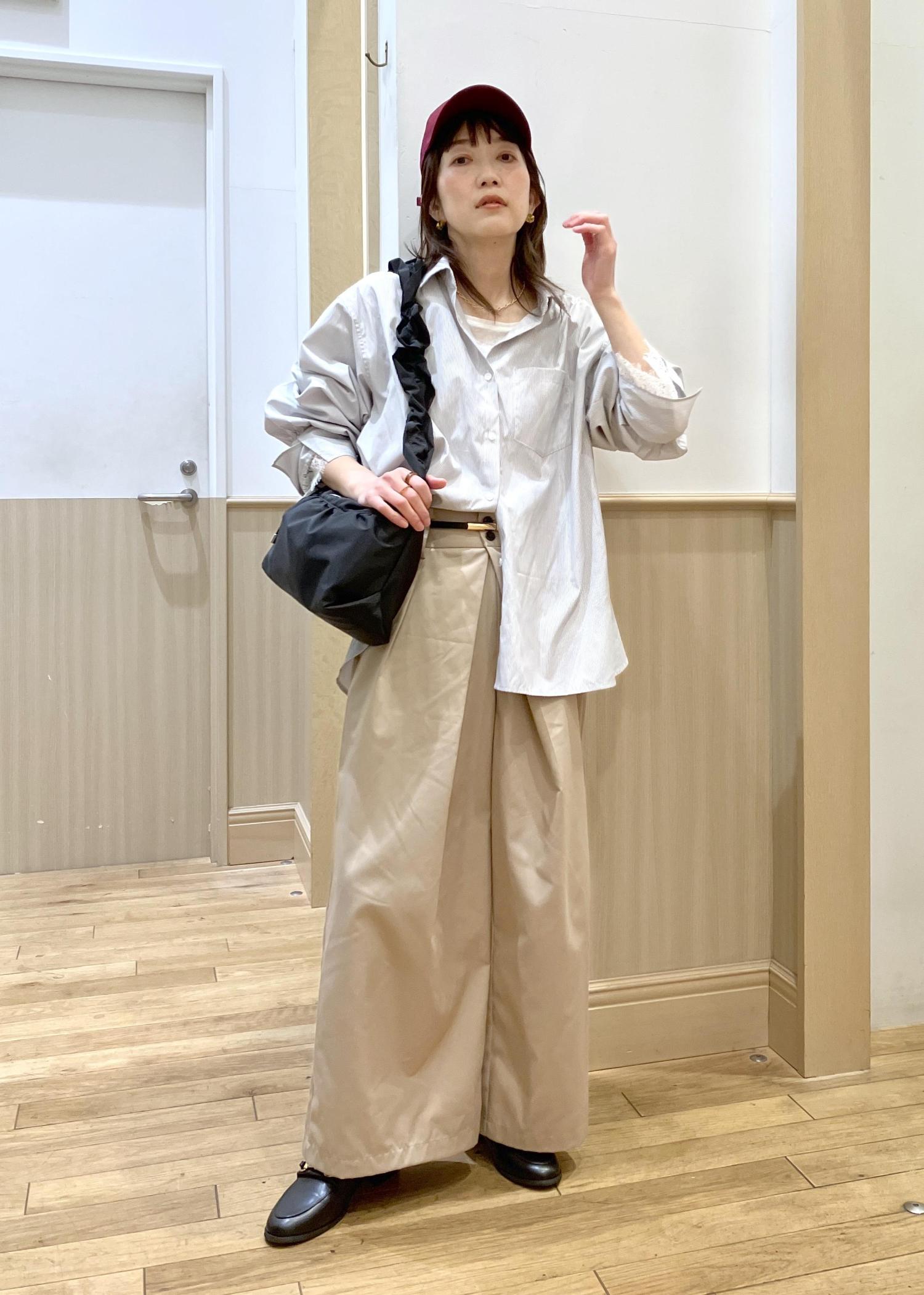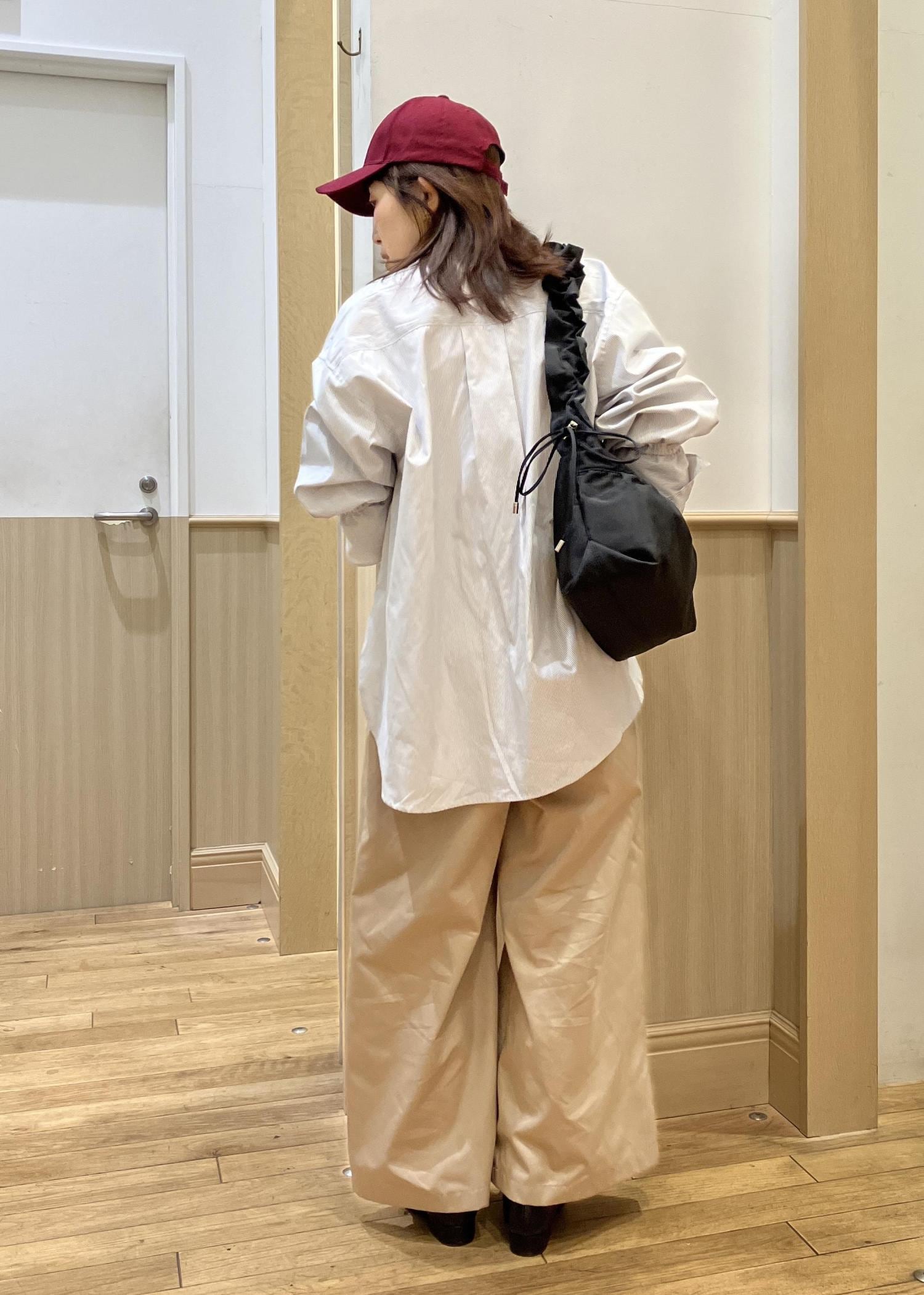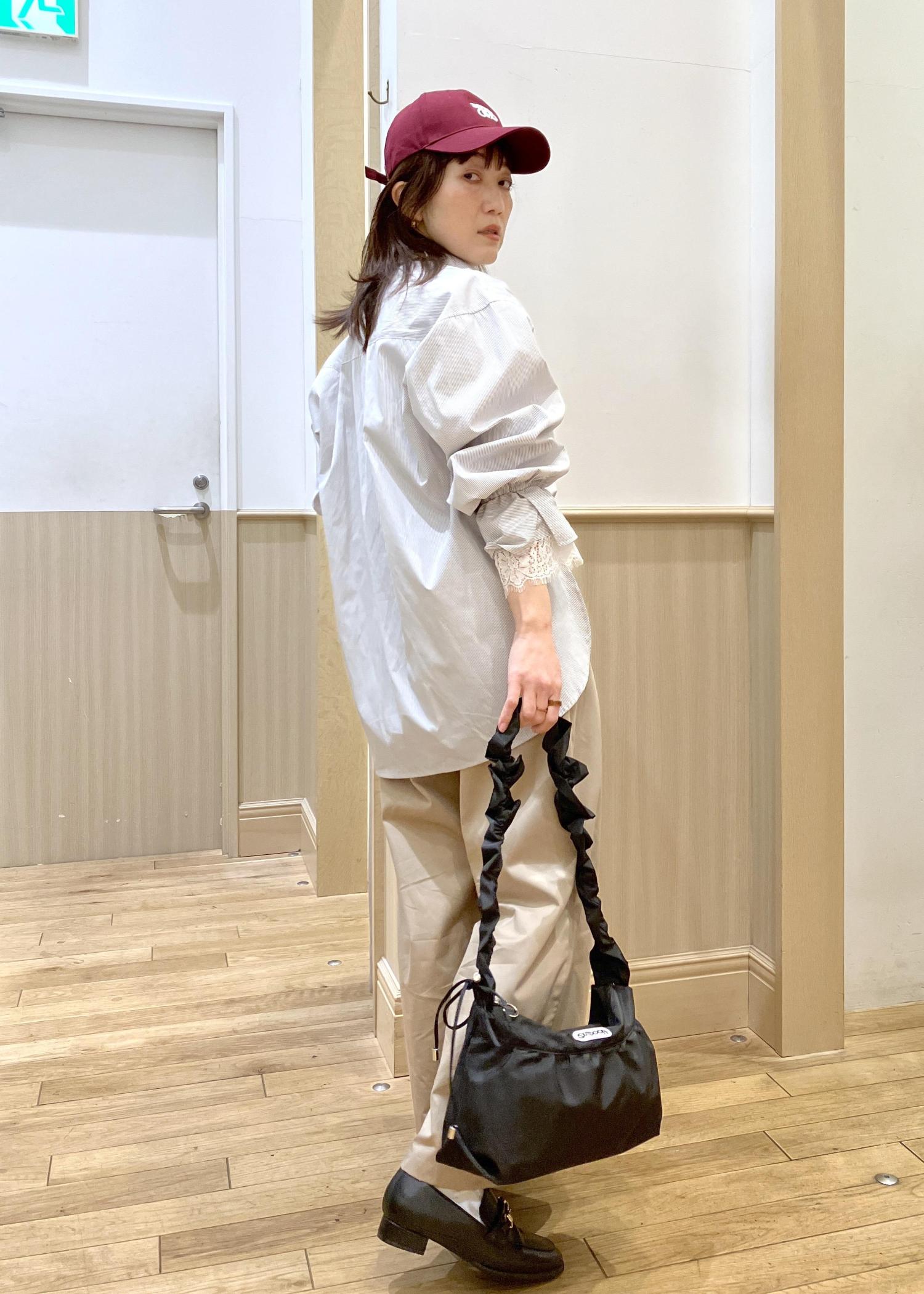 OUTDOOR PRODUCTS のフリルbagをメインにstyling春といえばのシャツを襟を抜いてルーズに着てみました。キャップやローファーなどのメンズ要素をOUTDOOR PRODUCTS bagのフリルで甘めにまとめたのがポイントです。
