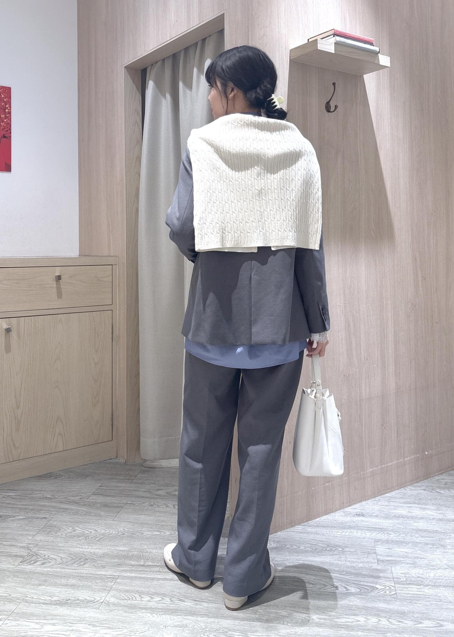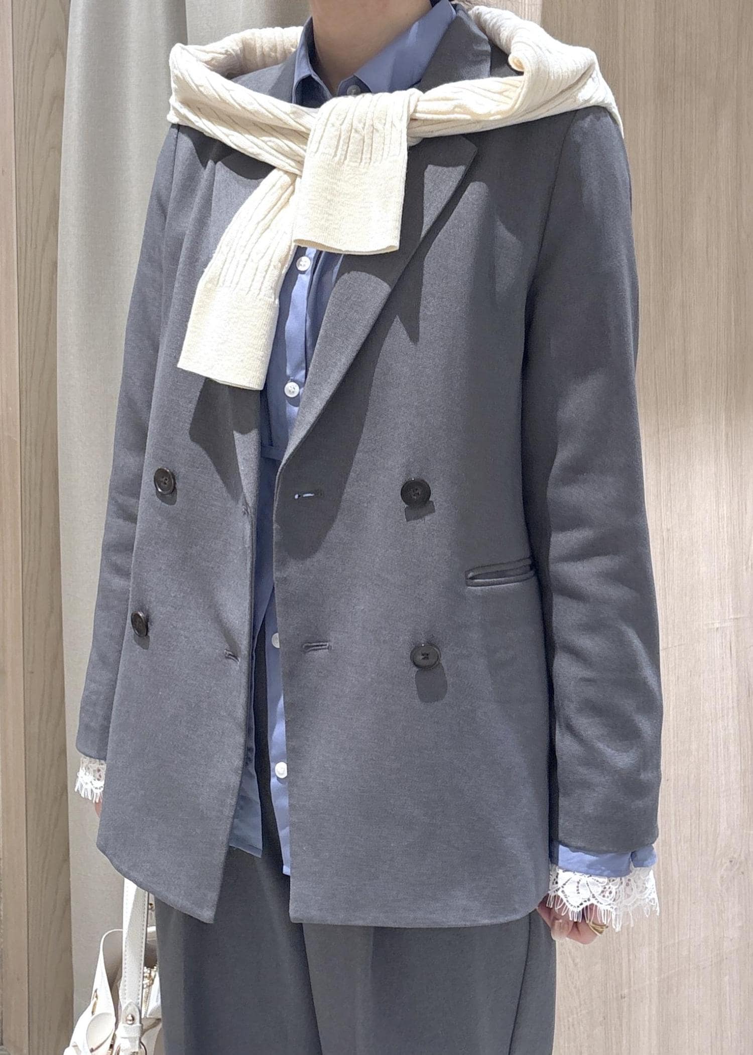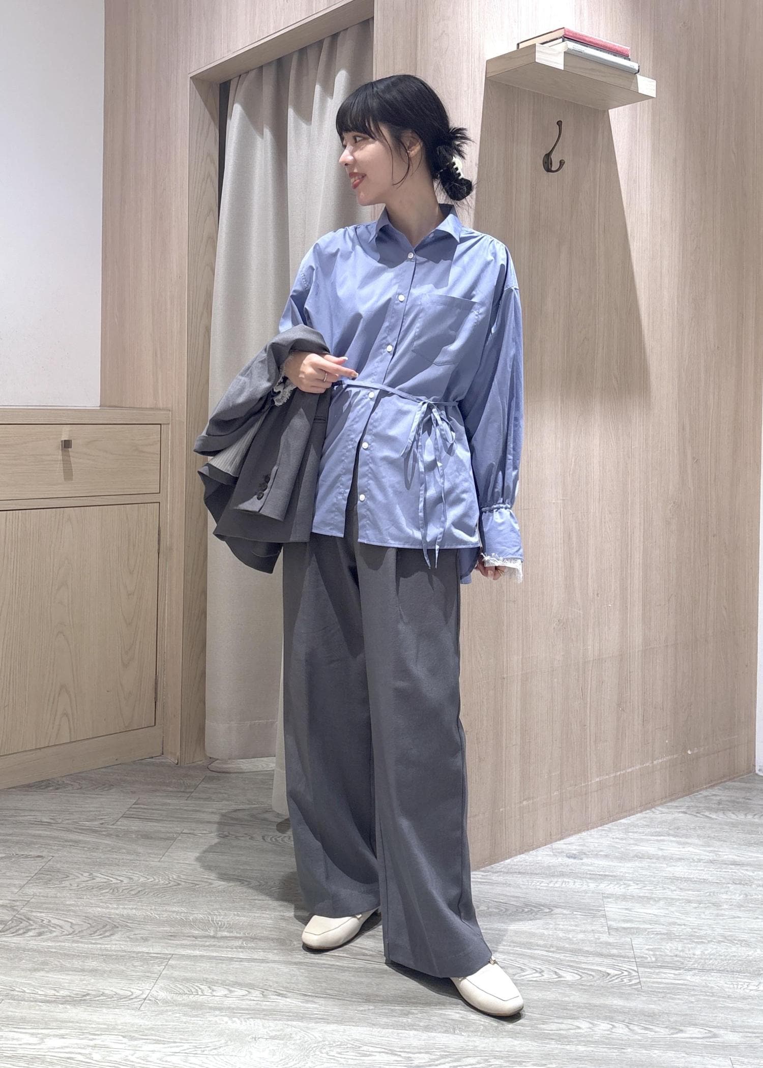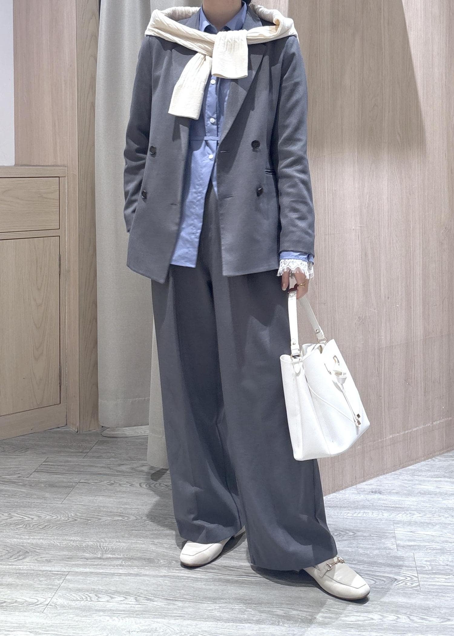 グレーセットアップ×ブルーブラウス