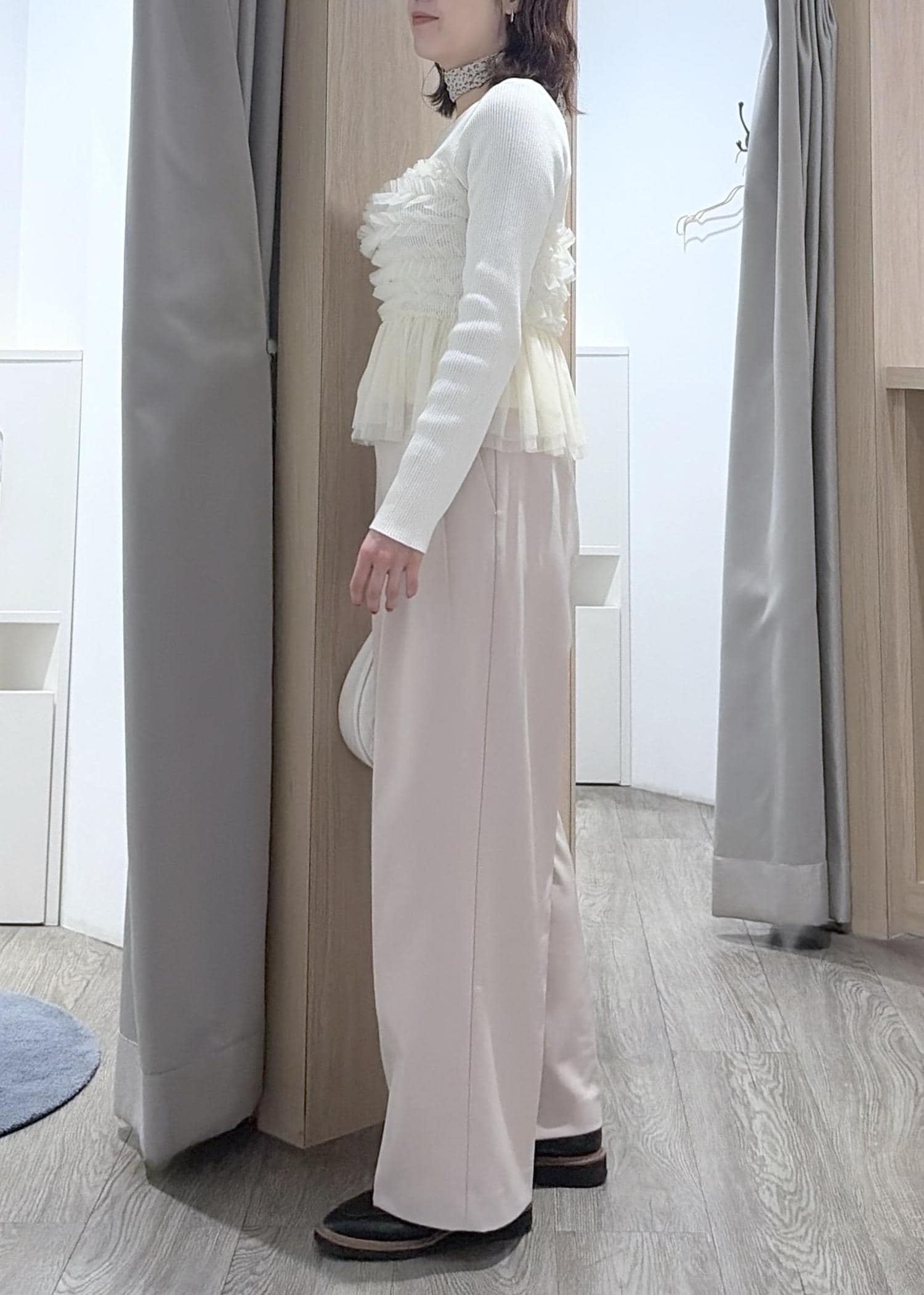 トップス、ボトム、バッグ共にホワイト系でまとめて春らしい