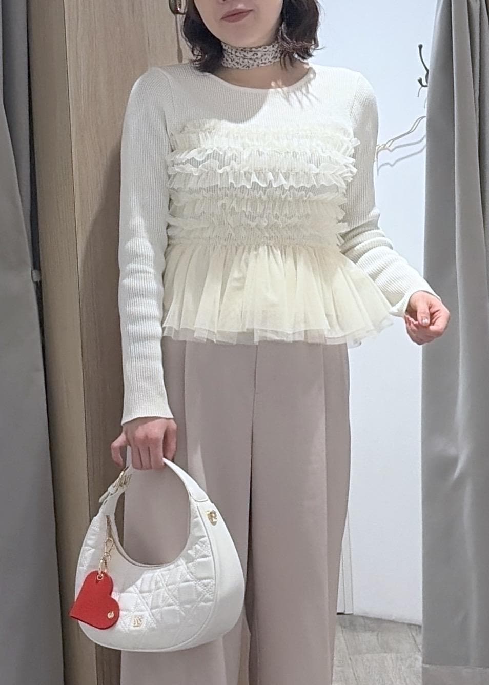 2BUY10%OFFVISチュールフリルドッキングニット/イージーケアオフホワイト / F¥6,589レビューチュールのビスチェがドッキングされているので立体感があり、シンプルながらも可愛さがあるトップスです。