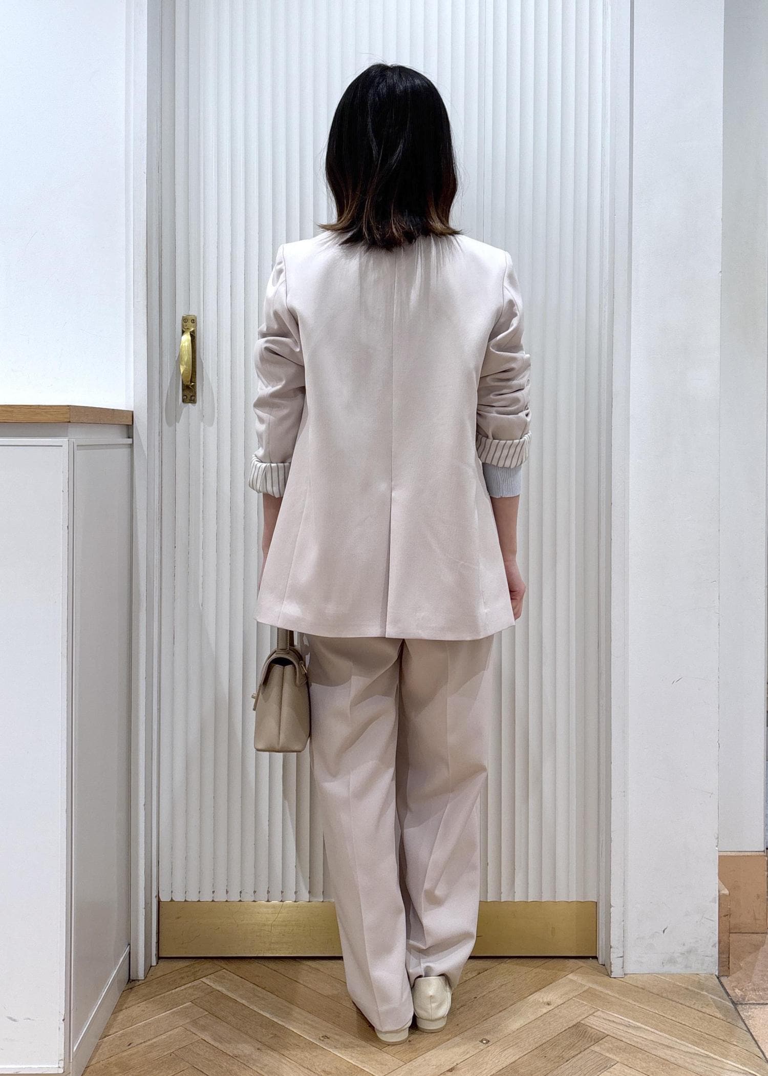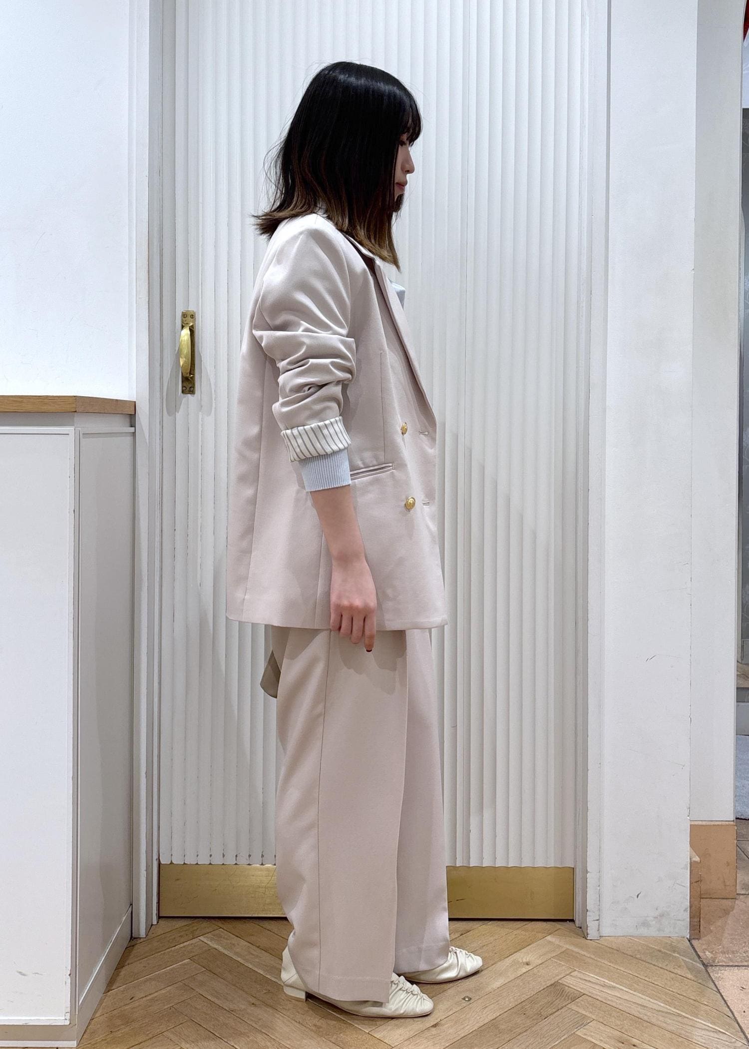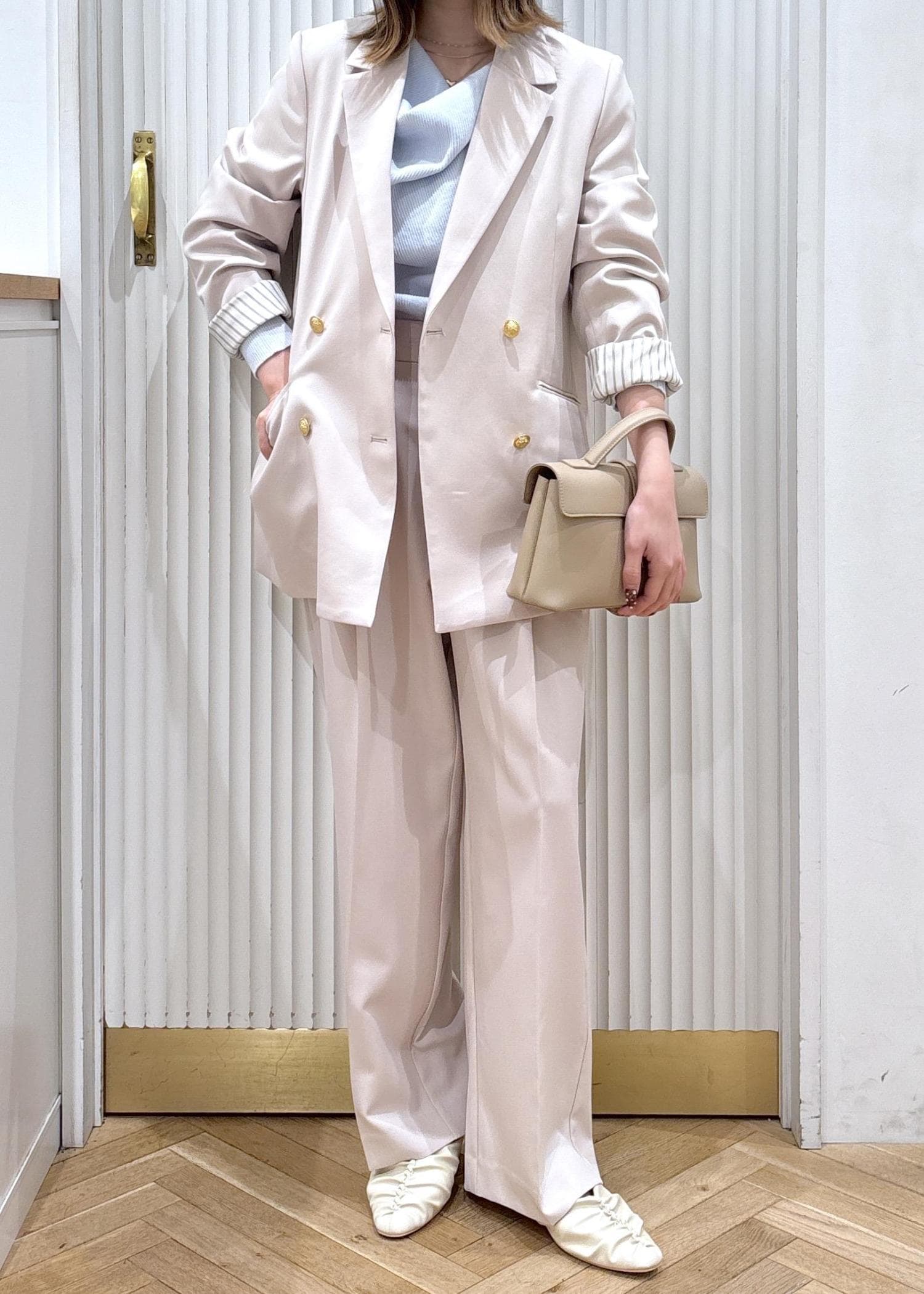 大人気美easyのコンフォートセットアップを使ったコーディネートです!中にドレープのニットを合わせることで上品さとラフさを両方プラスしジャケットを羽織っても脱いでも着映えするコーディネートになります!ベージュでワントーンにすることで華やかさがアップし、水色のニットが柔らかく発色することで春らしさも出ます☺︎