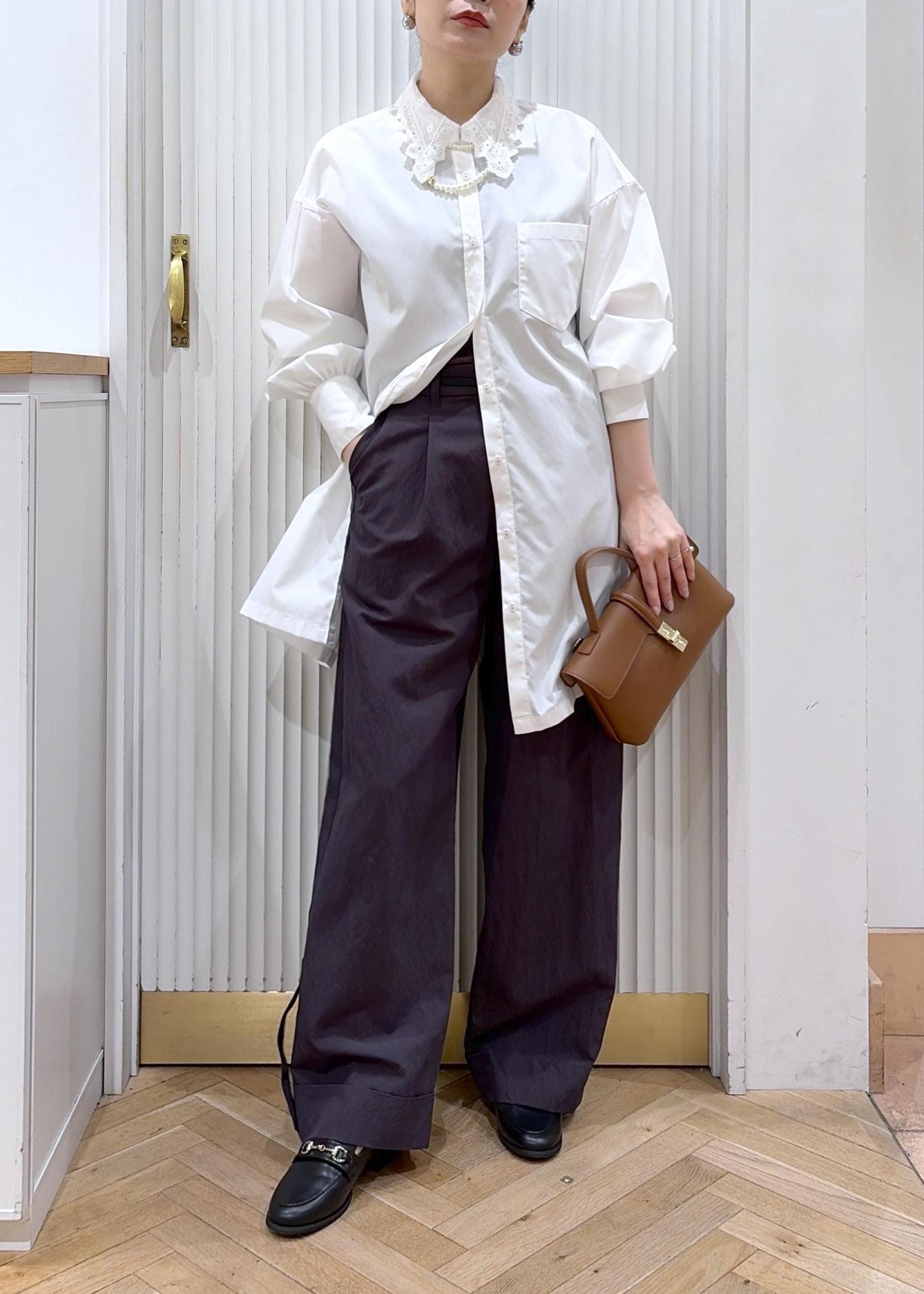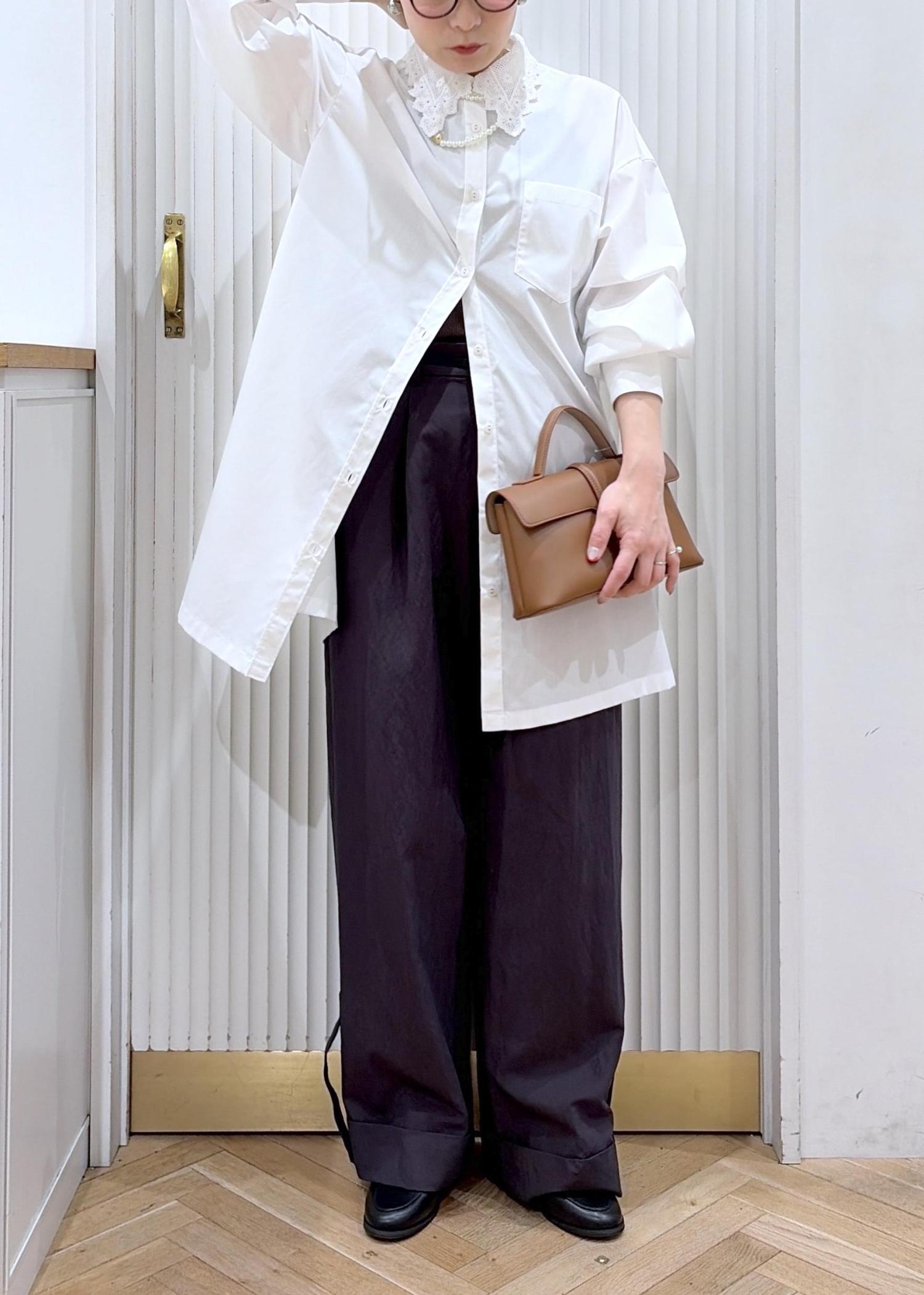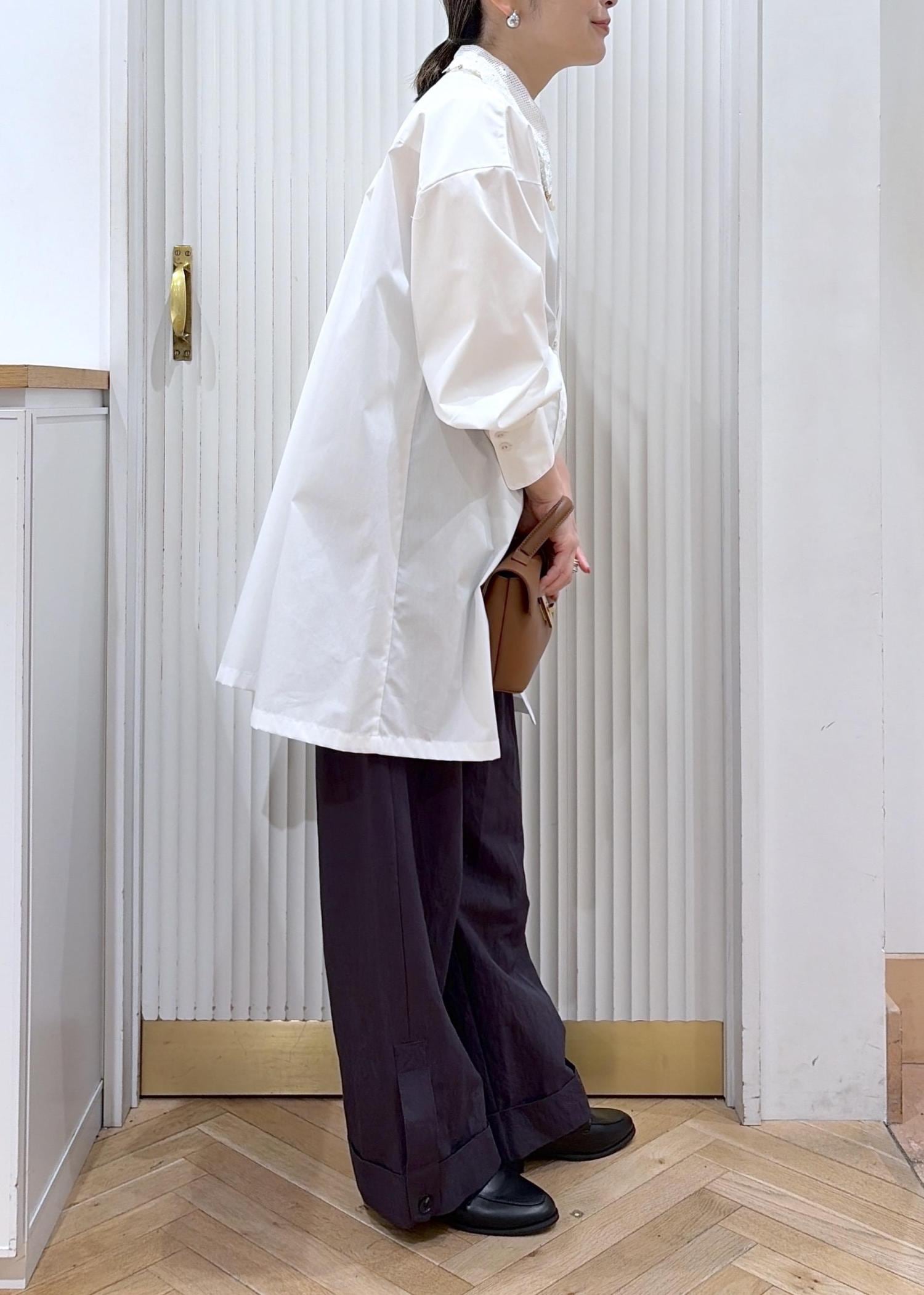 シャツワンピをラフにチュニックシャツとしてワイドパンツと掛け合わせたカジュアルスタイル。