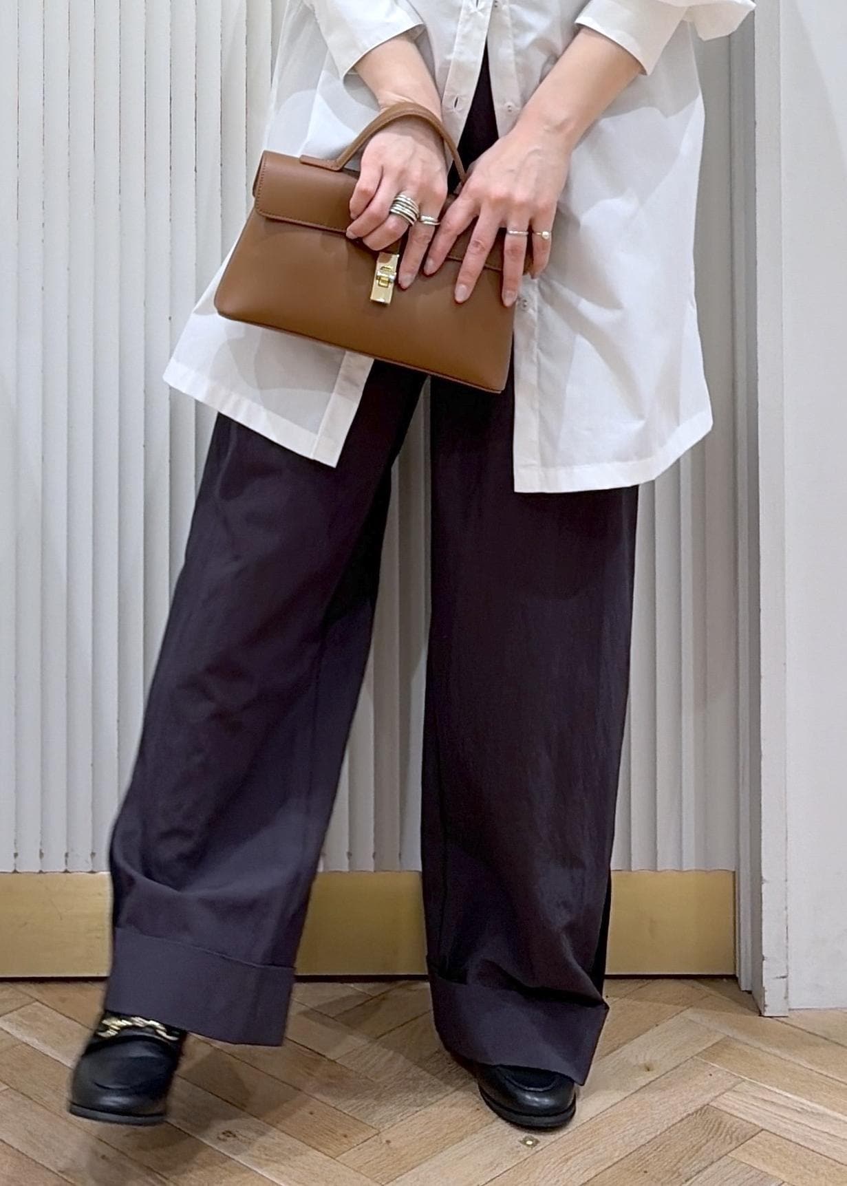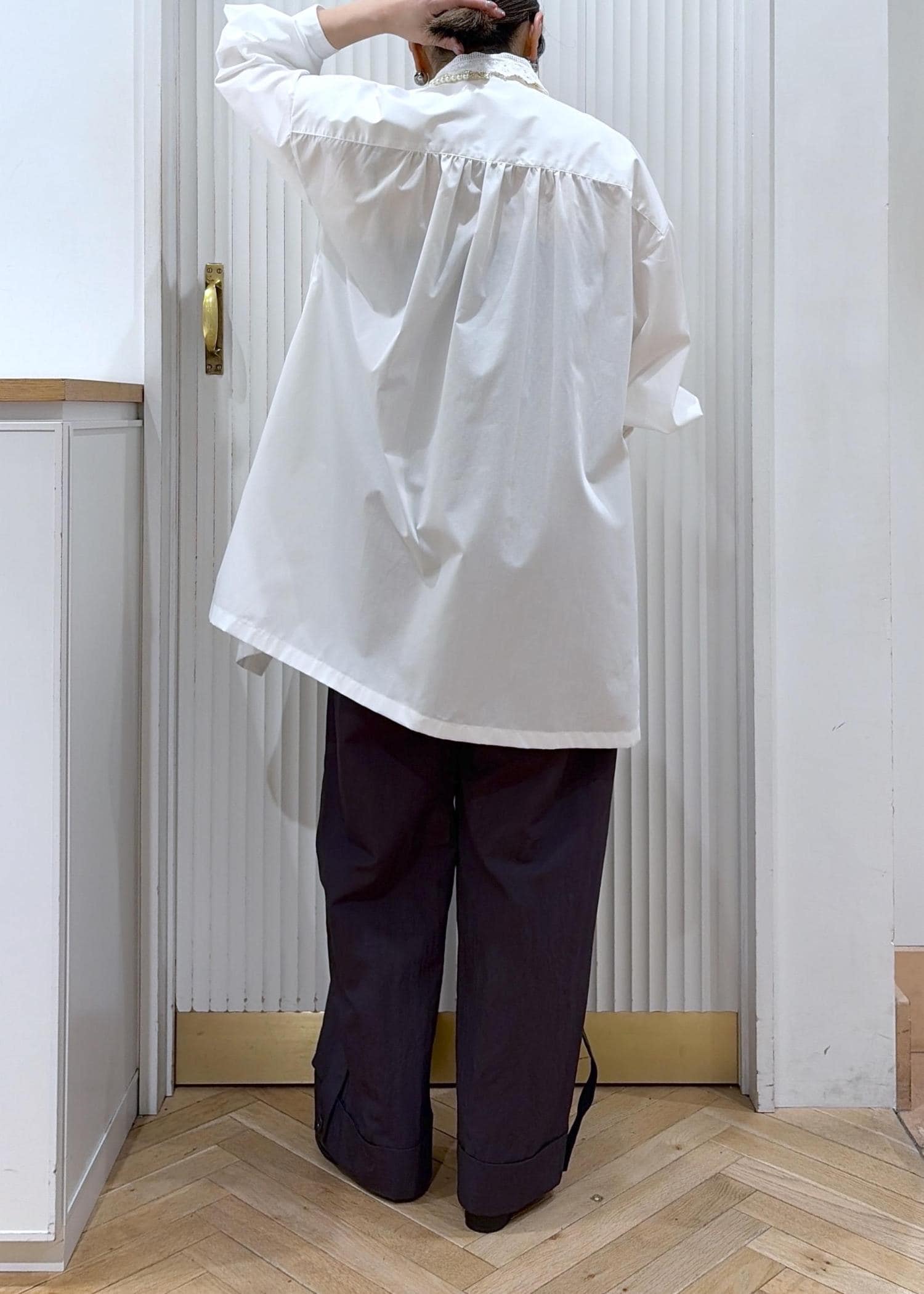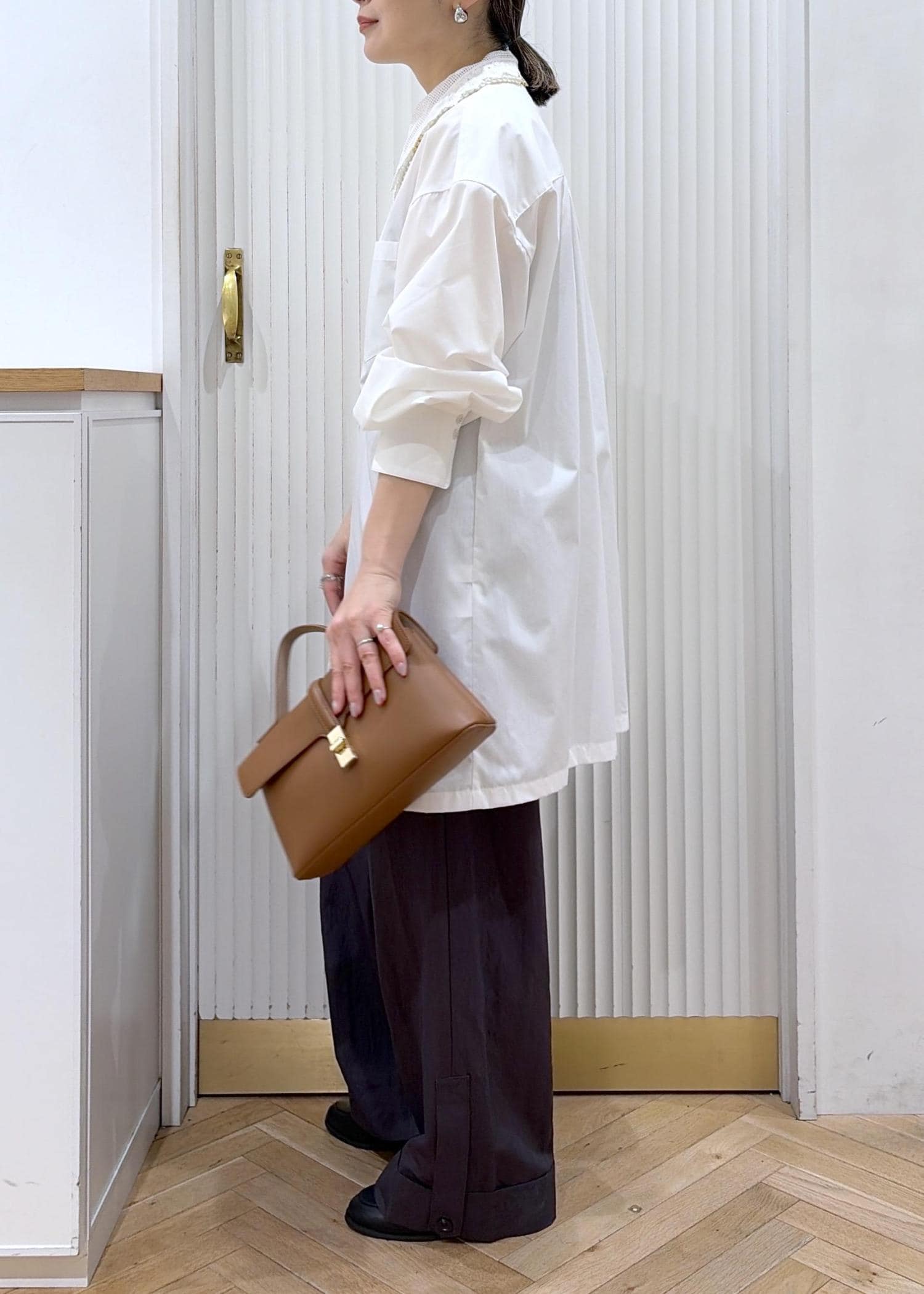 シャツワンピをラフにチュニックシャツとしてワイドパンツと掛け合わせたカジュアルスタイル。
