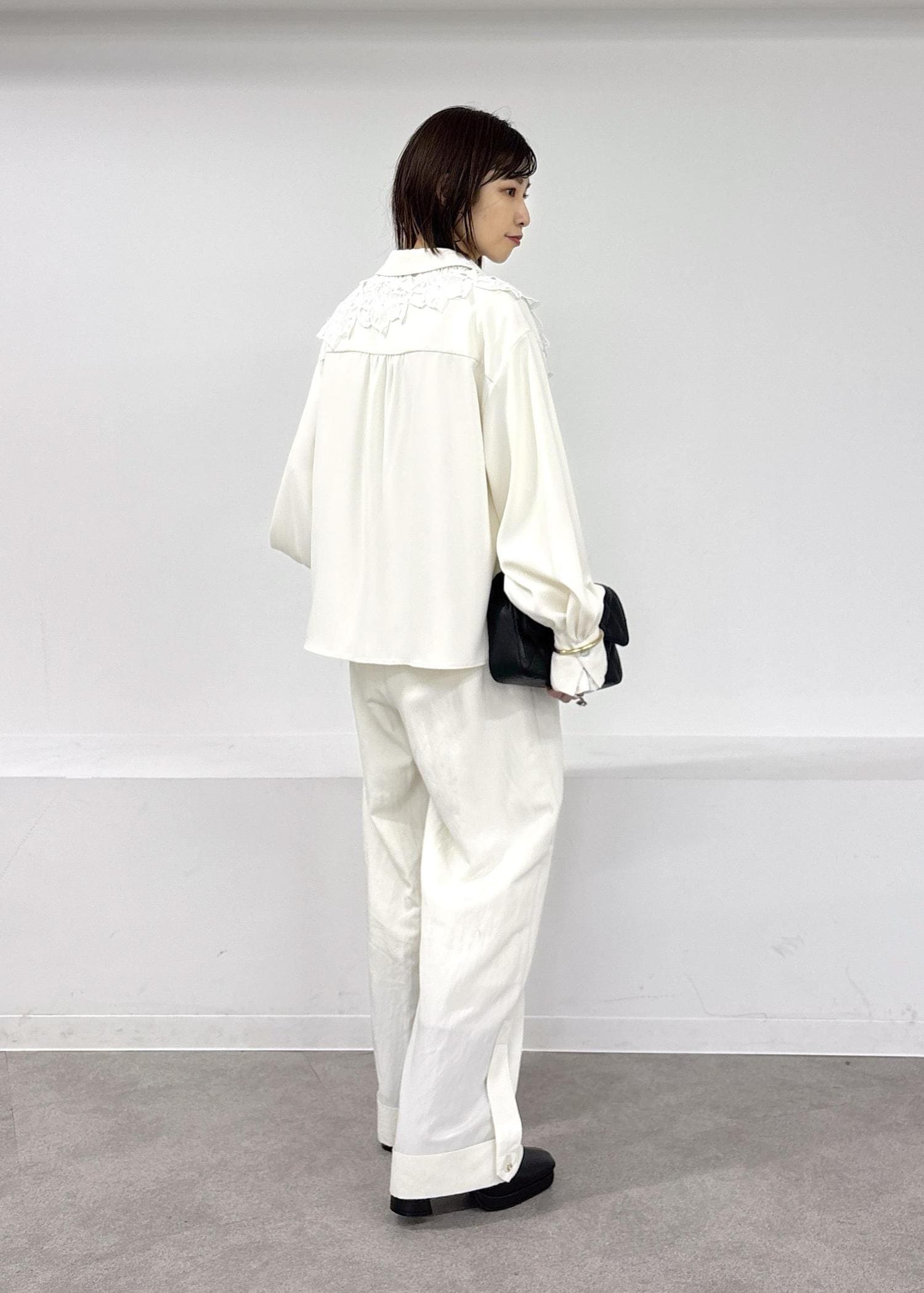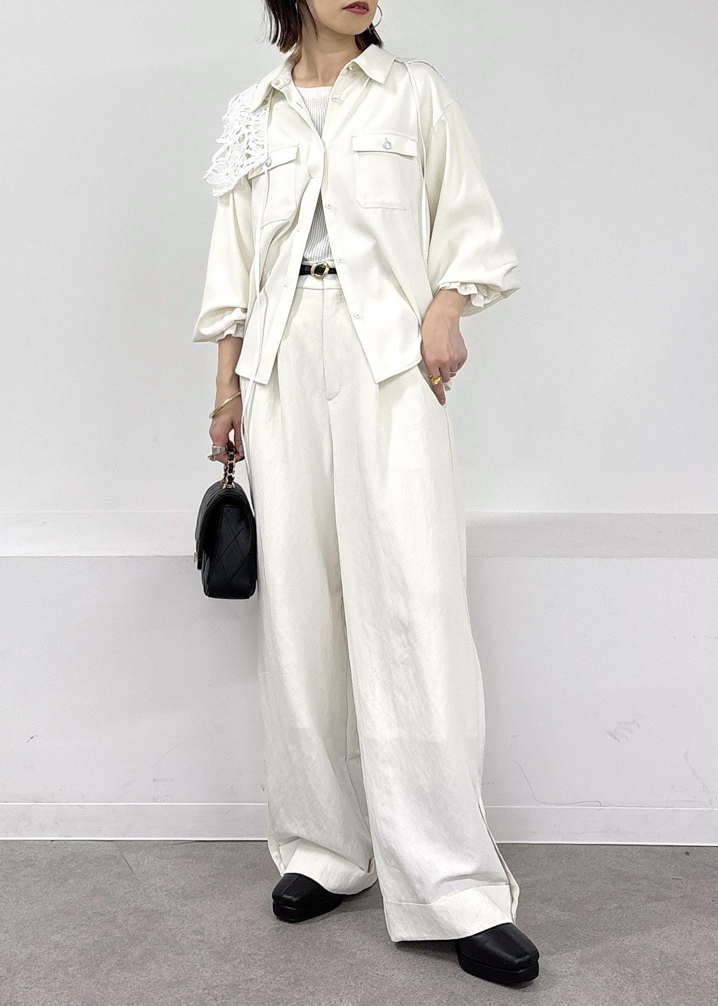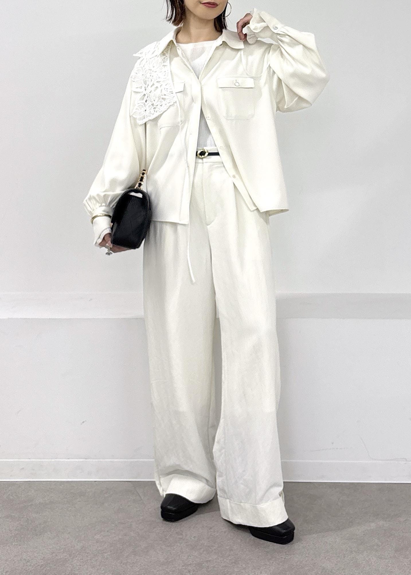 暖かくなってきたら、やっぱりホワイトのワントーンスタイルがしたくなる♪とろみシャツとワイドパンツ、今年らしいレース襟を肩掛けしてアクセントに◎小物はブラックでまとめた春の大人カジュアルコーデ。