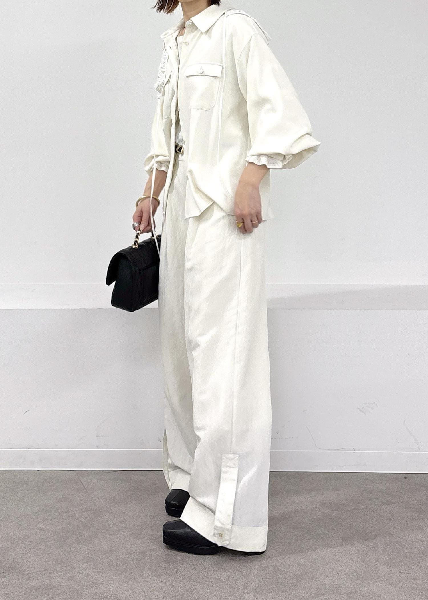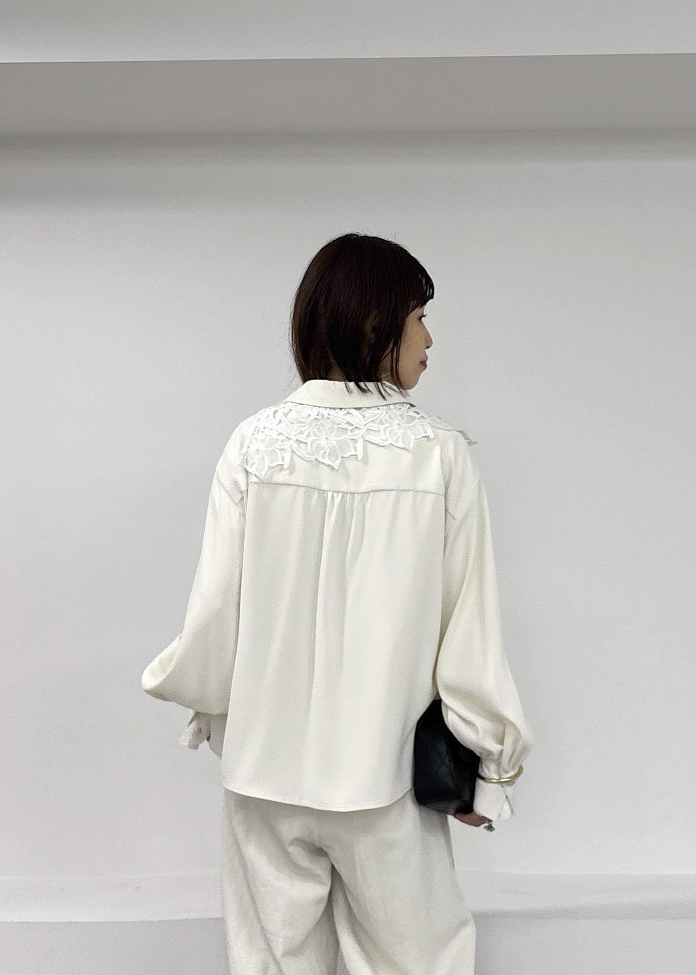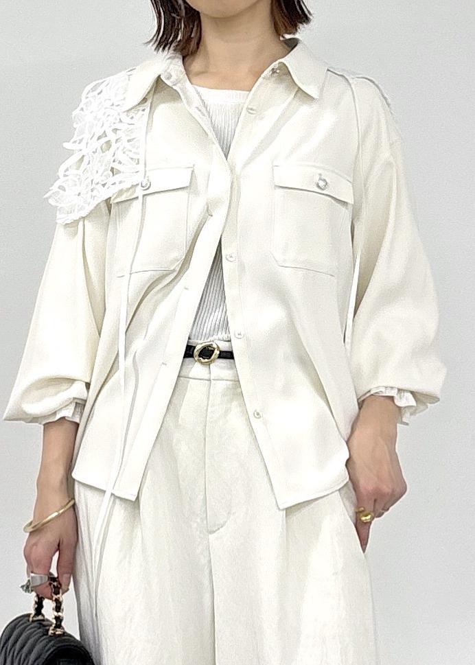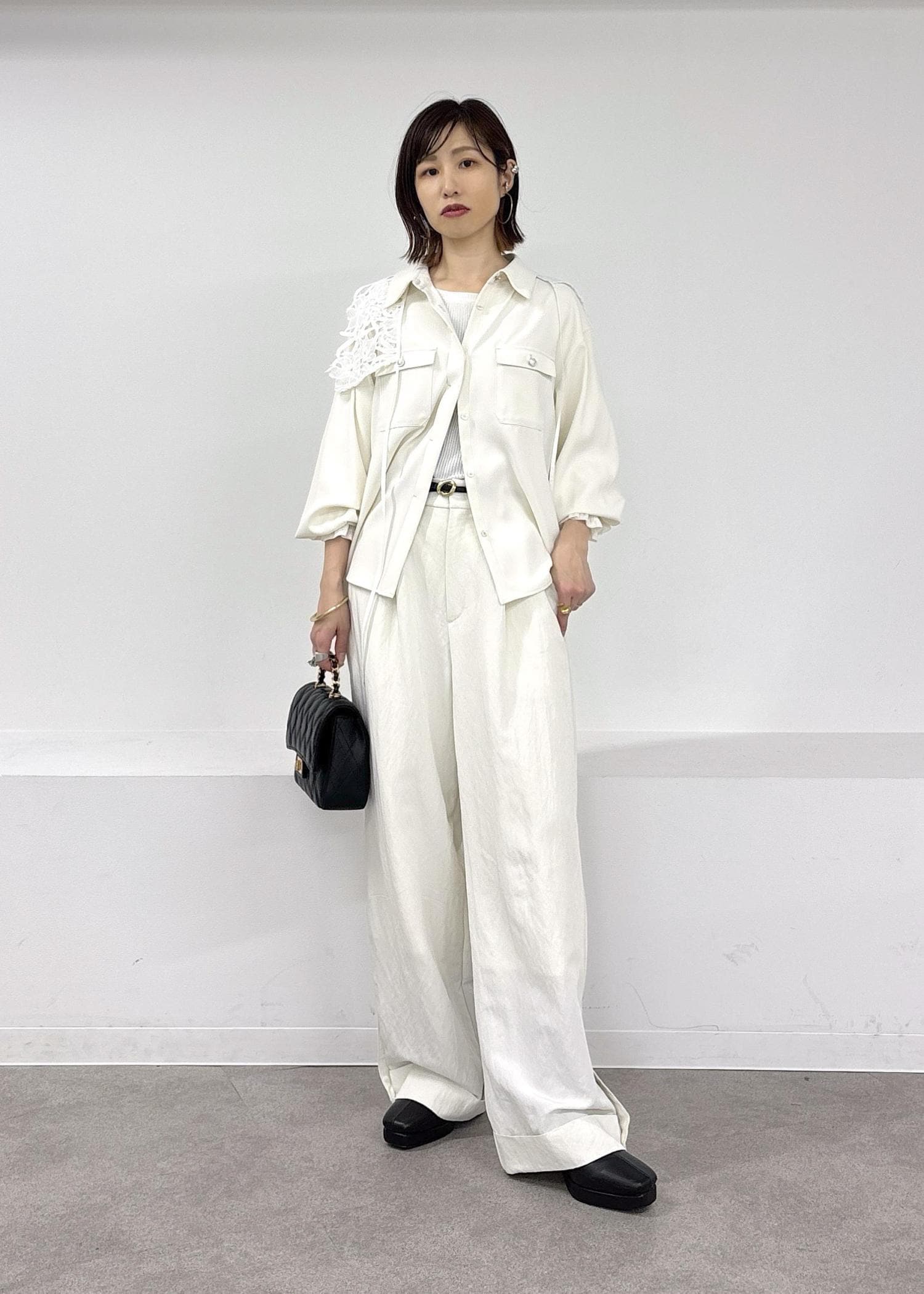 暖かくなってきたら、やっぱりホワイトのワントーンスタイルがしたくなる♪とろみシャツとワイドパンツ、今年らしいレース襟を肩掛けしてアクセントに◎小物はブラックでまとめた春の大人カジュアルコーデ。