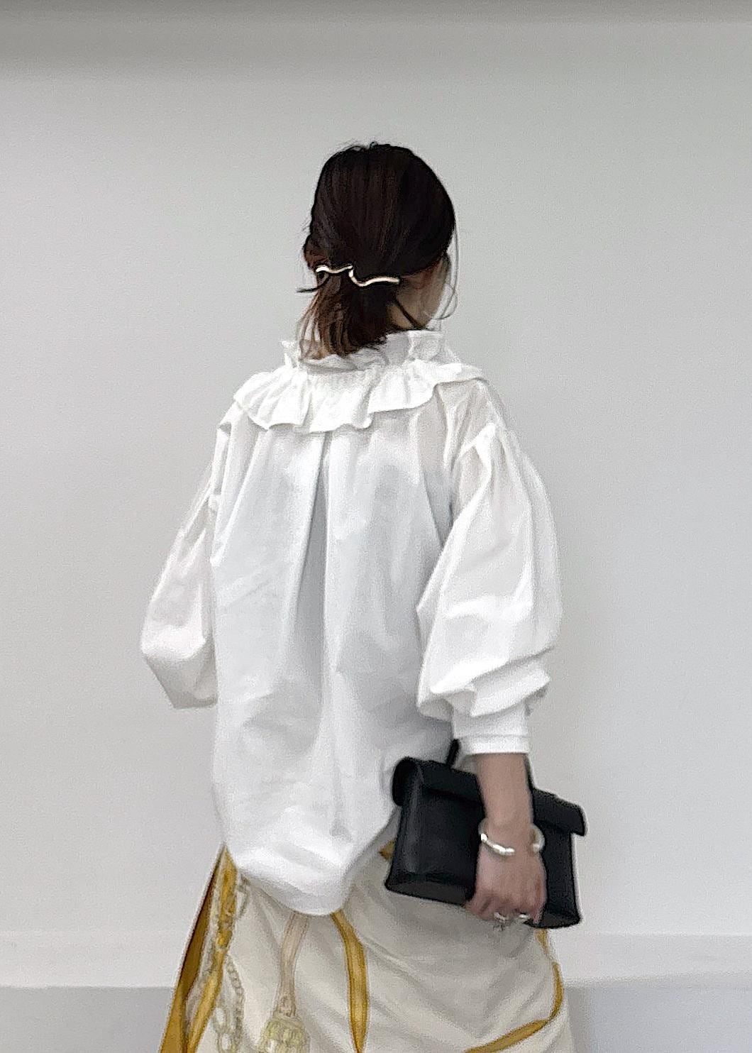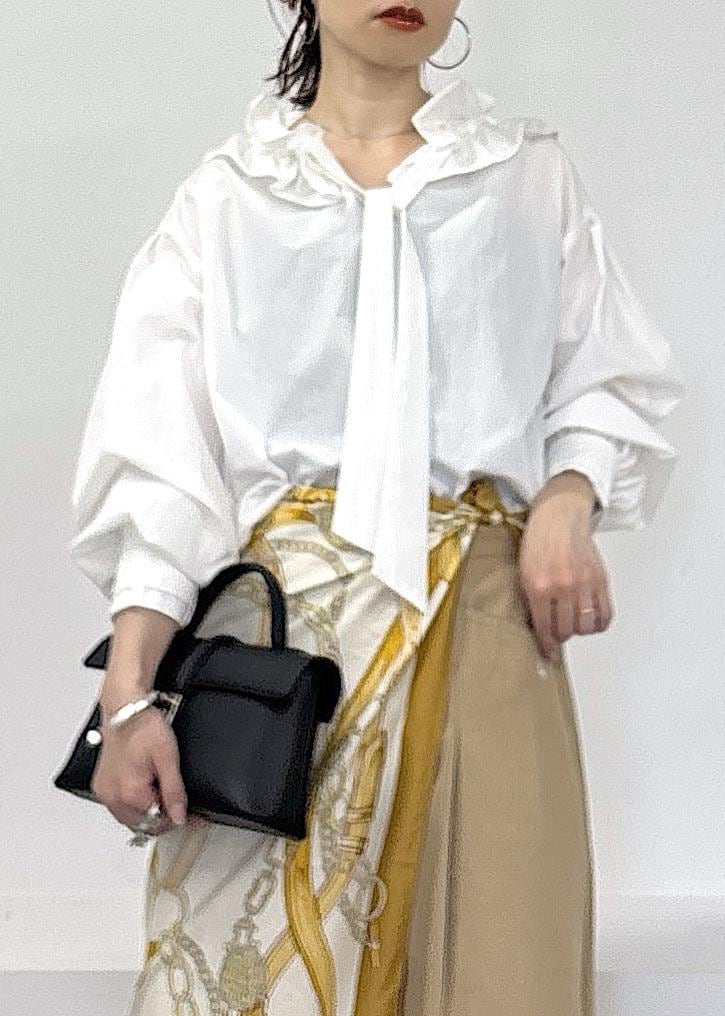予約VISフリルネックブラウスオフホワイト / F¥6,589レビュー大きめフリルがポイントのブラウス♪襟元にデザインがあるので華やかな印象に、一枚で着映えします。綿素材が多く使用しているのでさらっとした着心地、締め付けすぎないシルエットがとても着やすいです◎全体的にややゆったりめ、着丈は腰が隠れる長さでした。