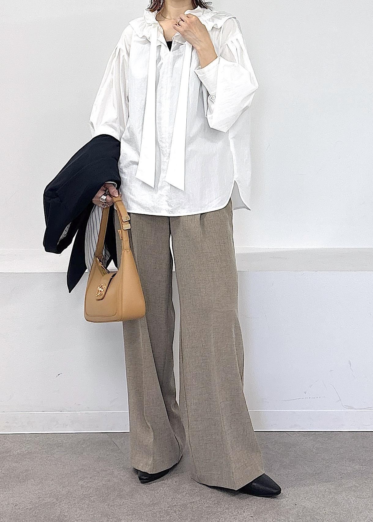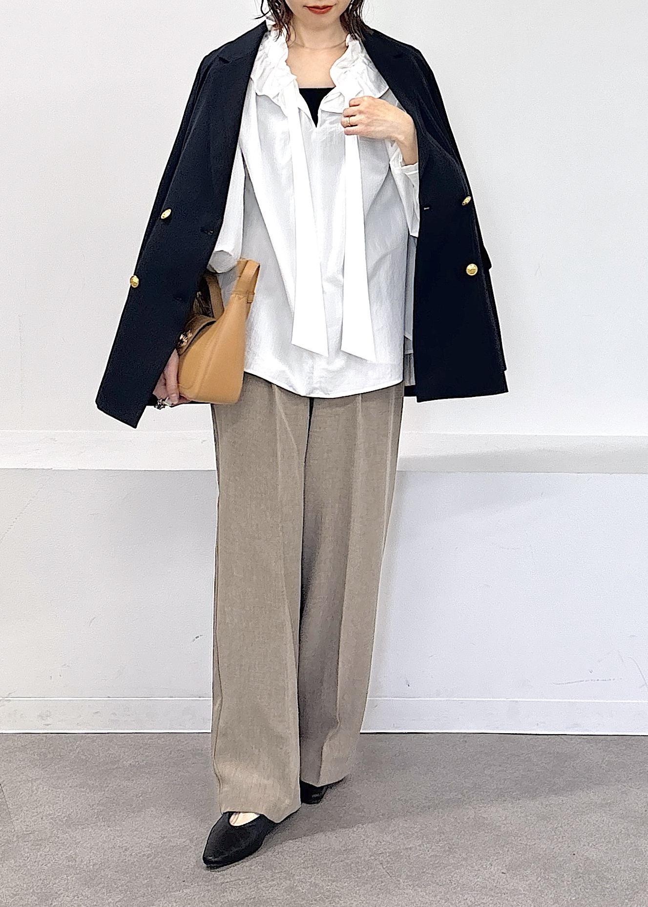 少しずつ暖かい日も増えてきて、春のお仕事スタイルにお悩みの方へオススメのきれいめコーデ♪ネイビーのジャケットは一枚でキチンと見えする印象で、今年らしいフリルブラウス、柔らかなベージュカラーのワイドパンツでまとめました◎春にオススメのオフィスカジュアルコーデ。
