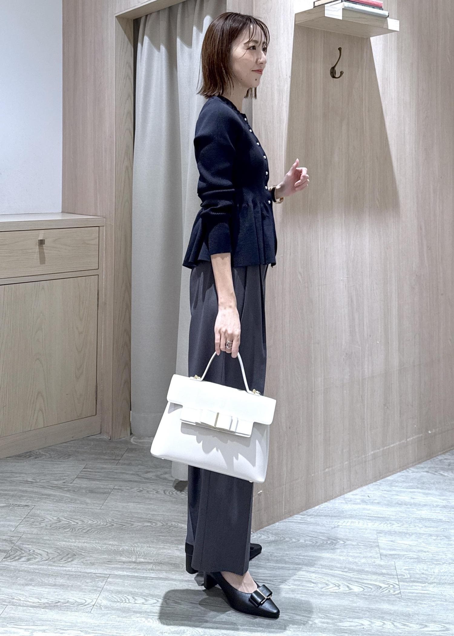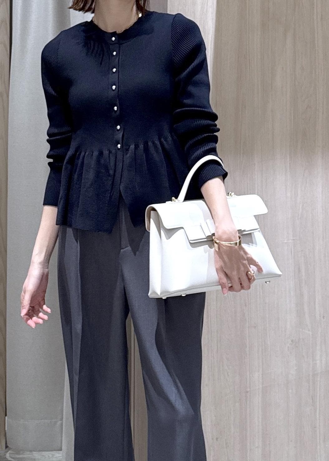 ペプラムシルエットが可愛いニットにスラックスを合わせたオフィスカジュアルコーデです!