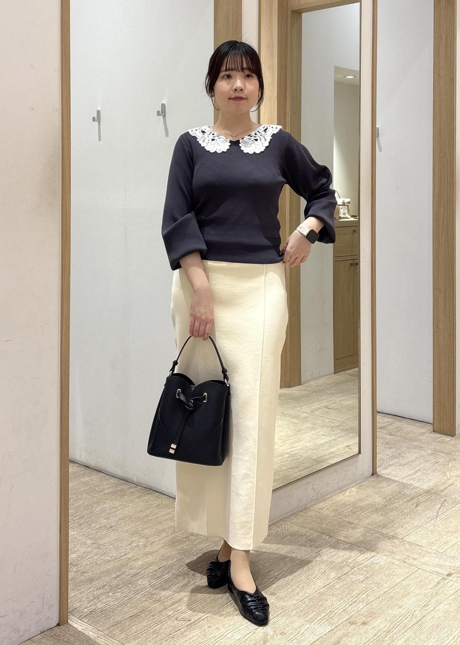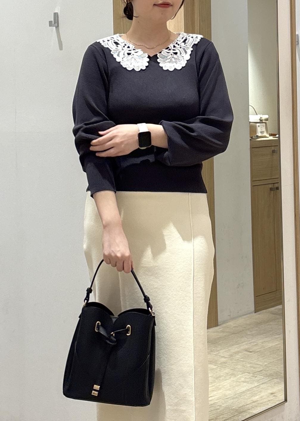 大きめのレース襟がポイントになっていて、肩周りや首元にフェミニンで品のある印象をプラス。襟レースのおかげで、ジャケットやカーデのインナーとしても活躍し、1枚で主役級に使えるのが強みです! -