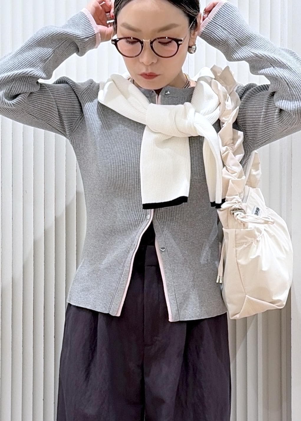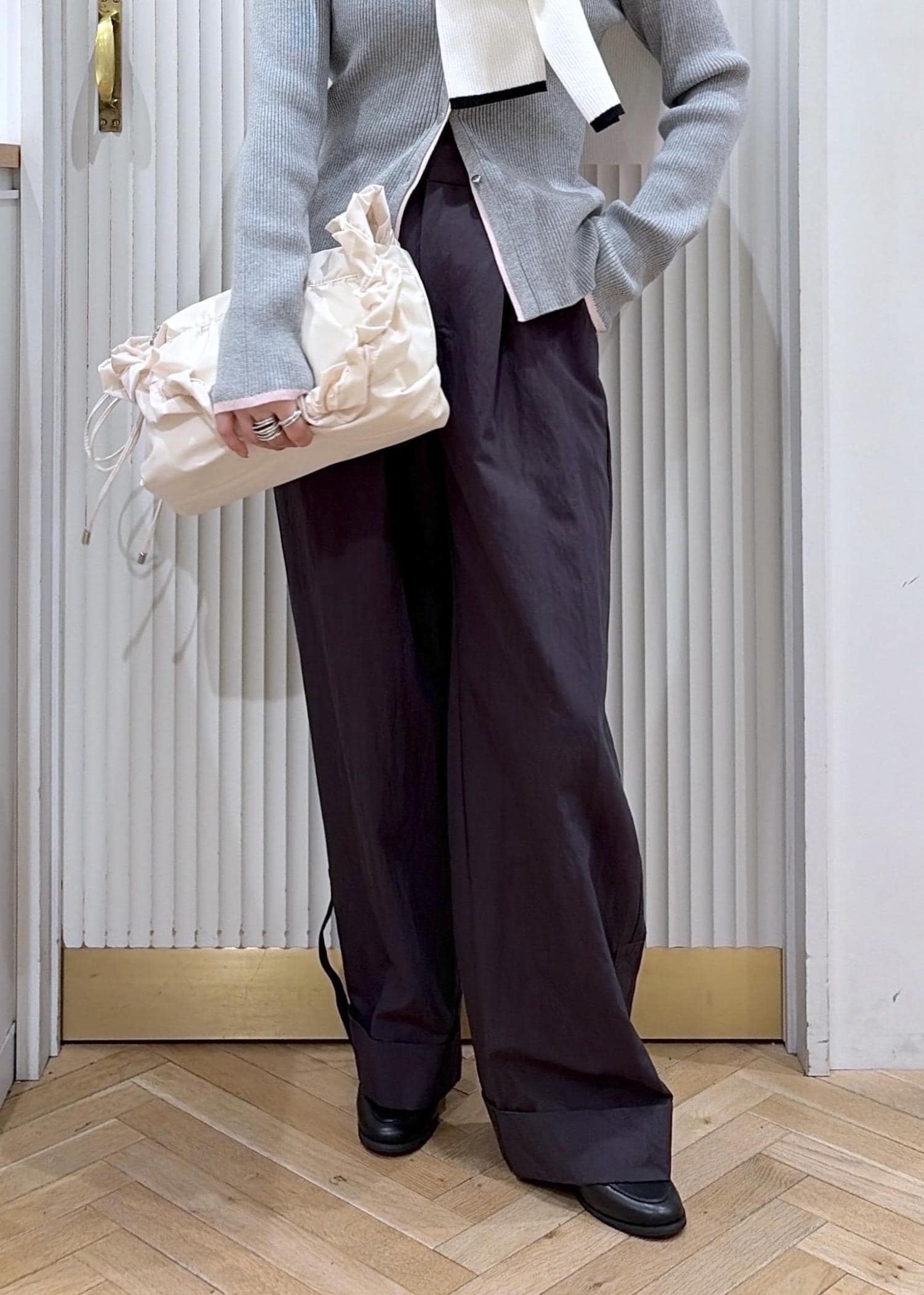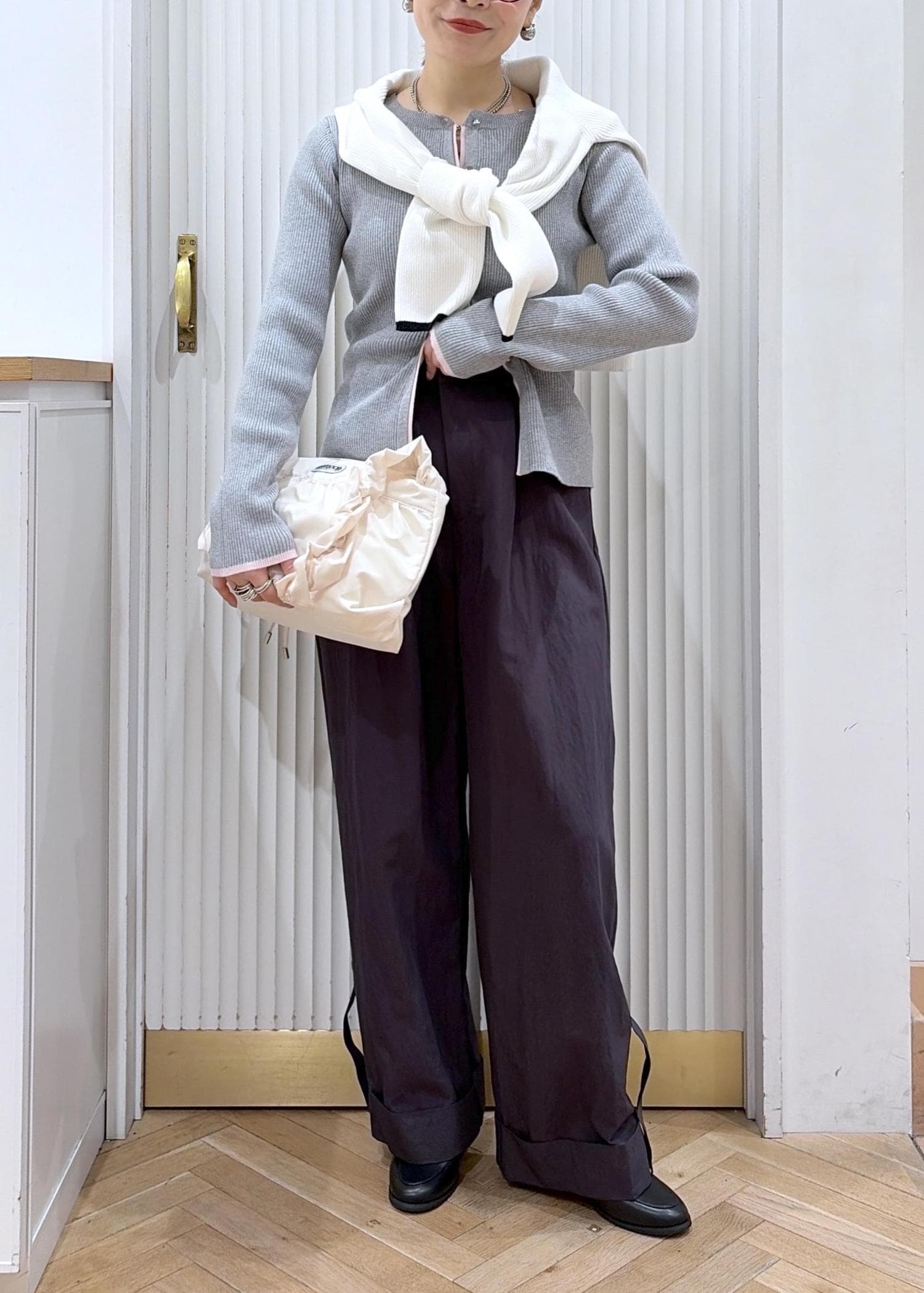 ワイドパンツに合わせて大人カジュアルにまとめたコーディネート。