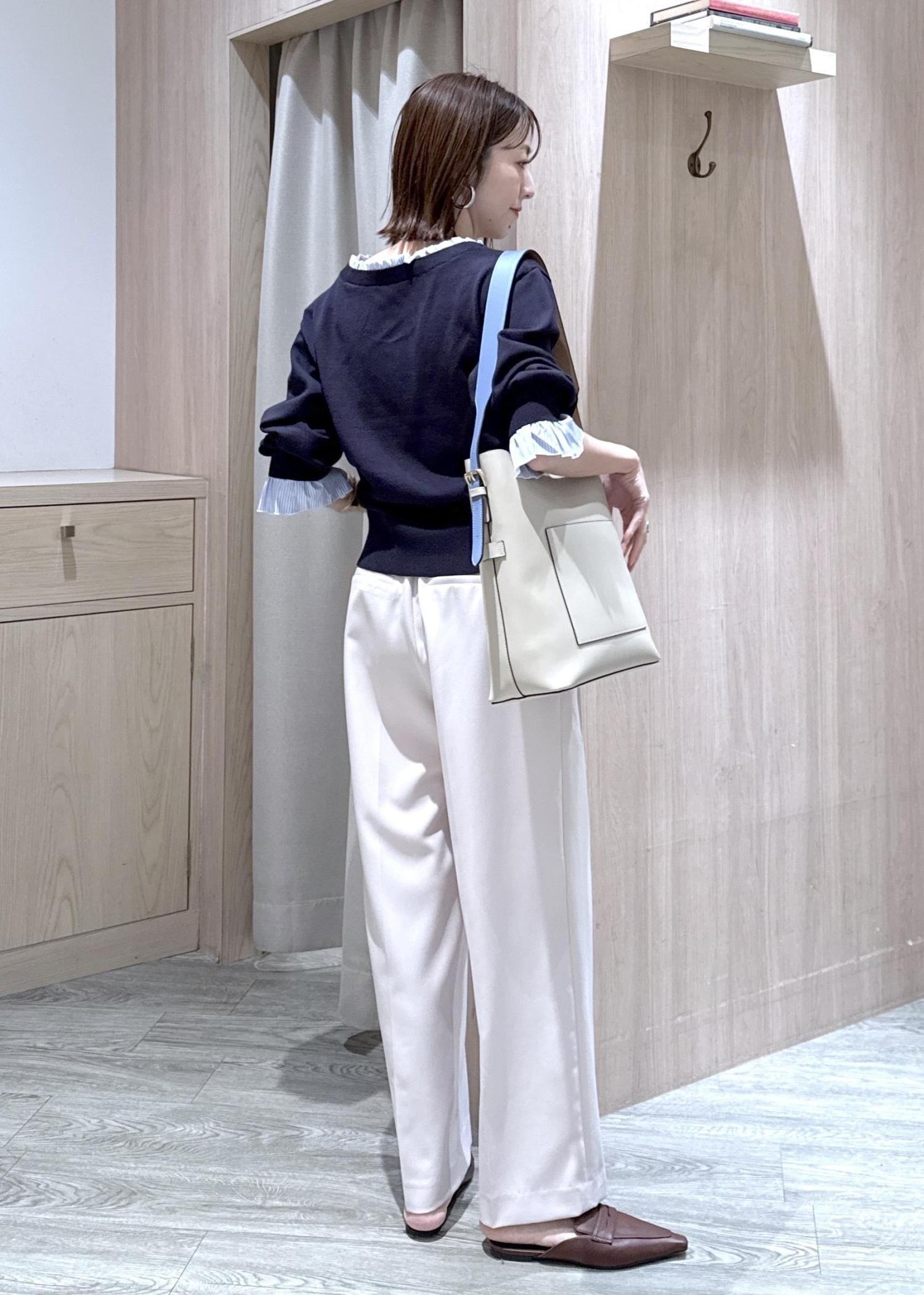 1枚でオシャレ見えが叶うフリルニットで、きれいめカジュアルな通勤スタイルにしました⭐︎