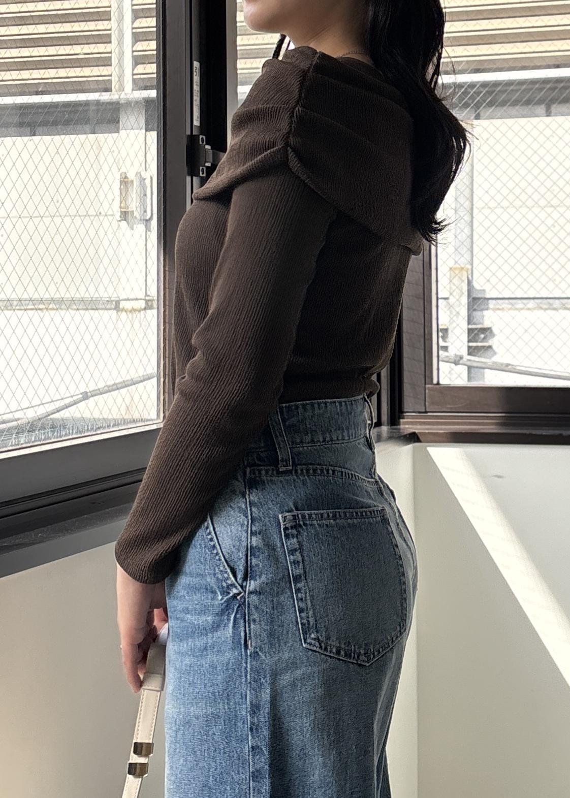 NEW! 予約VISジャガードオフショルプルオーバー/イージーケアブラウン / F¥4,939レビューくしゅっとギャザーが入ったオフショルダートップス。