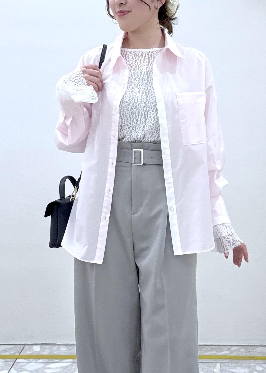 ピンクのシャツにレーストップスをレイヤードした春コーデ!