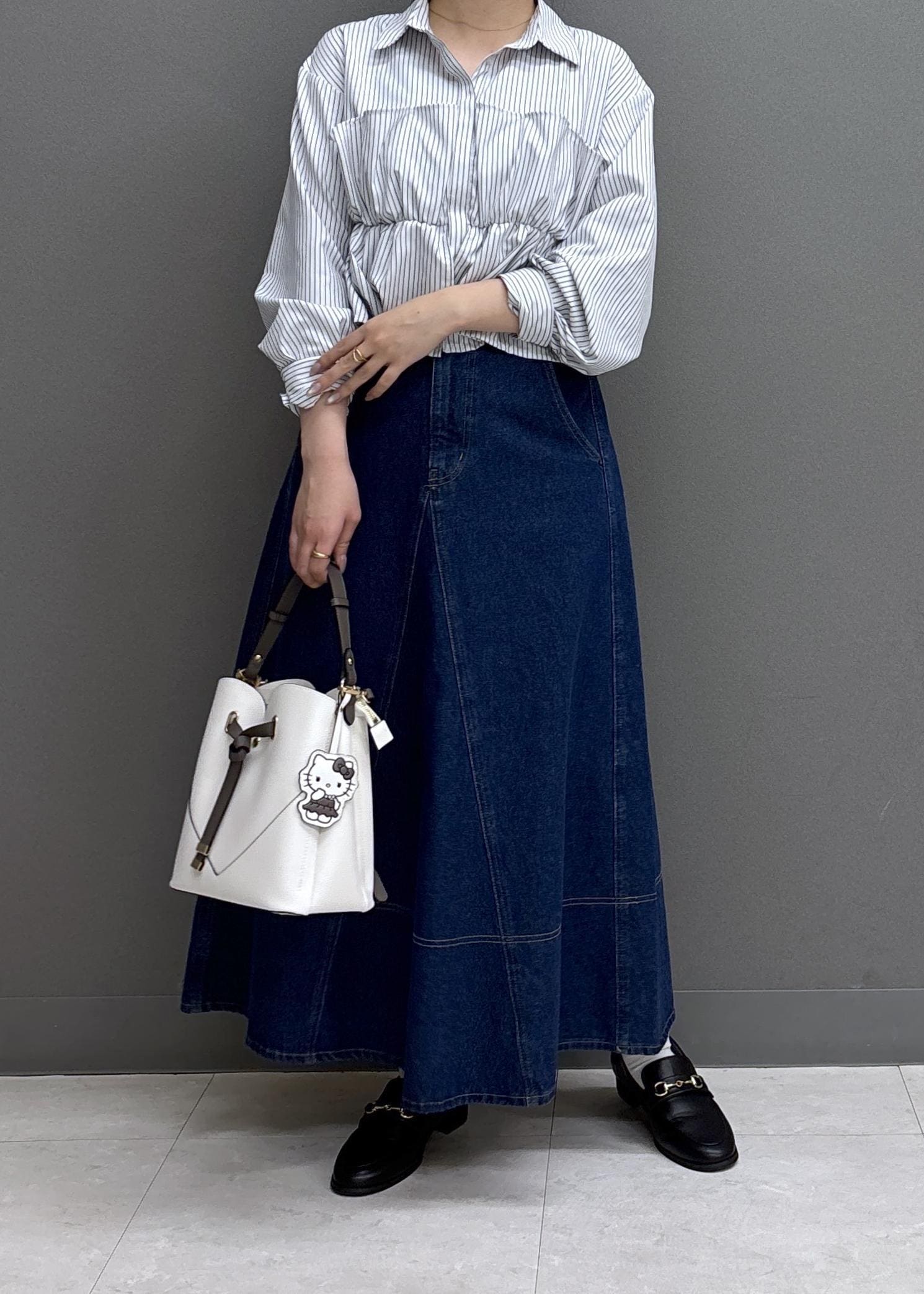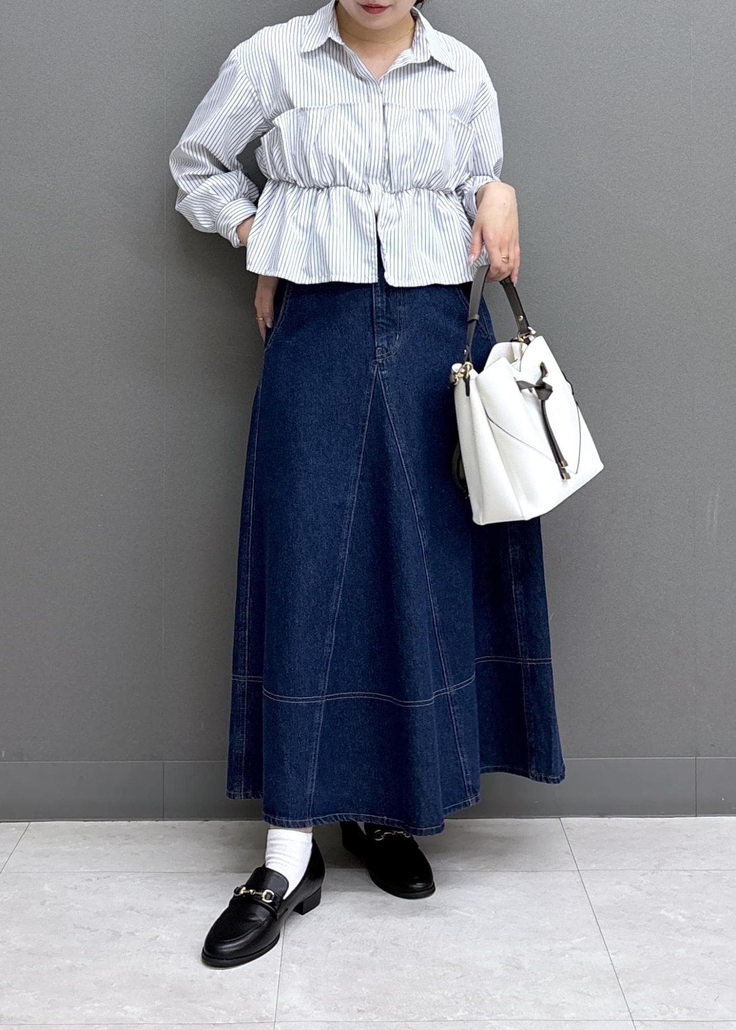 VISバックレースアップフレアデニムスカート/イージーケアブルー / M¥8,899レビュー160㎝ / Mサイズ着用、ウエスト周りは程よくゆとりあり。後ろがバックレースデザインなので、ぎゅっと結んで調整できました!デニム特有の固さはなく、軽い履き心地!綺麗に広がるフレアシルエットで身体のラインを拾いにくいサイズ感です◎