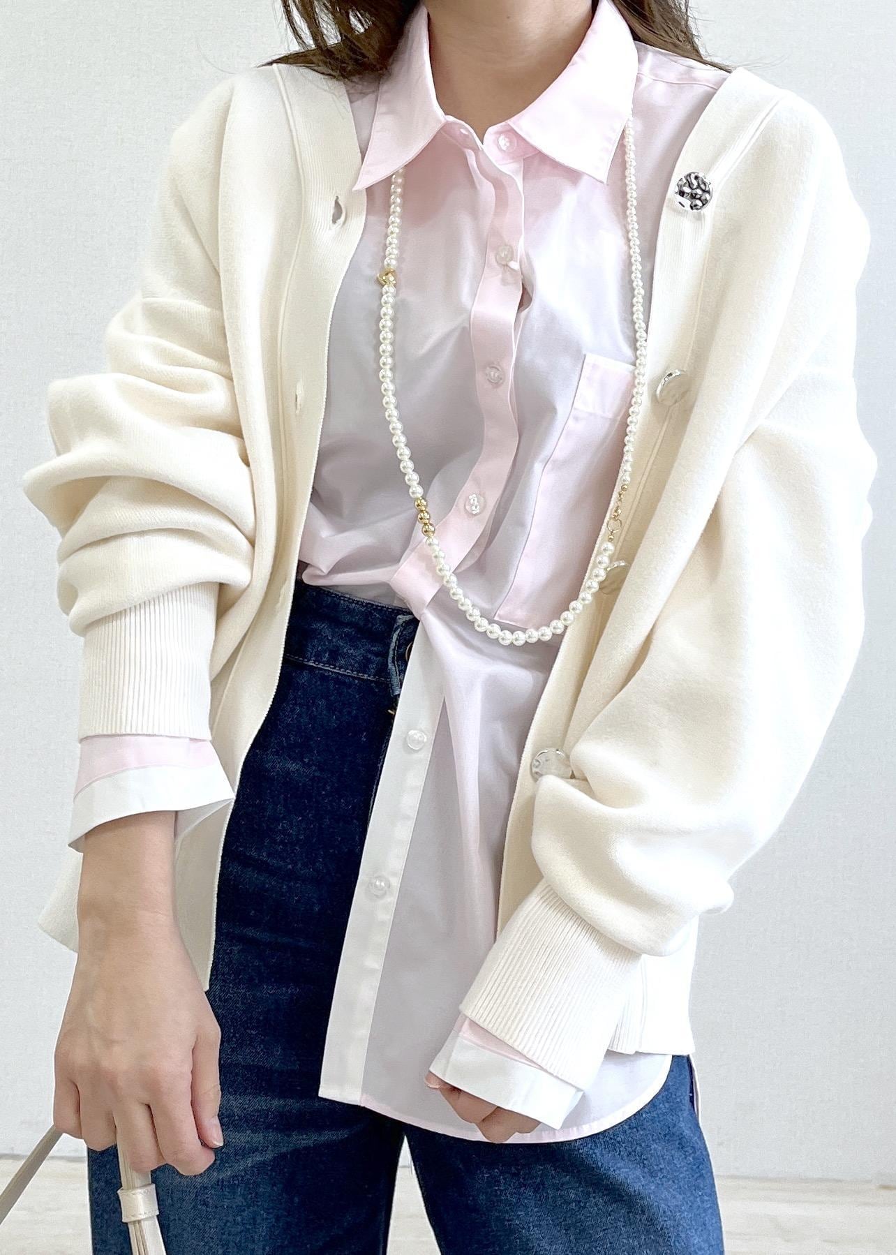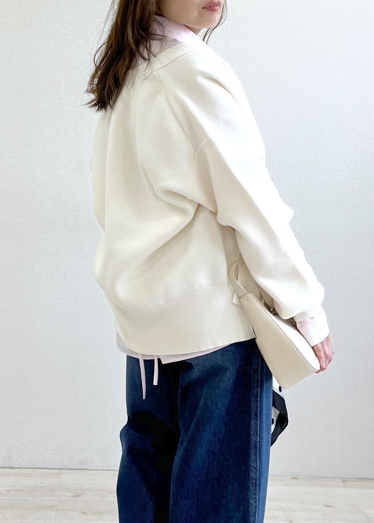 ハリ感のあるシャツに、ニットカーデをレイヤードして