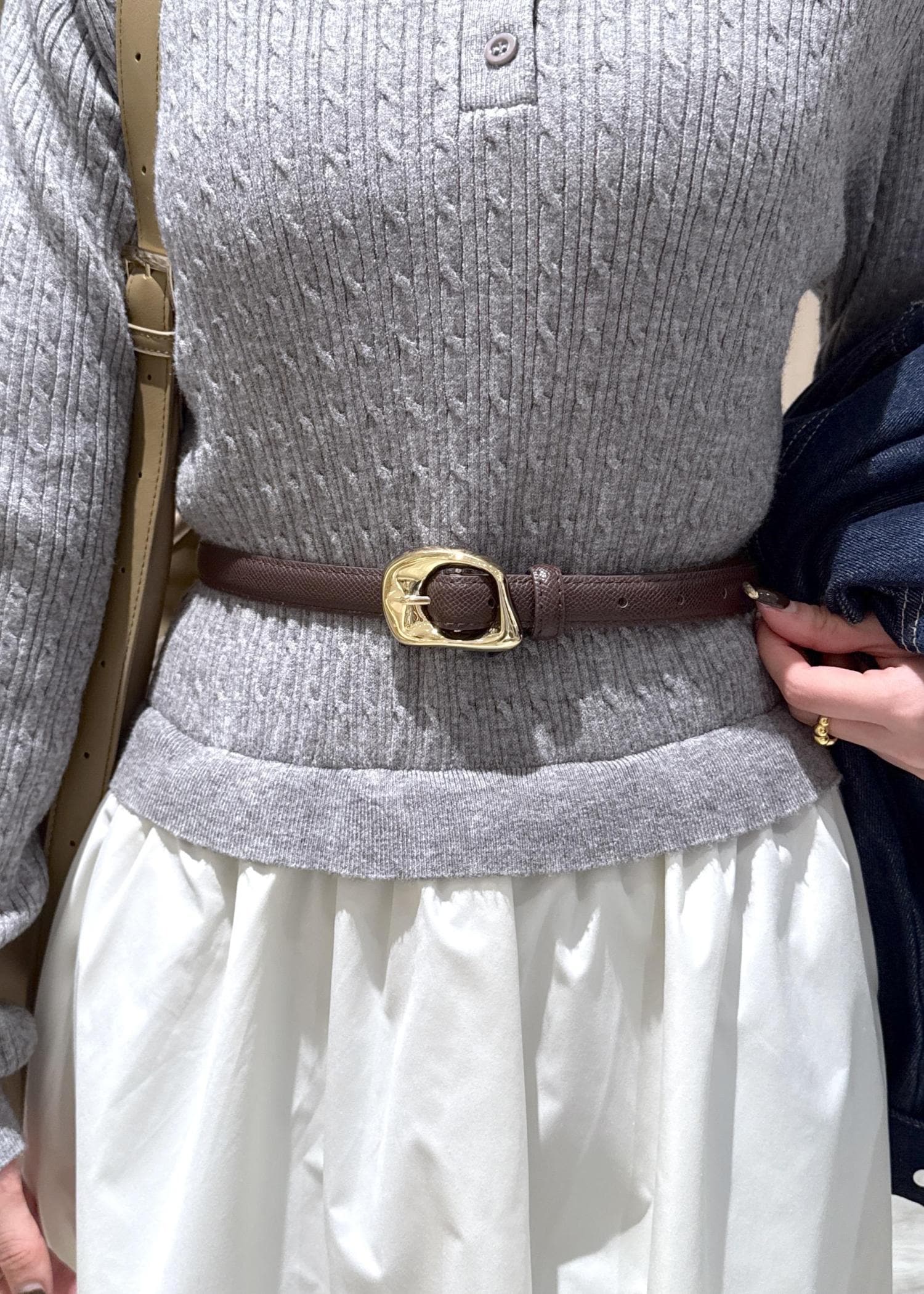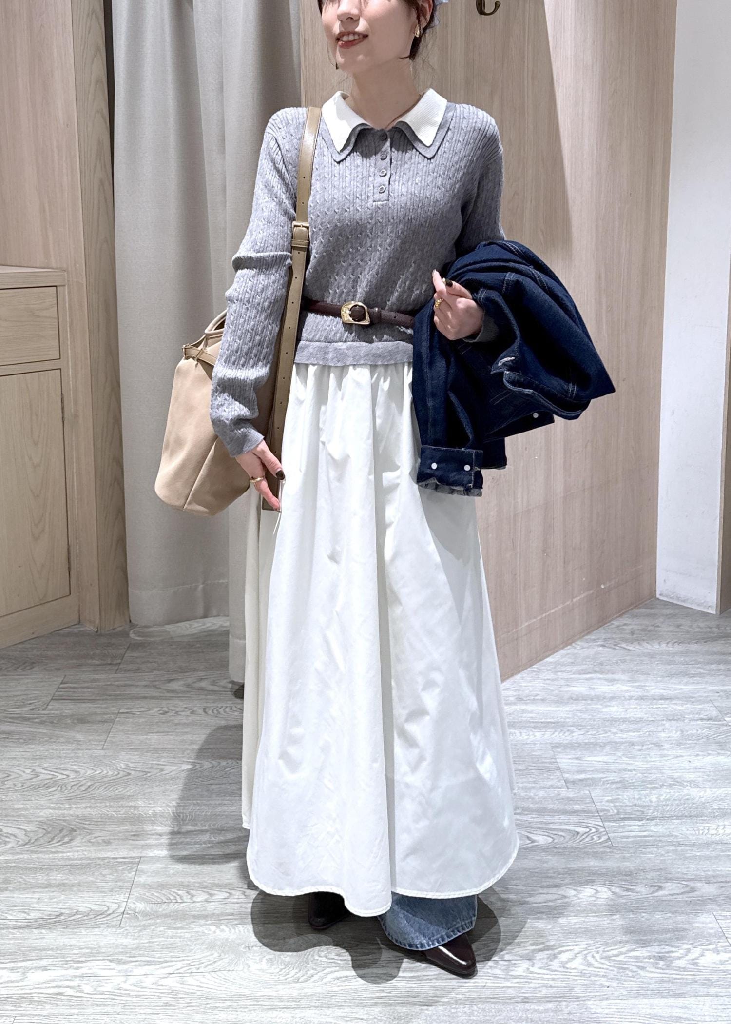 トップスはケーブル編みのニットで、程よくラインを拾うサイズ感です。スカートはサラッとシャリ感のある素材で、春にピッタリ♡ -