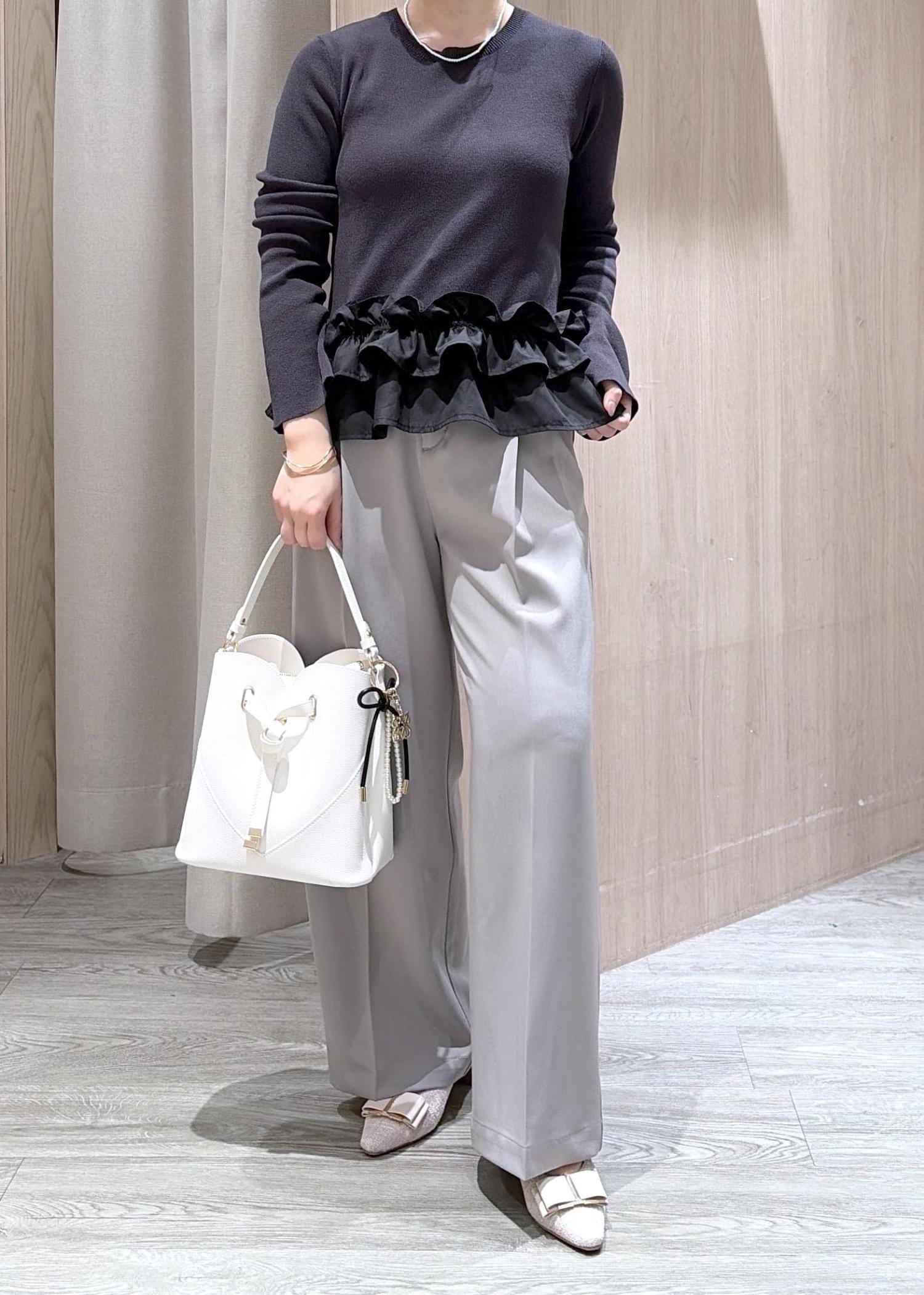 フリルのトップスは甘めで挑戦しずらい…という方はワイドパンツやジャケット合わせで甘さを抑えると着用しやすいですよ♡