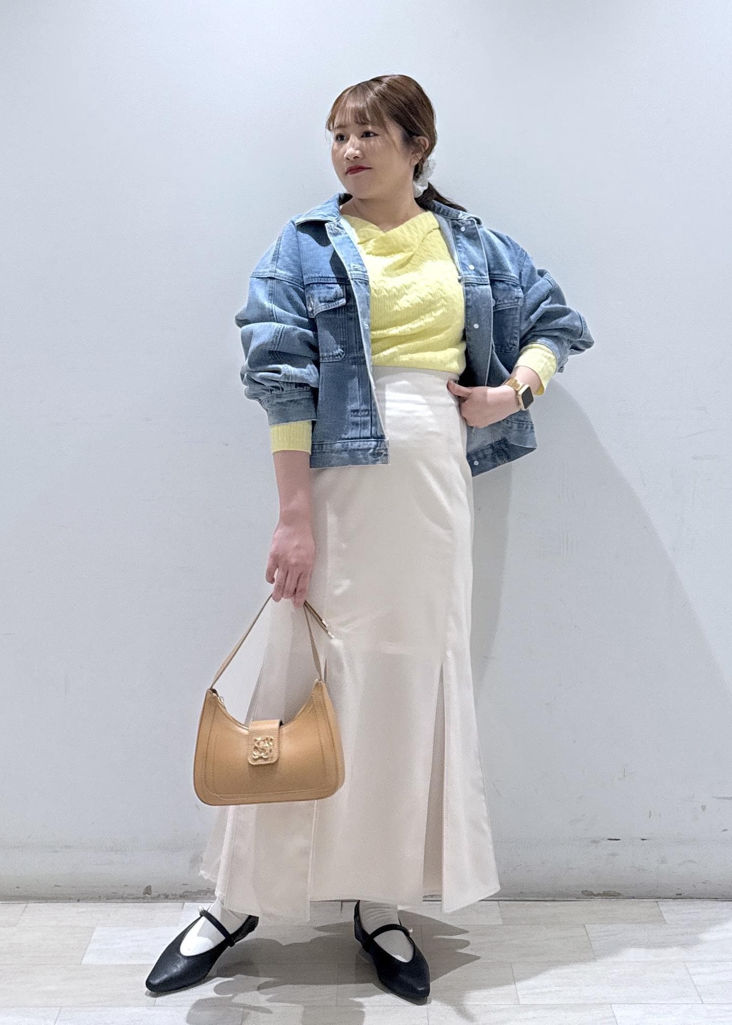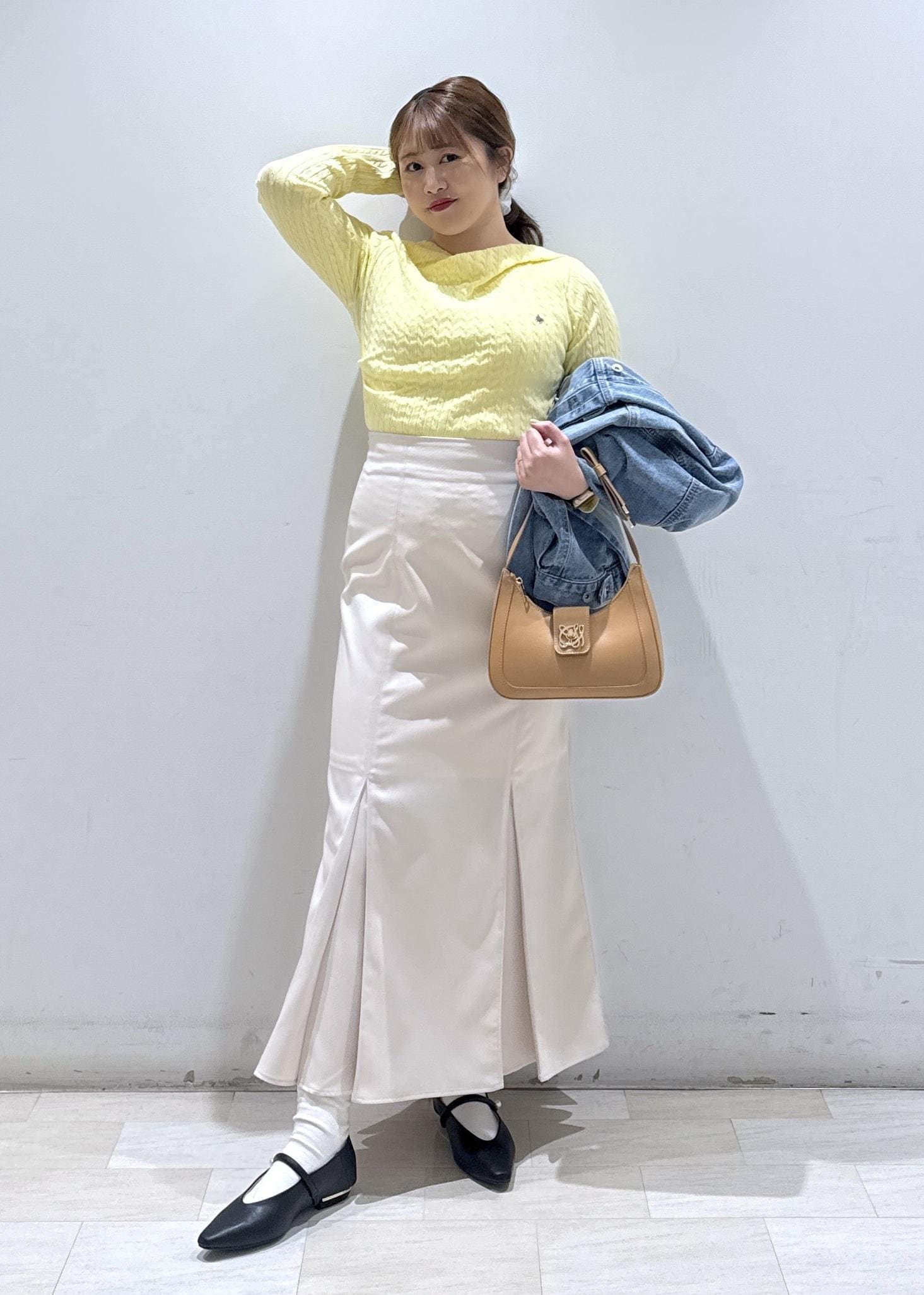今回は新作で入荷しました、VIS×POLOとのコラボアイテムのドレープデザインニットのトップスを着て綺麗めカジュアルなコーディネートにしてみました。春らしいイエローのカラーとデニムの相性が良く、顔色もパッと華やかにしてくれます。