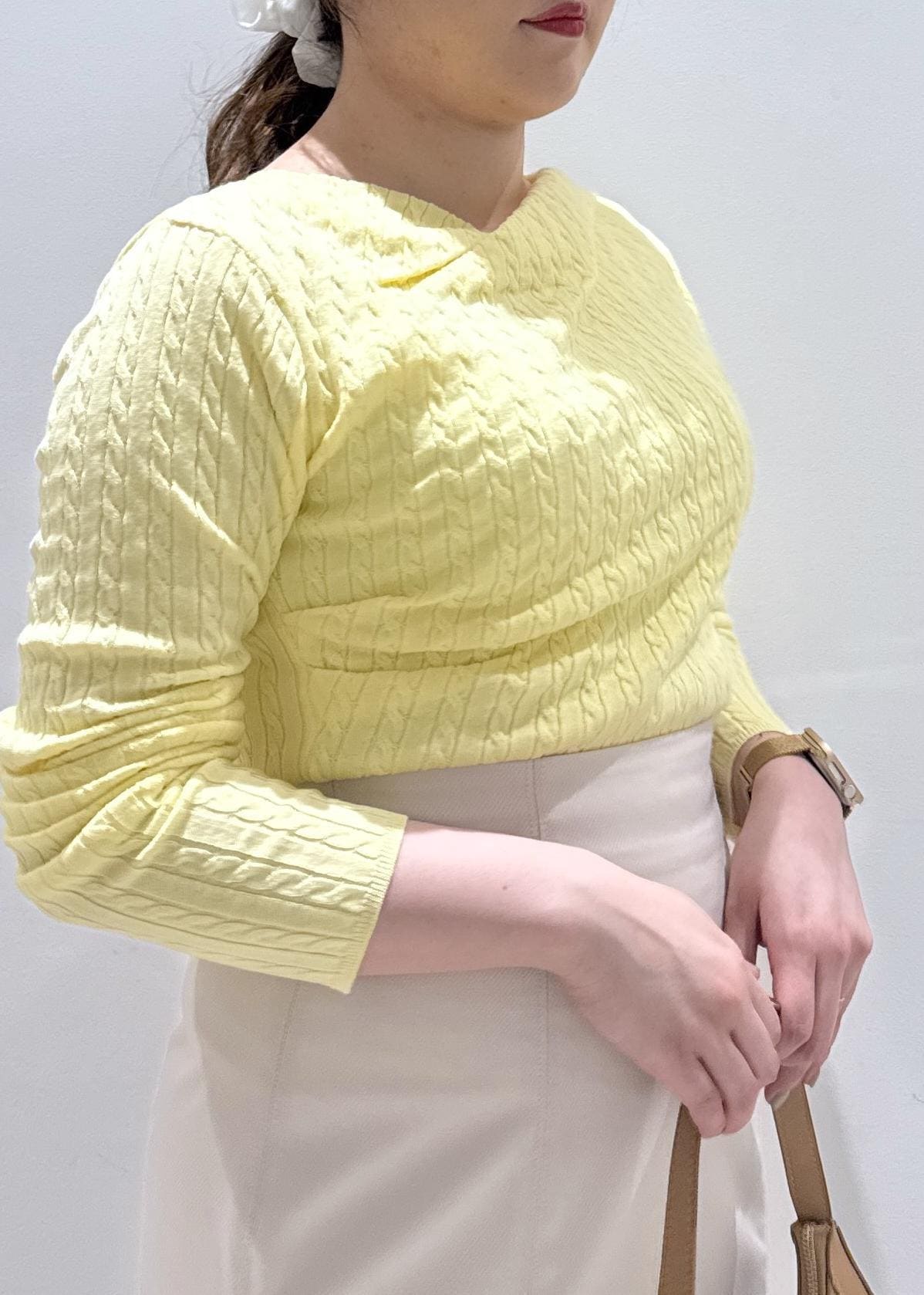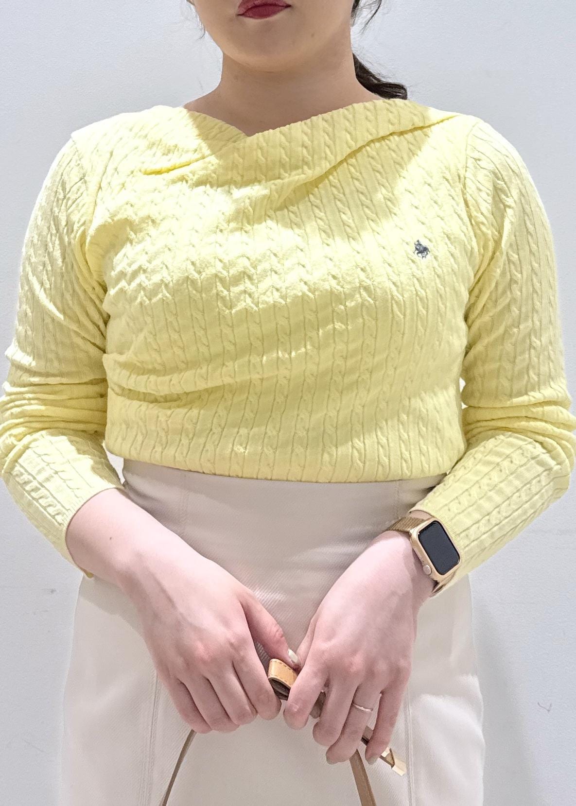NEW!VIS【POLO BCS】ケーブルドレープトップス/WEB限定カラーイエロー / F¥6,930レビューVIS×POLOのコラボアイテム⭐︎ケーブル柄のドレープデザインになって登場しました!生地感は見た目よりも分厚すぎずちょうど良い薄さで、今から春まで長く着れそうです。首元はデコルテラインが見えるぐらいの空きでした。2wayでオフショルとしても着用可能◎身長157cmで腰ぐらいの着丈なので、インしてもしなくてもどちらでも使えそうです。