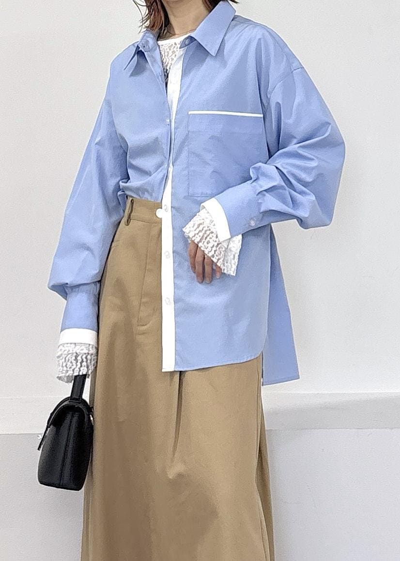 毎シーズン大人気のPOLO BCS | VISのアイテム♪今季はフレアスカートが登場で、程よいハリのあるシルエットが大人可愛い印象に♪春らしい爽やかなサックスのシャツ、レースインナーをレイヤードして、小物はブラックですっきりまとめました◎春のお出かけにぴったりな大人カジュアルコーデ。