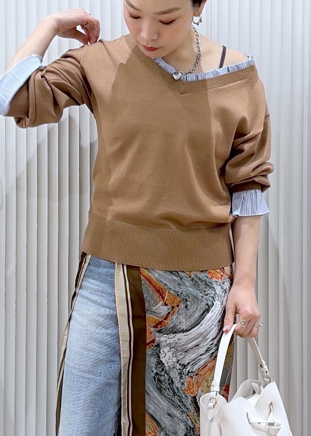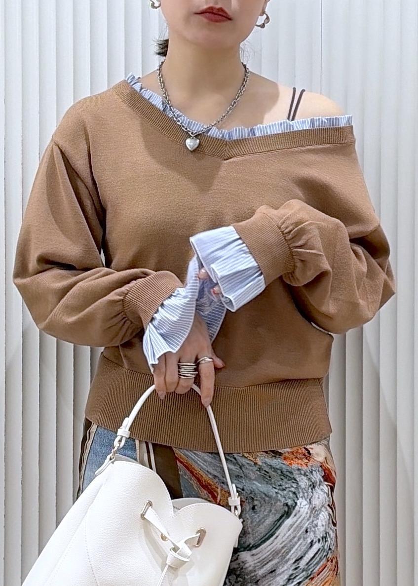 VISフリルドッキングニットプルオーバーブラウン系 / F¥5,489レビュー身幅は程よいゆとりがありますがオーバーサイズ過ぎないスッキリとした着心地。伸縮性のある薄手のニット生地でチクチク感の無い素材です。個人的に肩周りがしっかりしているのですが広めに開いた浅めのVネックが骨格に合っていました。オフショルのように着ても可愛いですし、ジャケットのインとしてキチンとインナーにも着回せます。