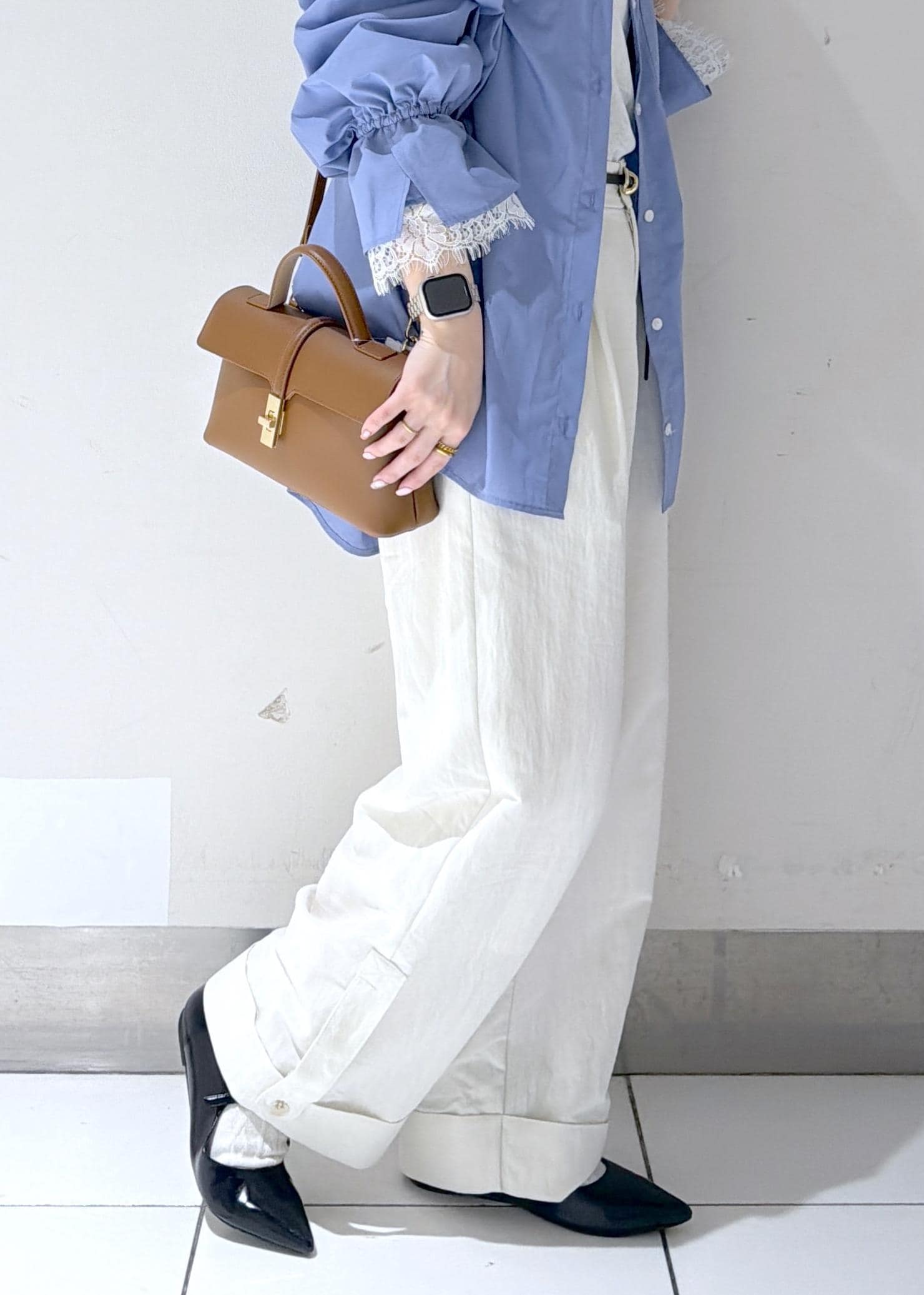 デコルテがちらっとみえて、袖も手が隠れるくらいの長めではありますが、くしゅっとしても可愛く女性らしいシルエットです
