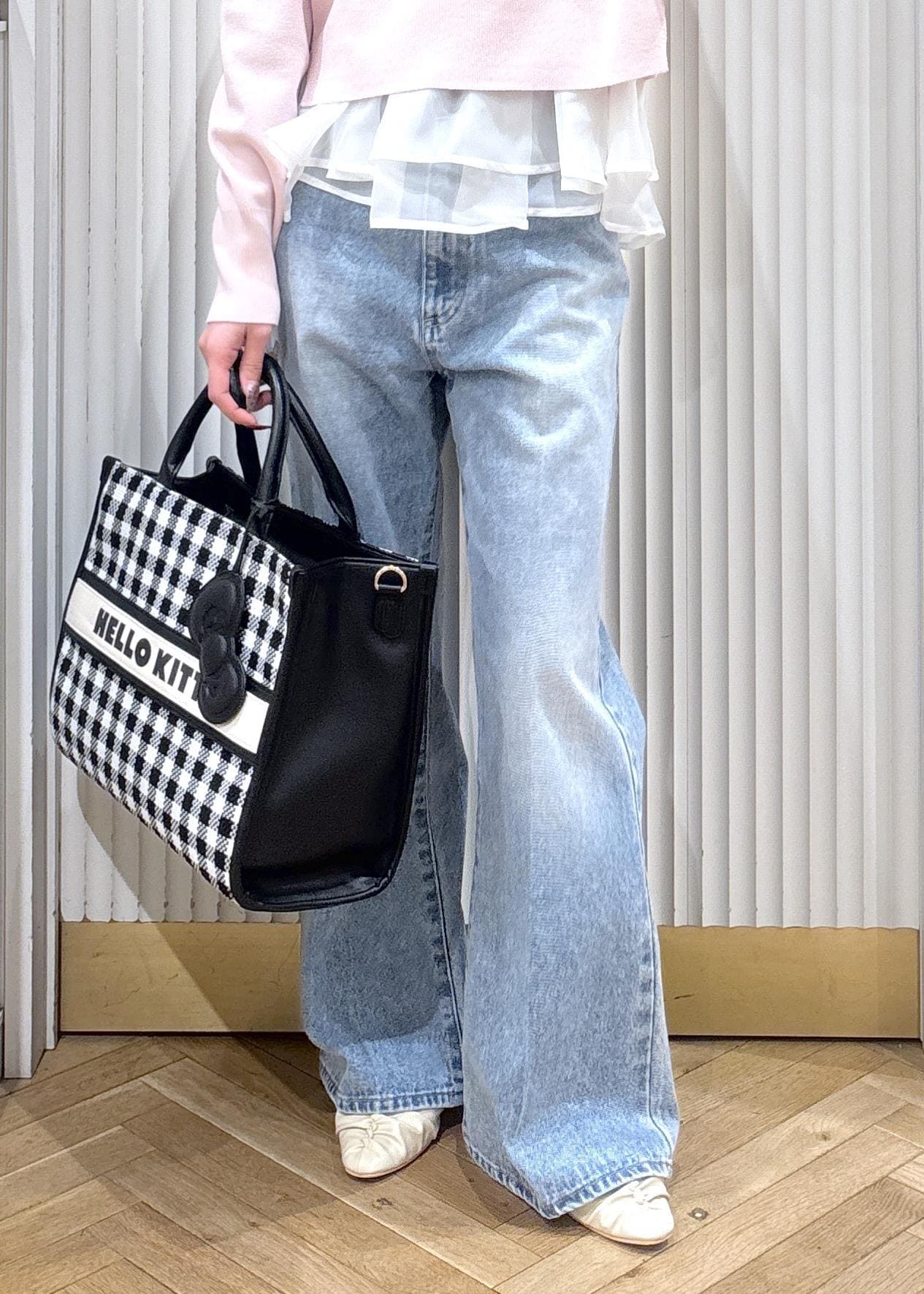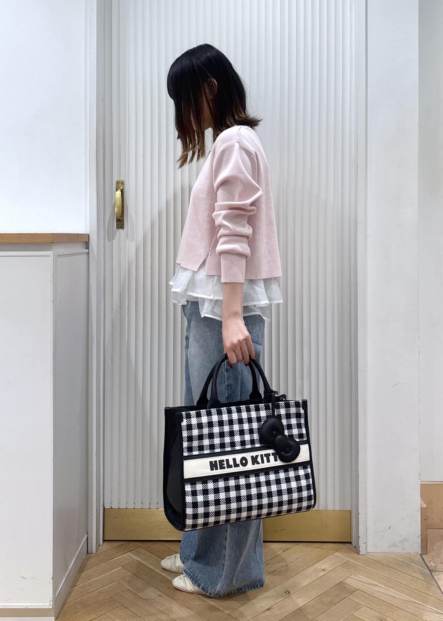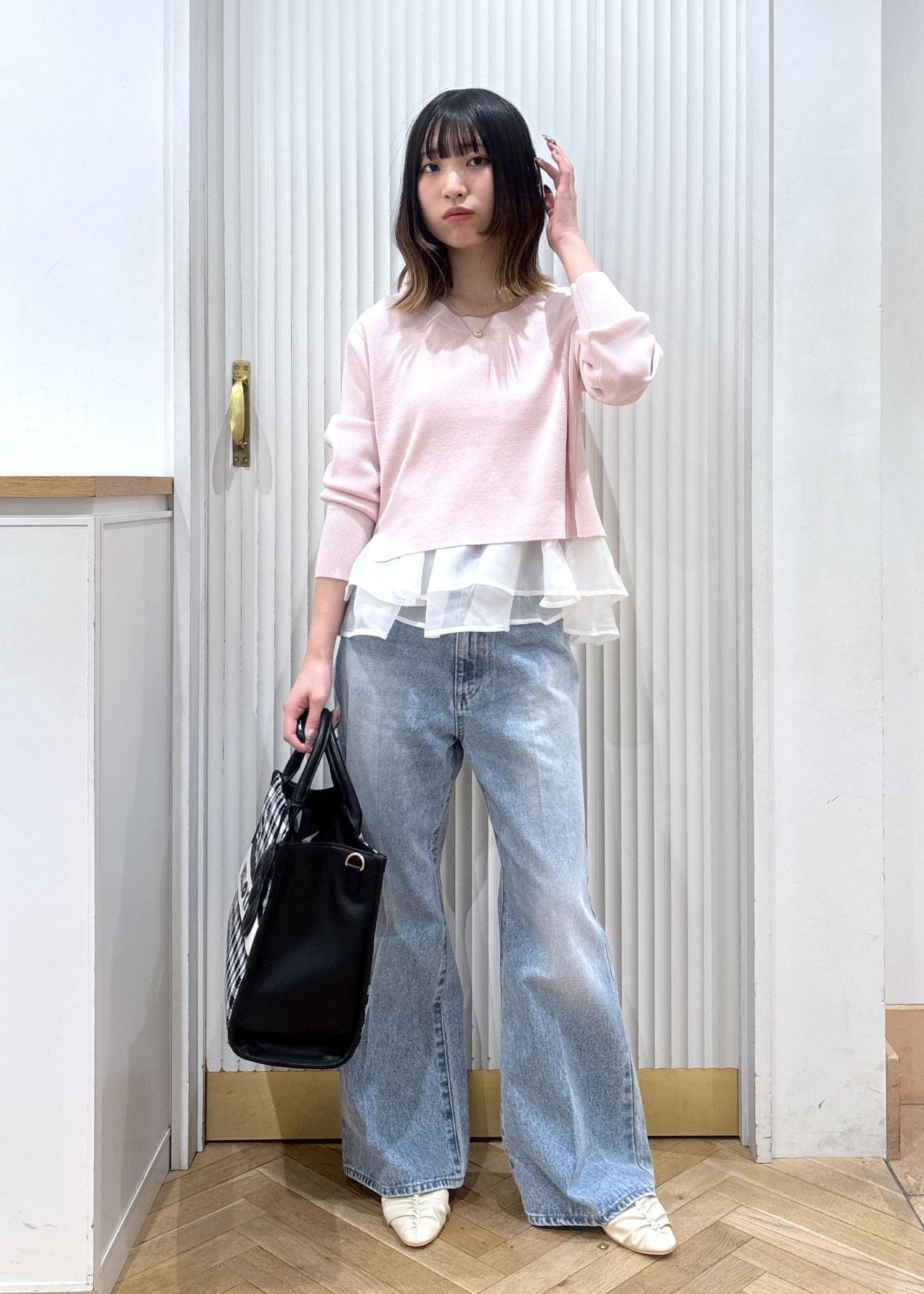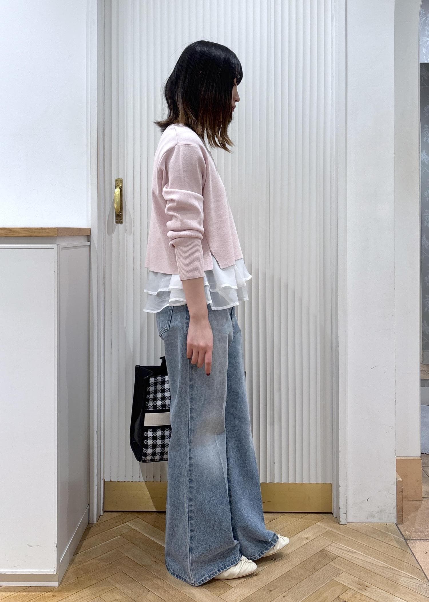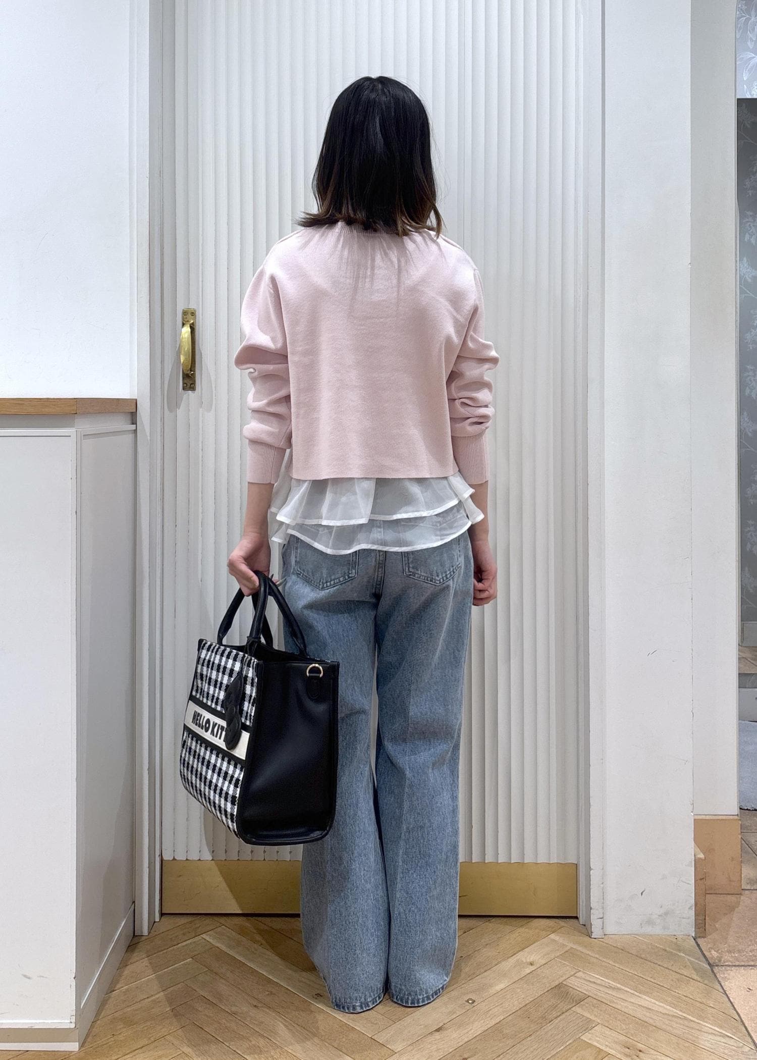 ピンクとデニムを合わせた安定可愛いカジュアルコーデです!バッグを白と黒のチェックにすることで重たさが和らぎ、靴も白にすることで春らしさもアップします!着丈が短めなので低身長さんでもバランスよく着れて、デニムはフレアを合わせることでよりスッキリ見えするのでスタイルアップして見えます!