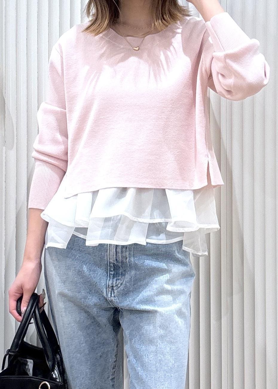 VIS【美得】ペプラムオーガンジードッキングニットプルオーバーピンク / F¥5,929レビュー153㎝着用でお腹周りが隠れる着丈です。短めの着丈なので低身長さんでもバランスよく着れます!裾のフリルが程よいボリューム感なので一枚できても着映えします!カジュアルでも綺麗目でも合わせやすいデザインなので着回しもしやすいです!
