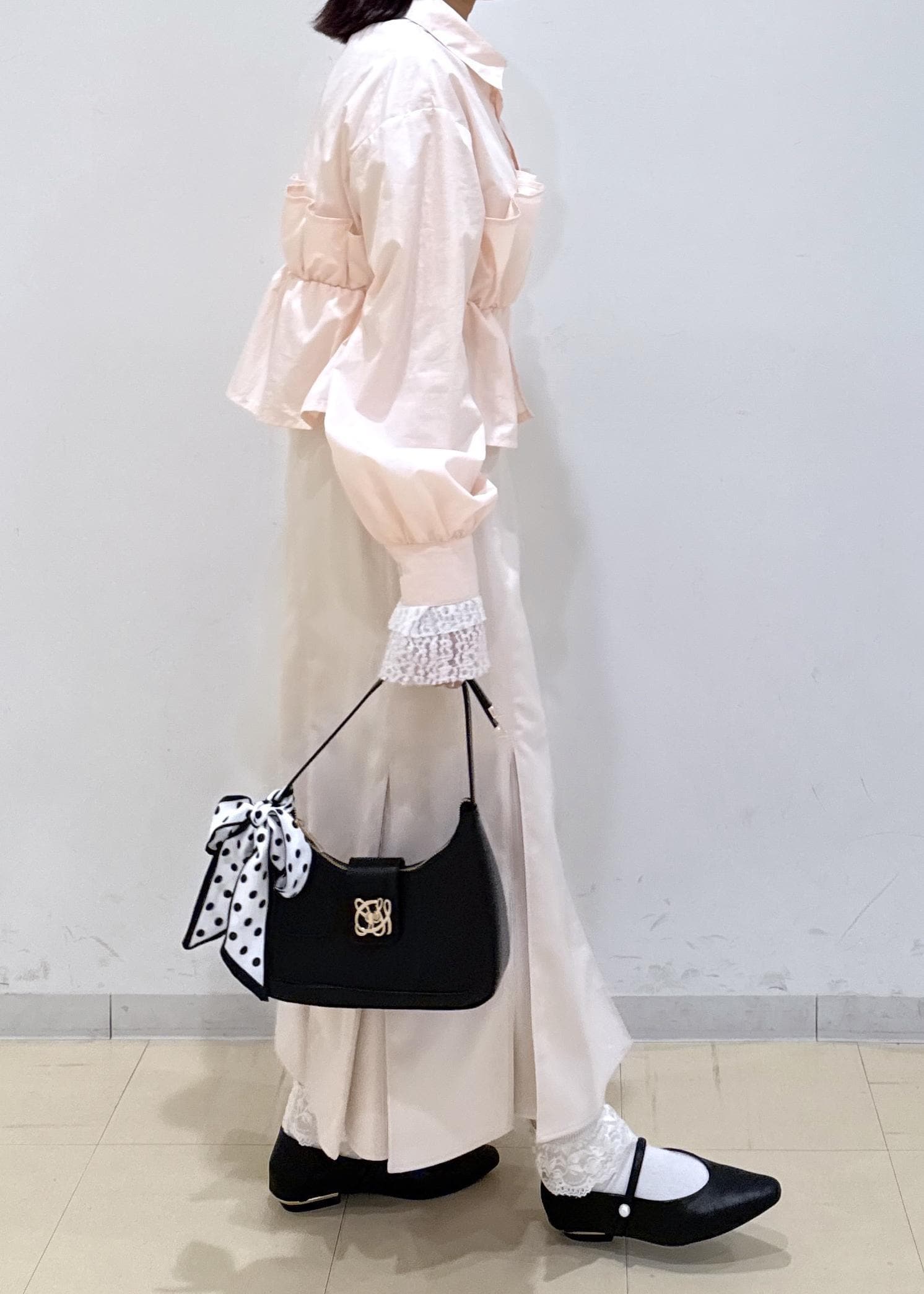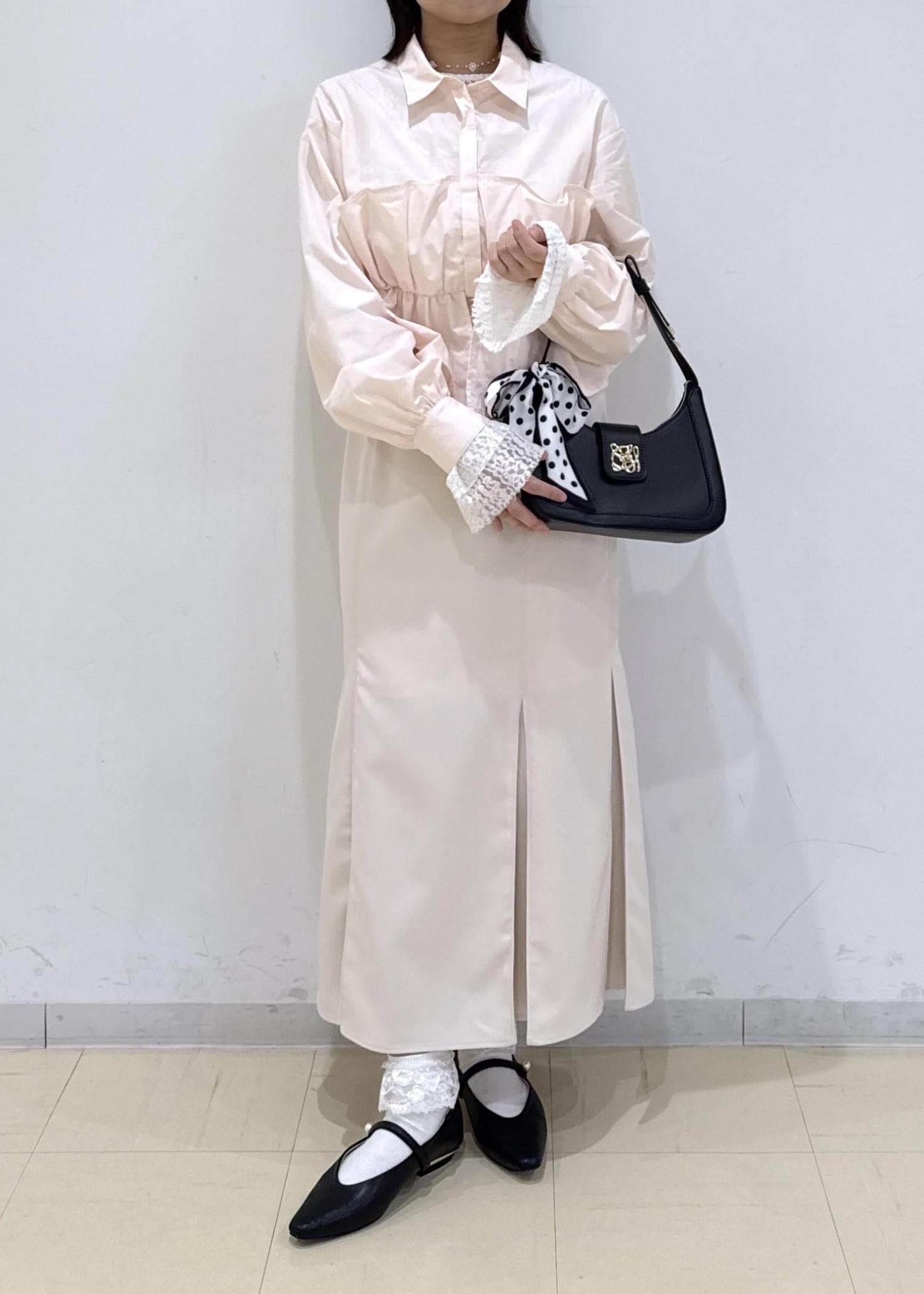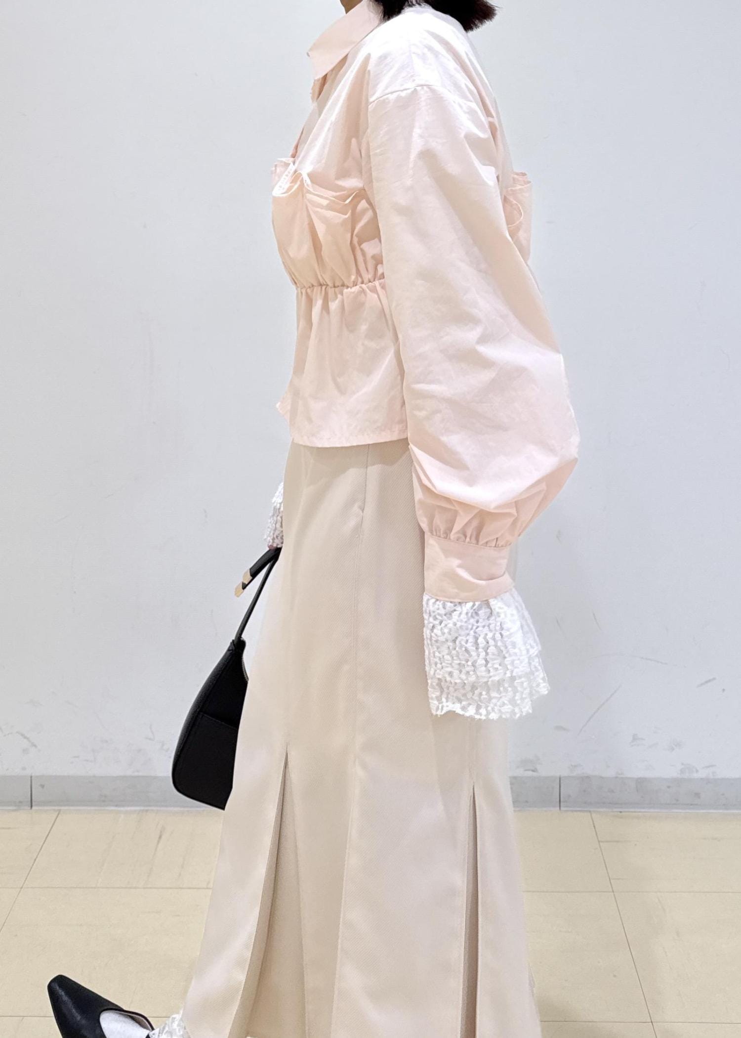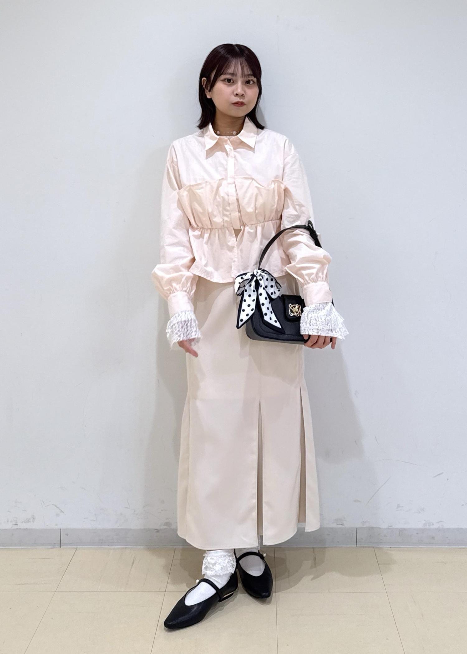 ピンクのシャツに白のスカートを合わせた淡いコーディネートにしました♬