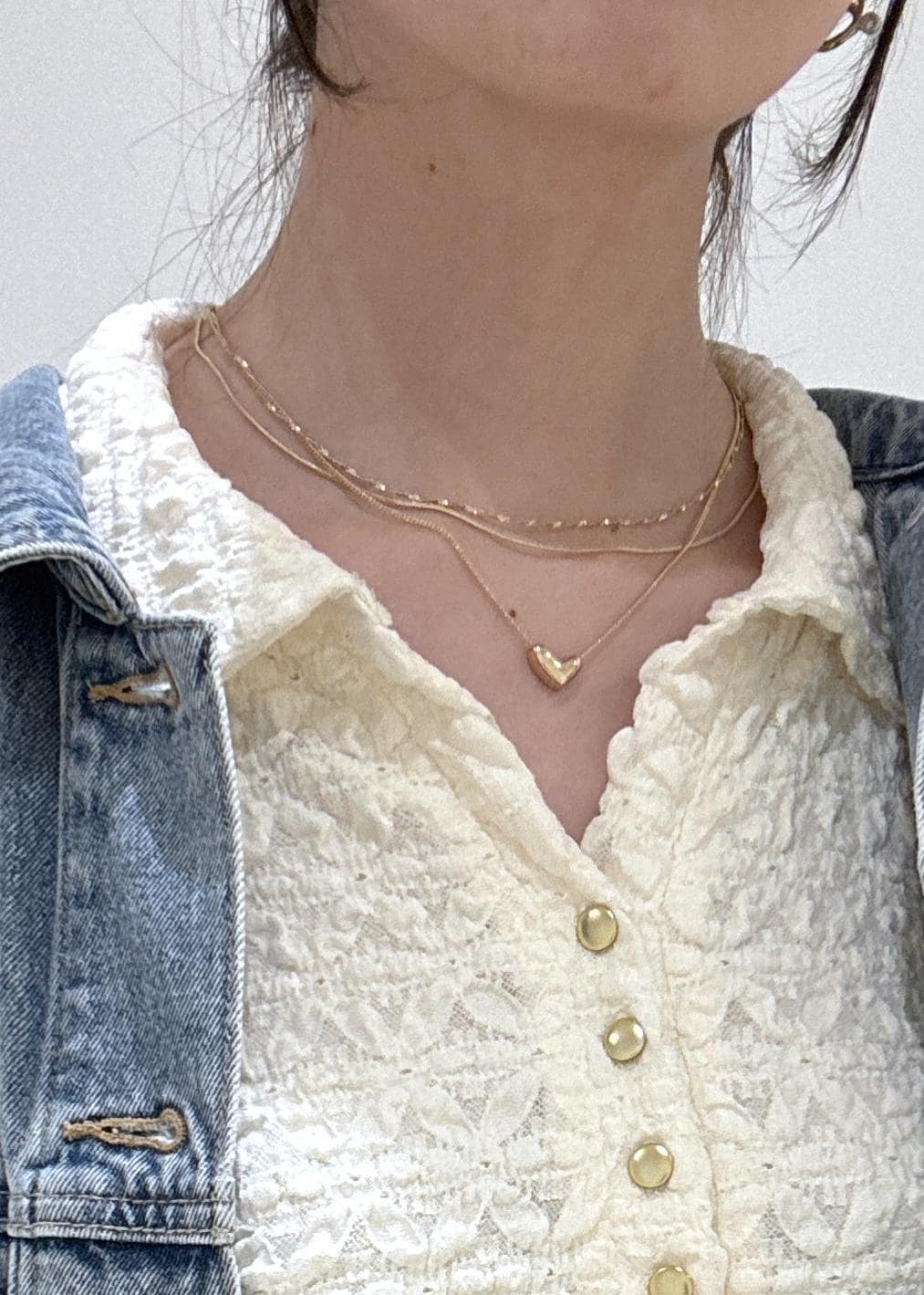 VISハートレイヤードネックレスゴールド / F¥2,629レビュー細めのチェーンで華奢見えします。ニュアンスハートが大人可愛く、顔まわりを華やかにしてくれます。