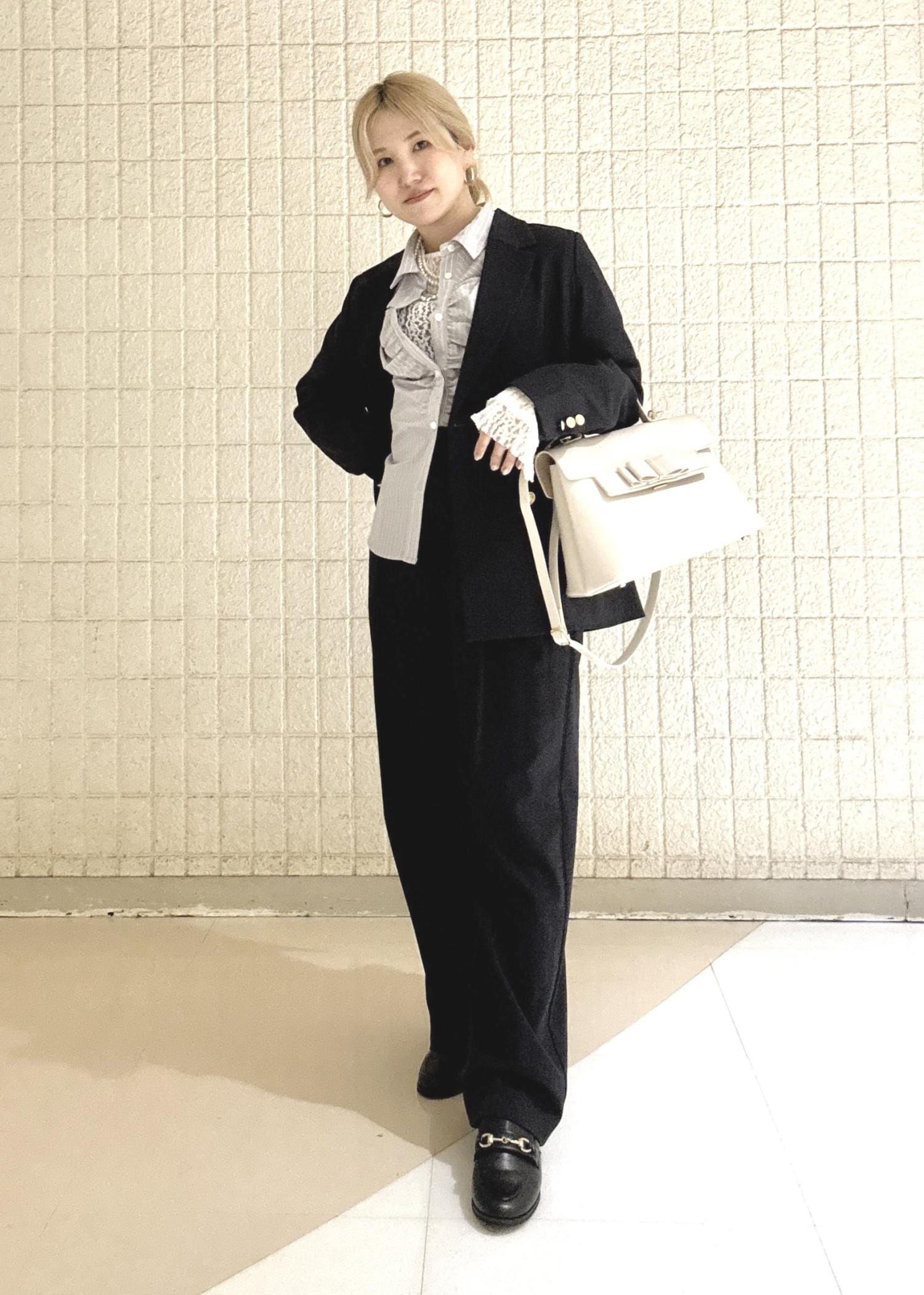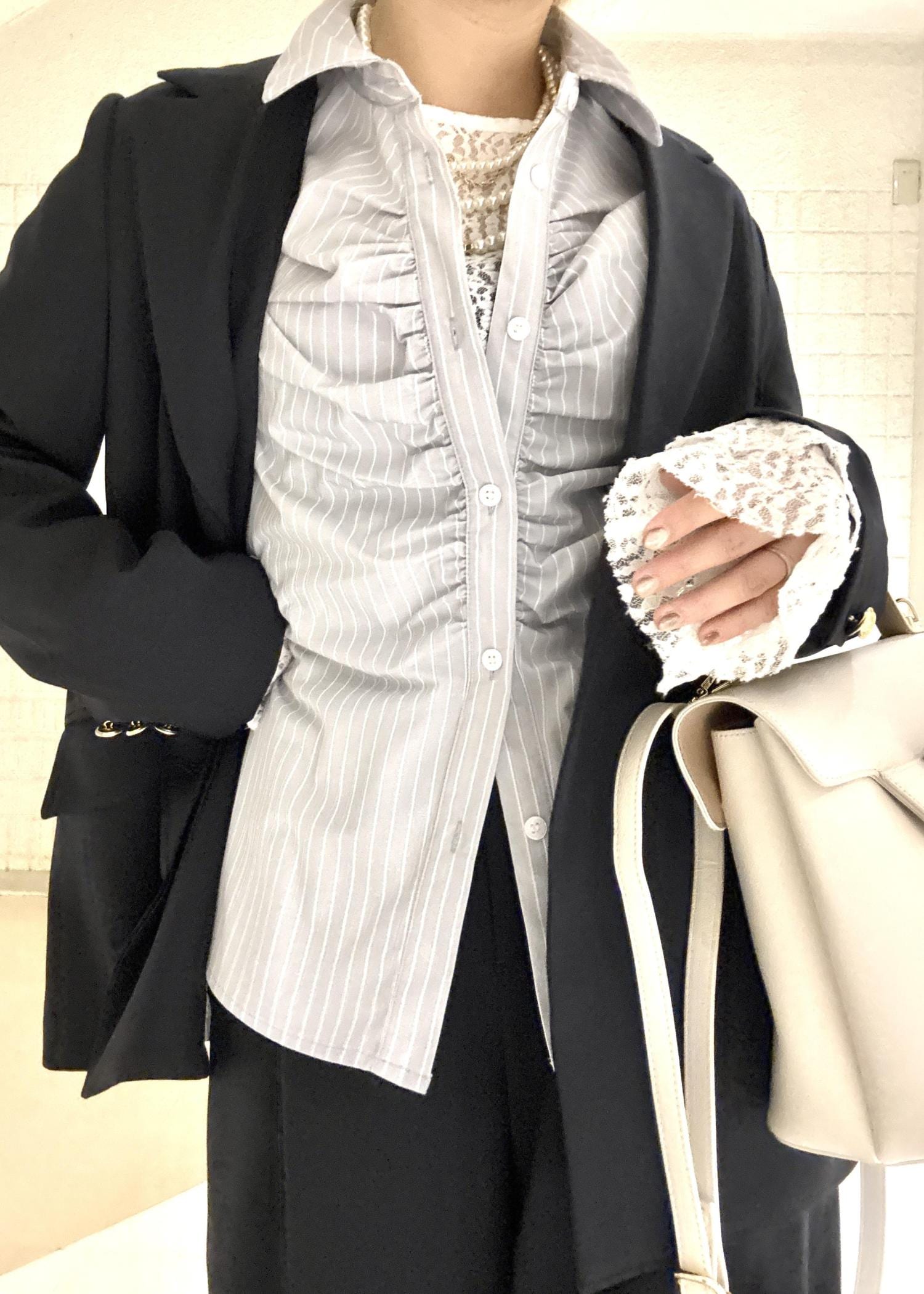かっこよさの中にパールのネックレスやレースインナーなど