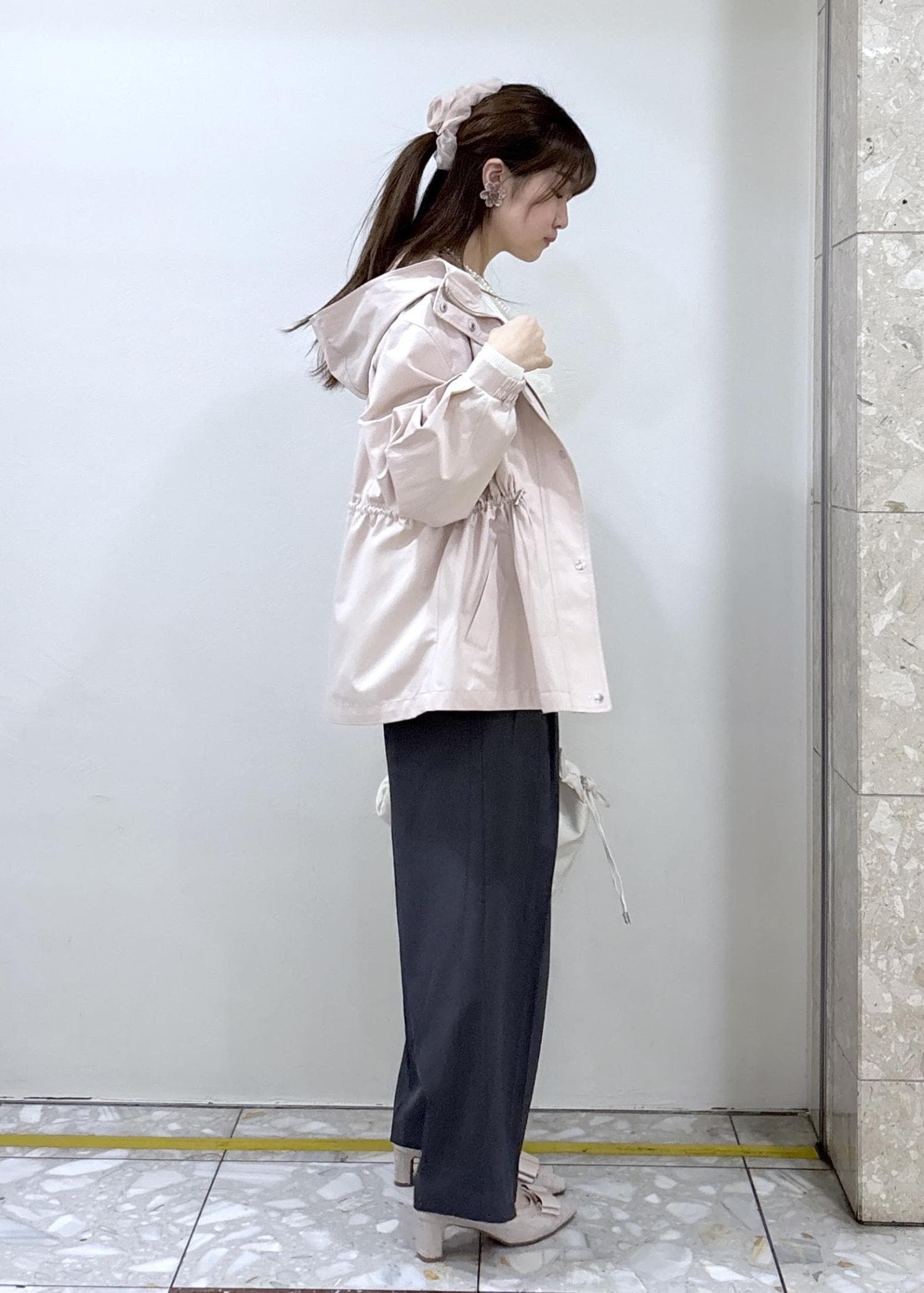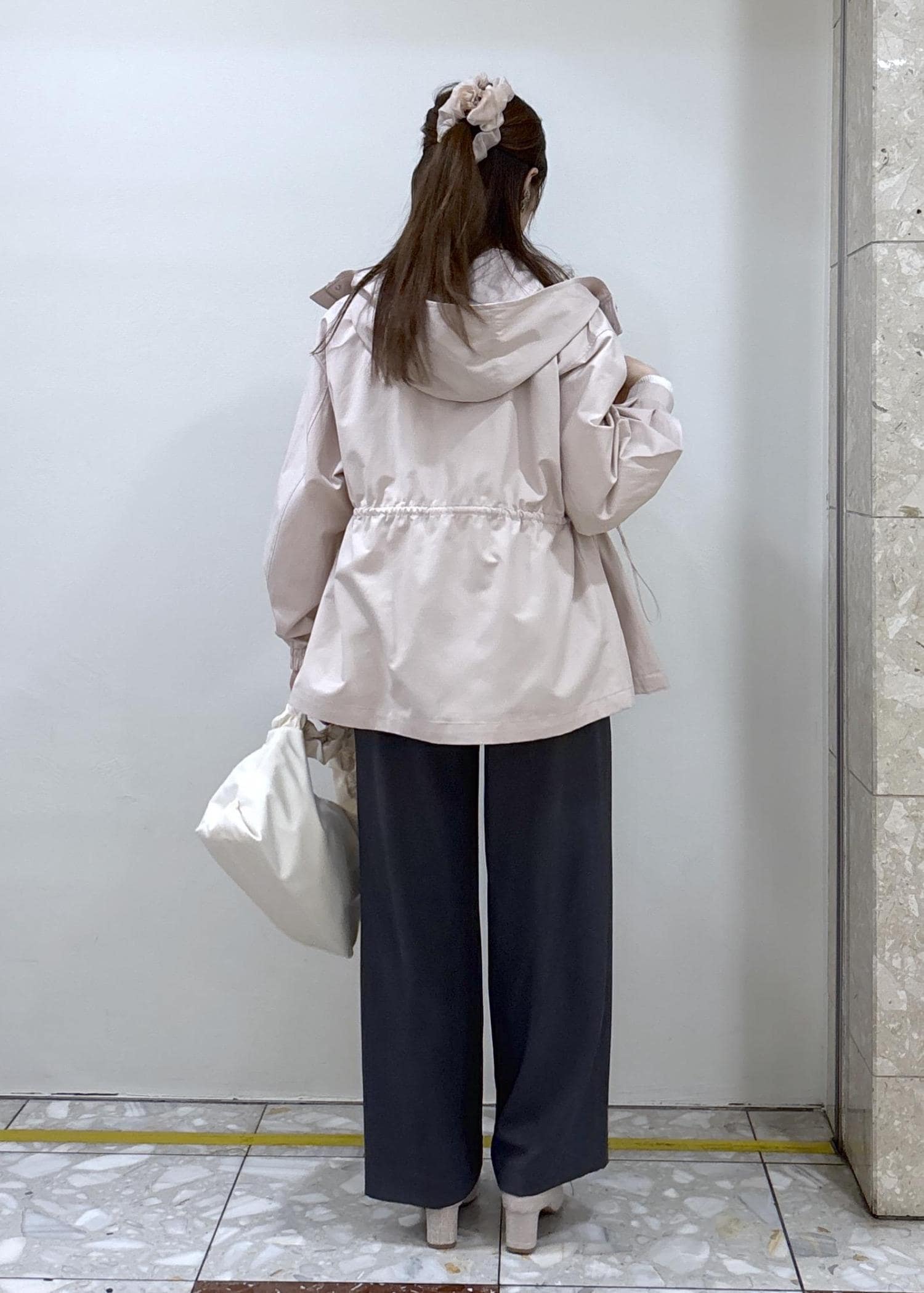 ウエストに絞りが付いているのでその日のお洋服に合わせて形を変えられるので、カジュアル過ぎず、きれいめのコーデにも馴染みます¨̮⃝ -